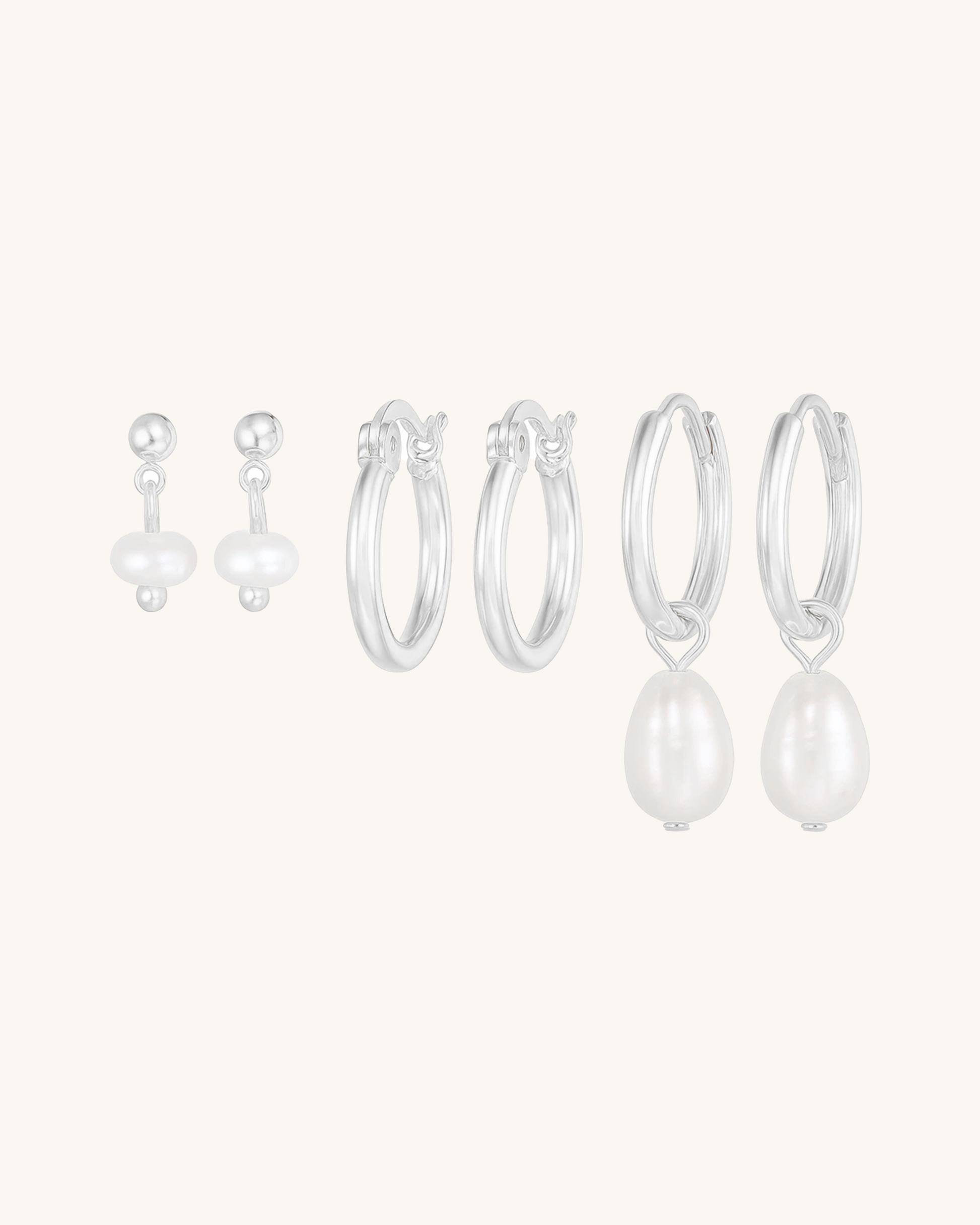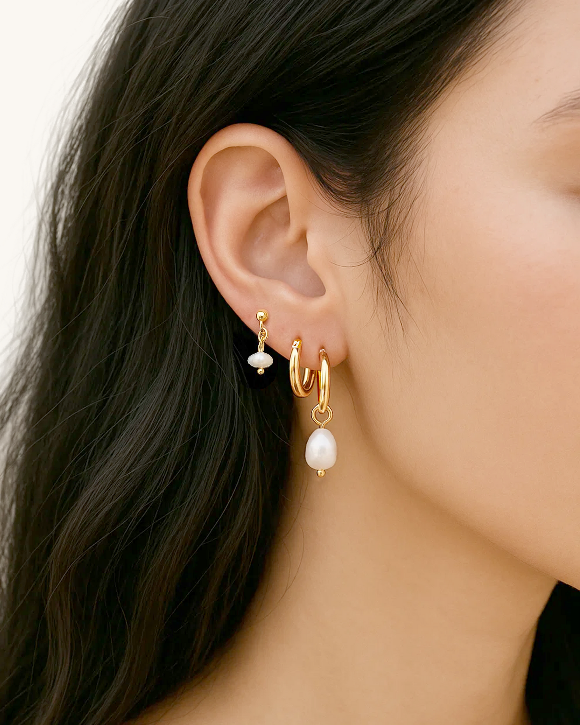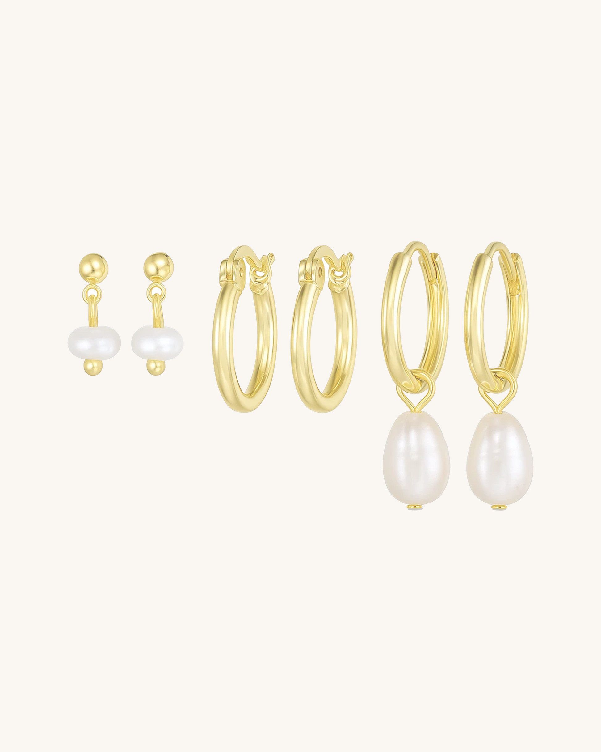 This effortlessly elegant trio of earrings combines minimal gold-tone hoops with classic pearl drops for a modern asymmetrical statement. Featuring a dainty stud, a sleek hoop, and a bold dangling pearl, the set adds charm and fluidity to any ear stack. Whether worn together or individually, these pieces elevate both casual and formal looks.