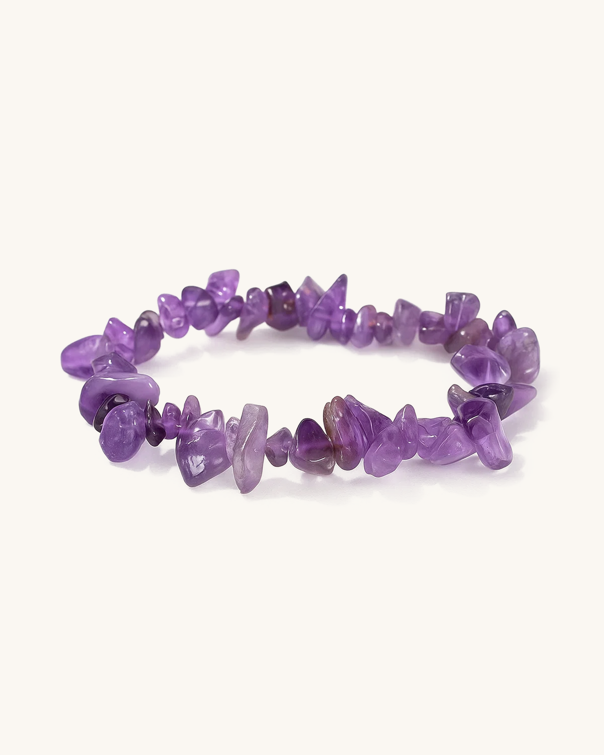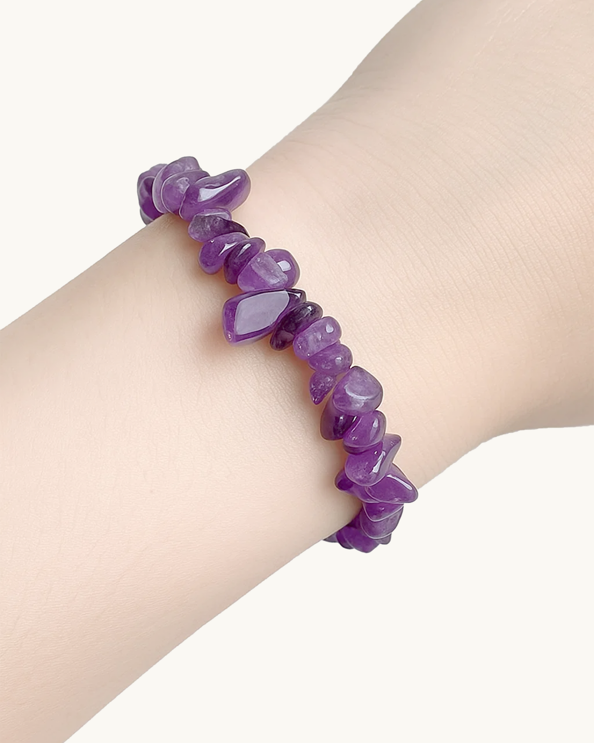 Glowing in rich violet tones, the Amethyst Bracelet is a cherished stone of healing, spiritual clarity, and detoxification. Known for its calming energy, amethyst supports stress relief, inner peace, and emotional balance. Crafted from natural chip beads ranging from 5–8mm, this bracelet is perfect for those seeking tranquility and connection with their higher self.