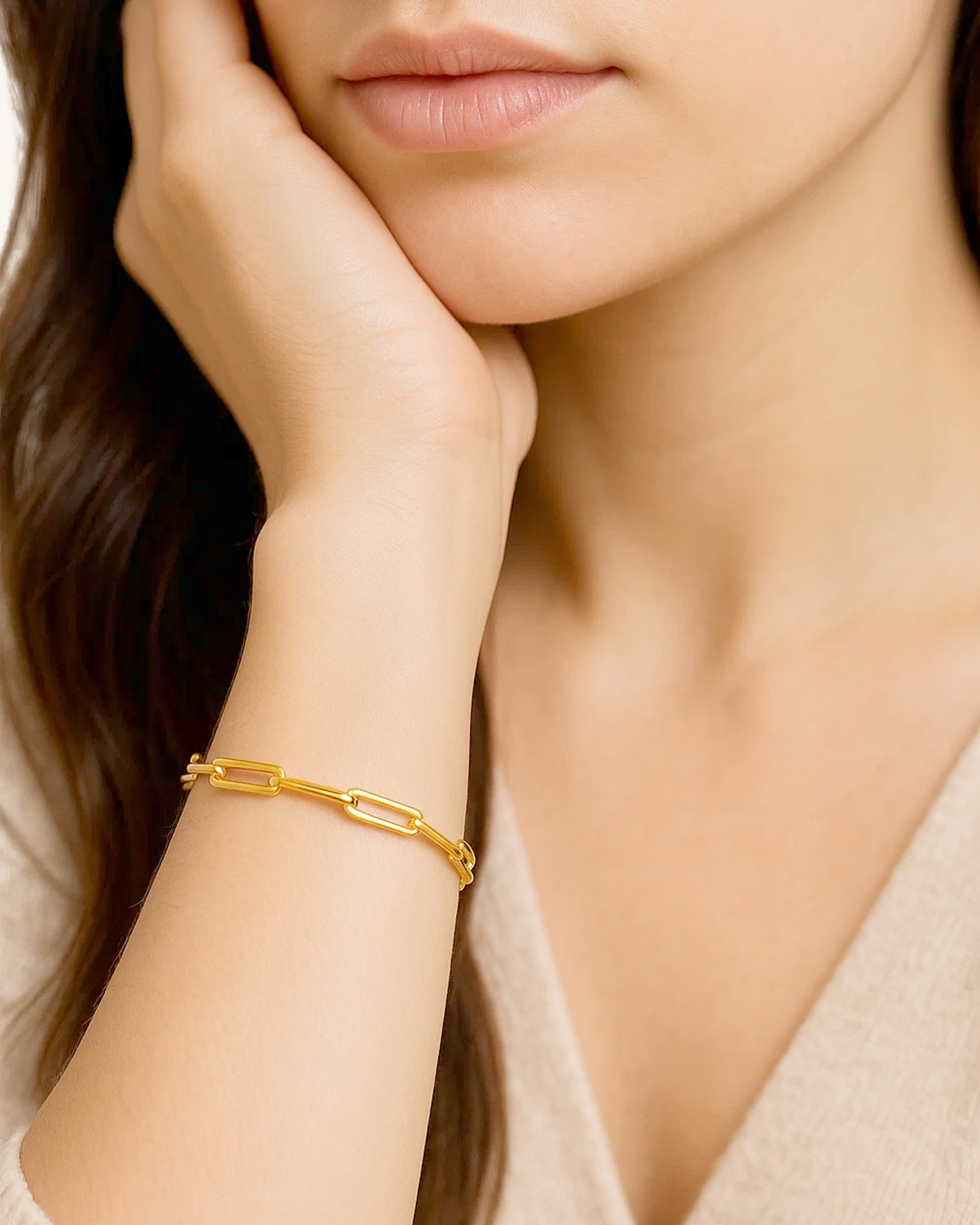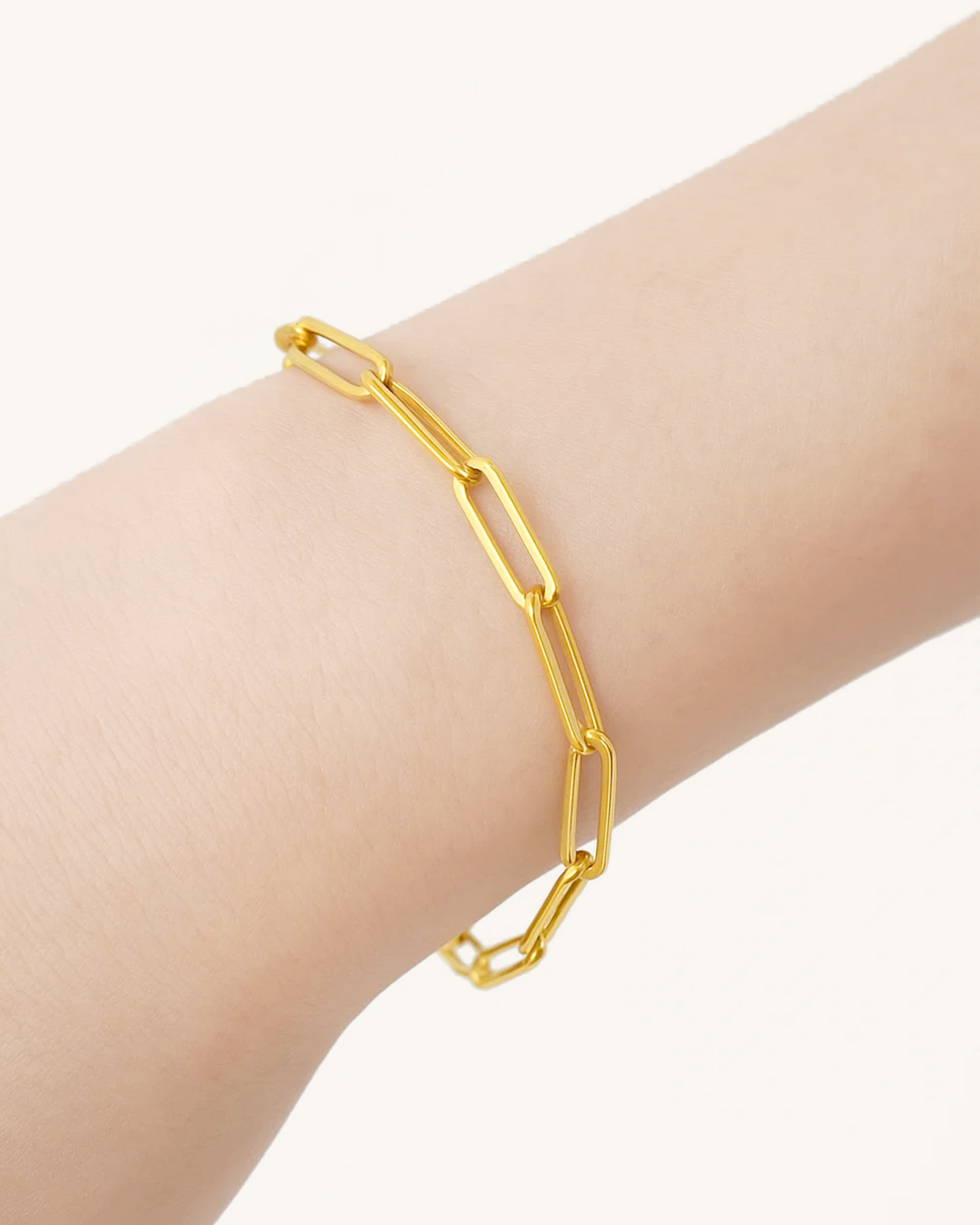 Minimal and sleek, the Bar Chain Bracelet features an elongated vertical pendant suspended from a bold rectangular-link chain. Crafted from waterproof stainless steel and available in 14K gold or silver tone, this piece brings everyday edge and effortless polish—perfect for layering or wearing solo with a modern touch.