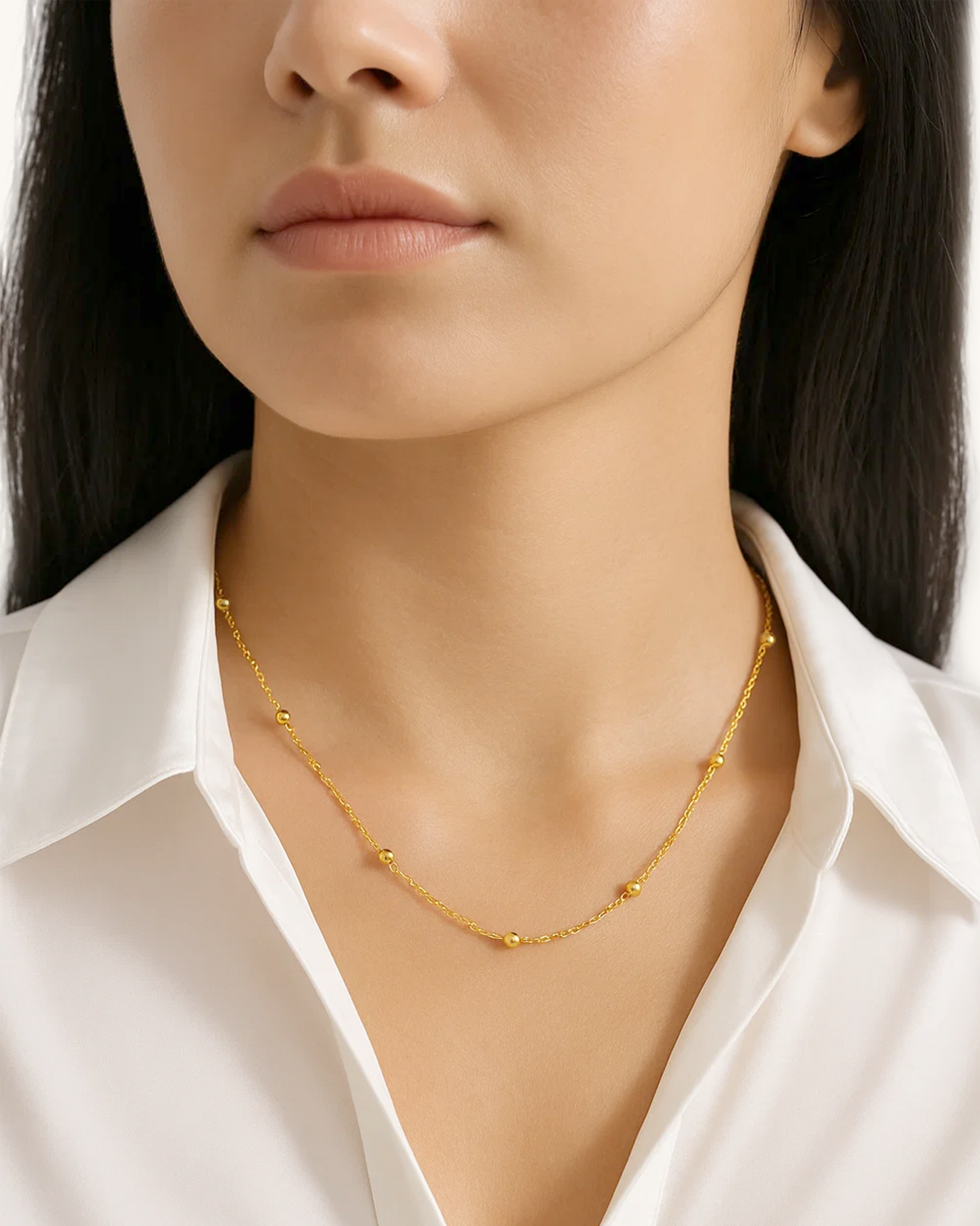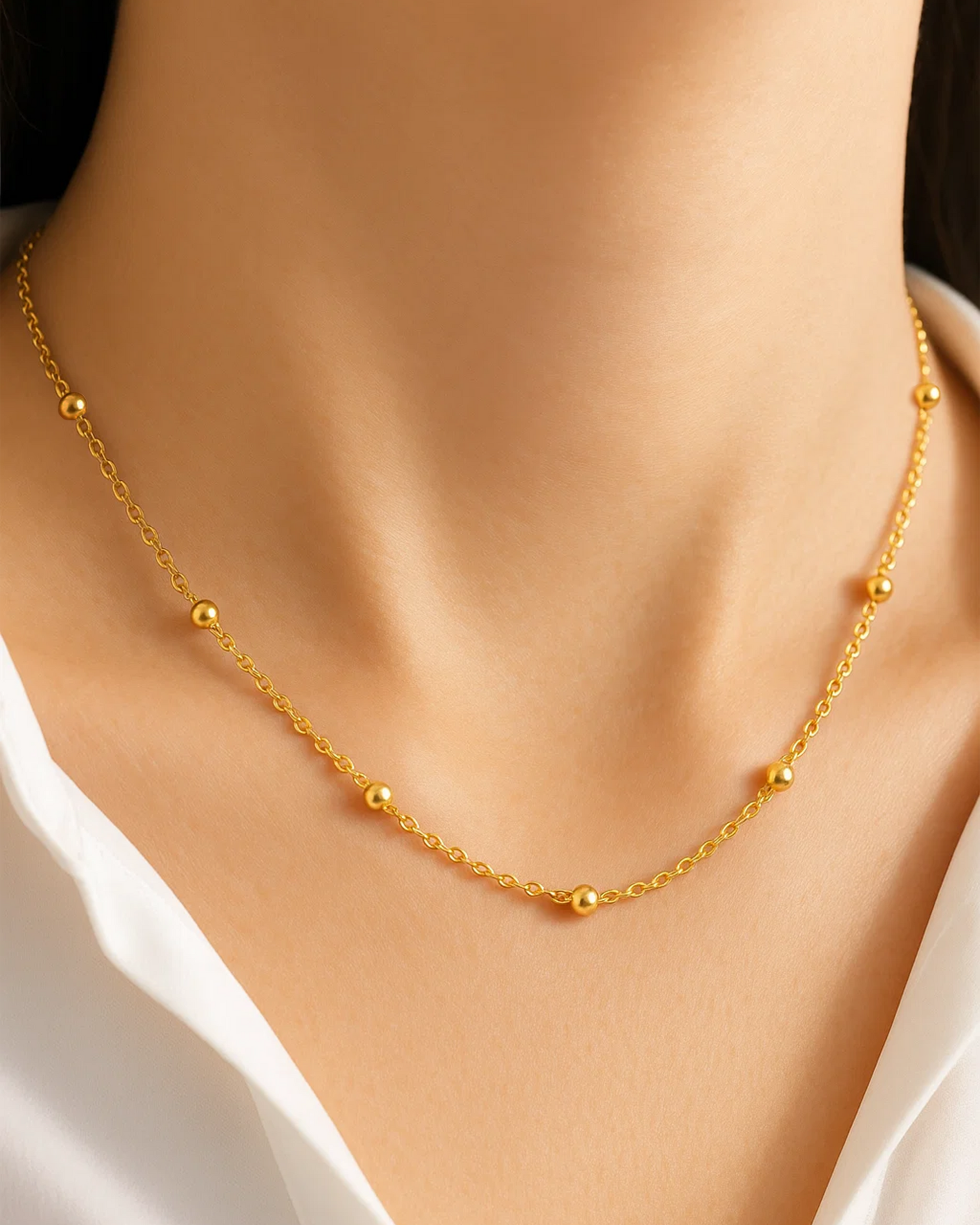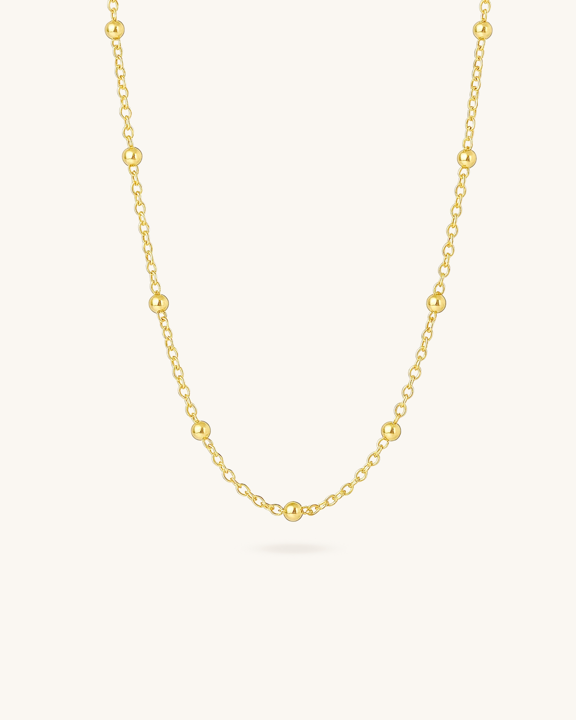 Clean and versatile, the Beaded Dot Chain Necklace features a delicate chain adorned with polished round bead accents spaced evenly for a refined touch of texture. Crafted from waterproof stainless steel and available in 18K gold or silver finish, this necklace is ideal for layering or wearing solo as a timeless essential.