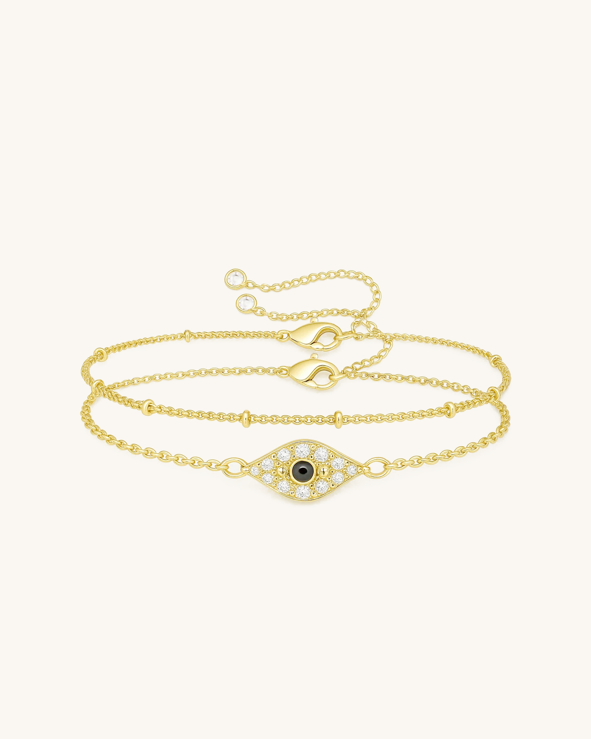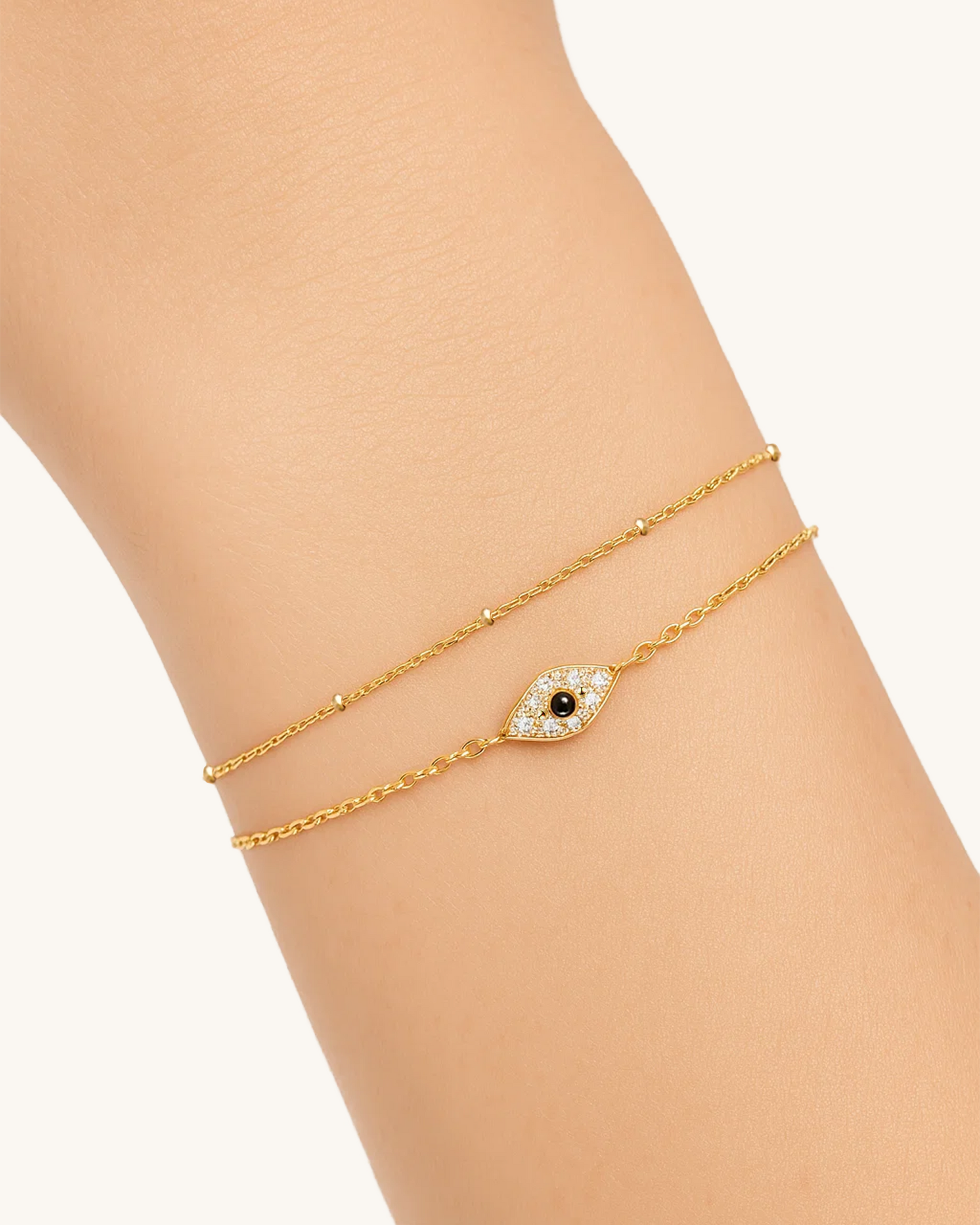 Protective and stylish, the Black Eye Bracelet features a pavé-set teardrop-shaped eye charm centered with a black stone—an ancient symbol of warding off negativity. The layered dual-chain design adds depth and elegance, while waterproof stainless steel ensures long-lasting shine. Finished in your choice of 18K gold or silver plating, it's the perfect everyday amulet.