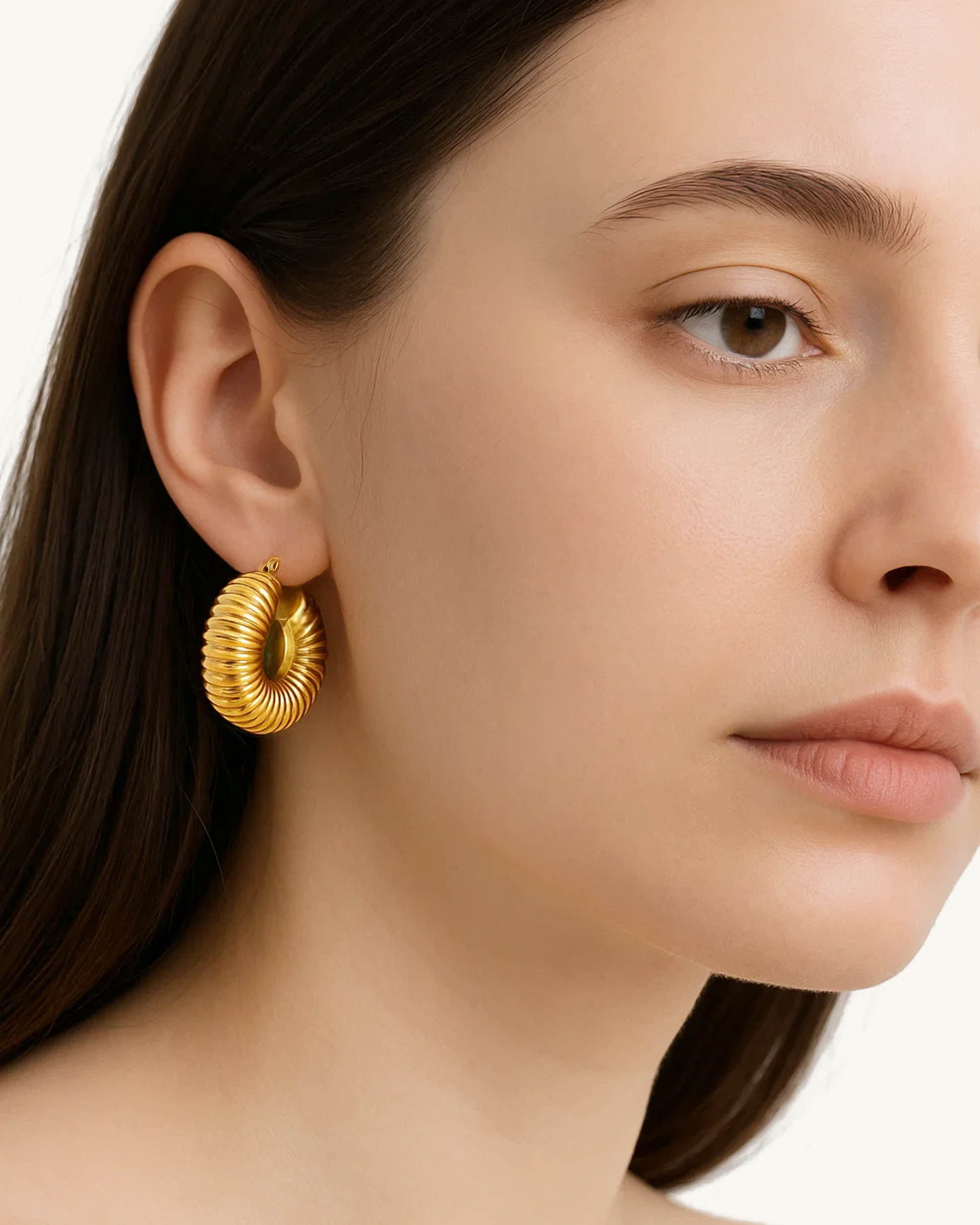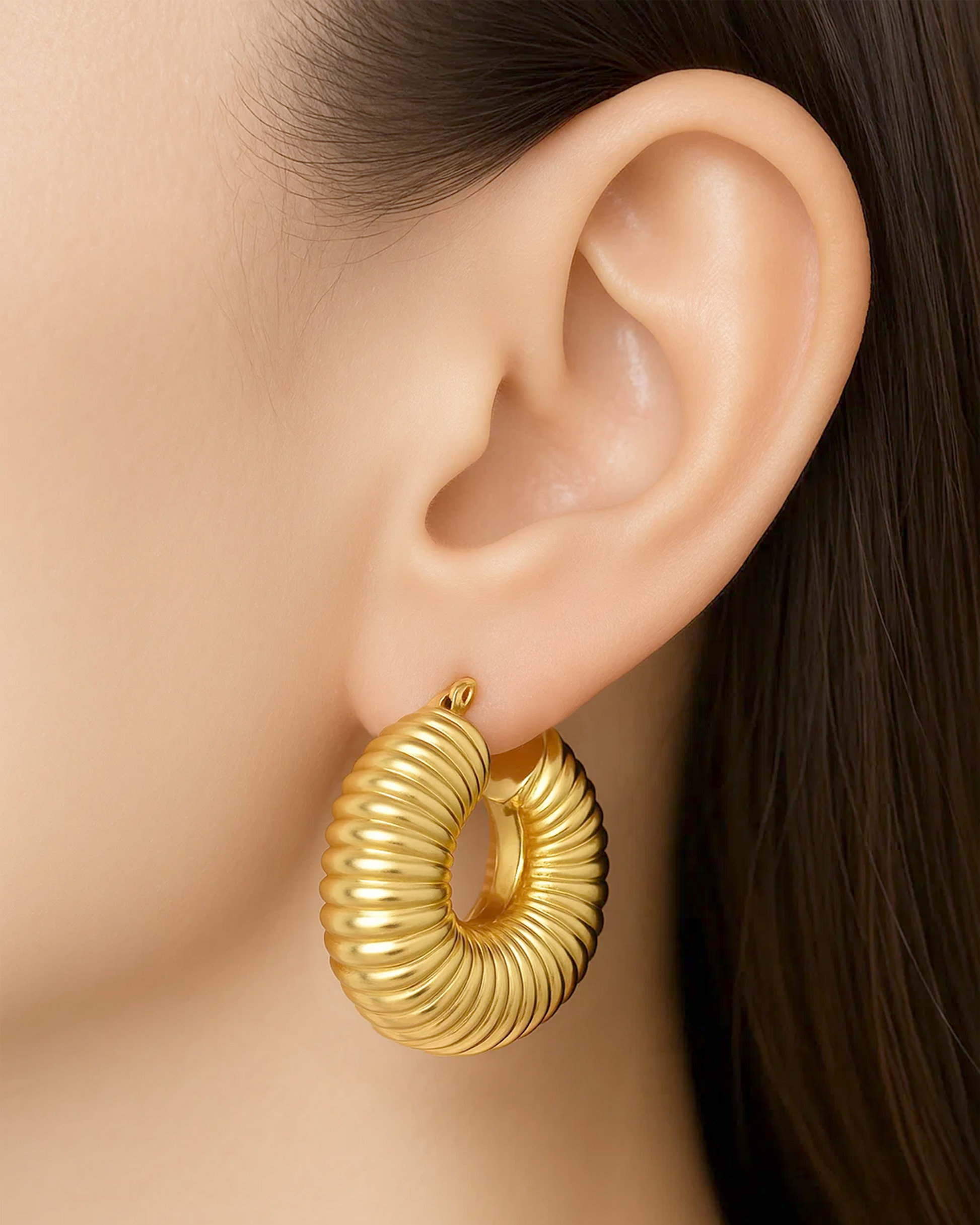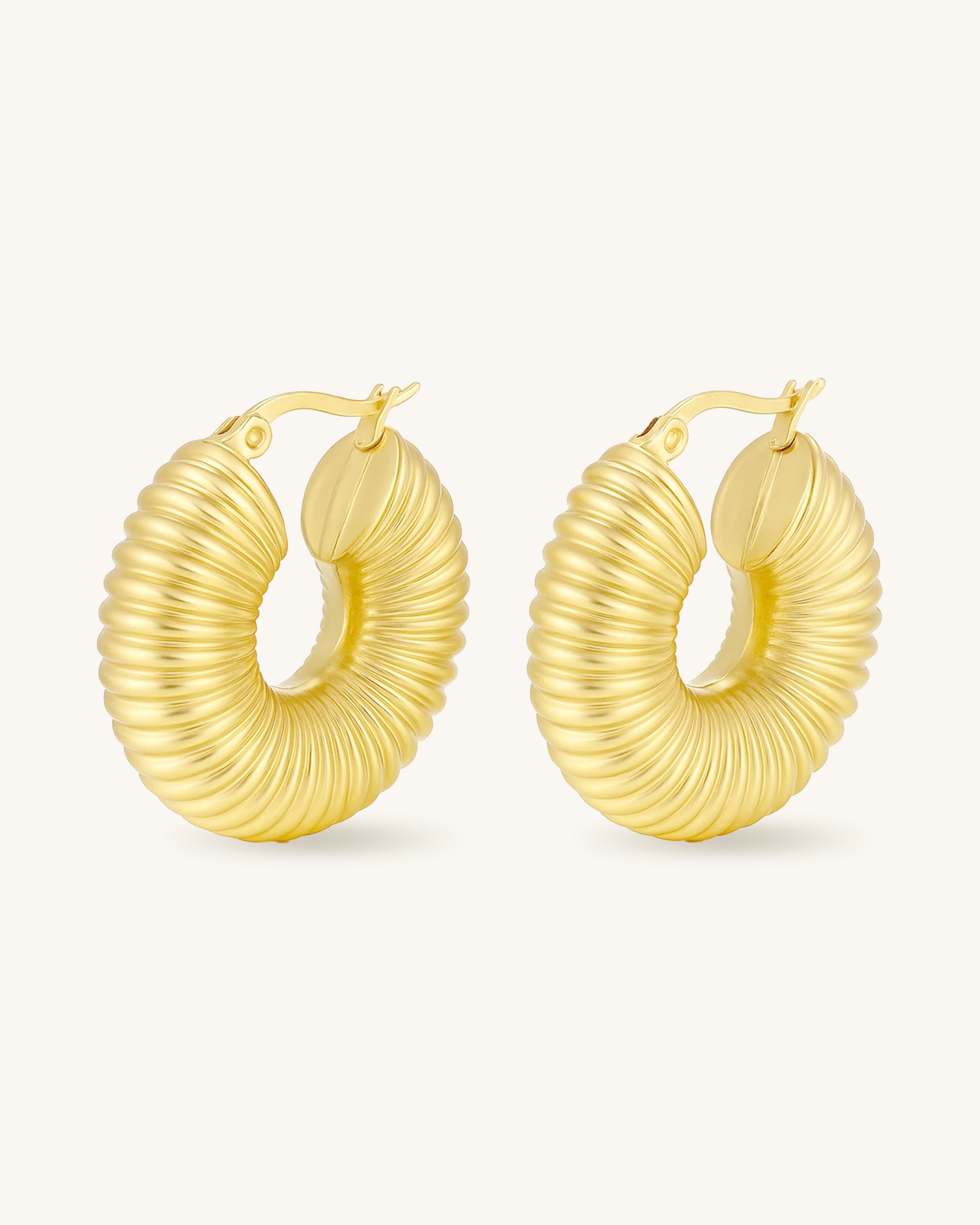 Make a bold statement with the Bold Ribbed Hoop Earrings, featuring a sculptural ribbed texture in a voluminous crescent silhouette. Crafted from waterproof stainless steel and plated in rich 18K gold, these hoops bring vintage glamour and modern edge to your jewelry rotation—perfect for spotlight moments or elevating everyday looks.