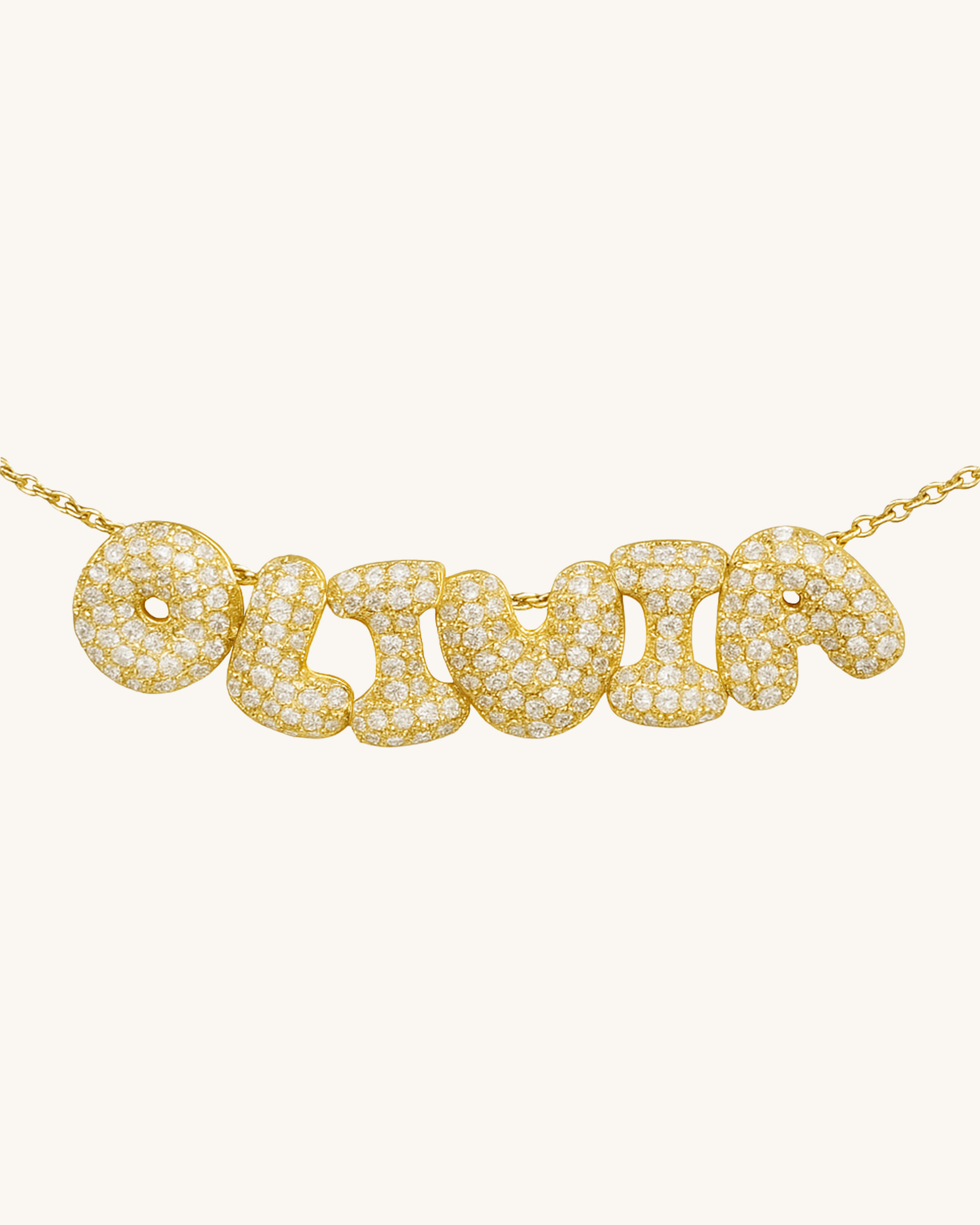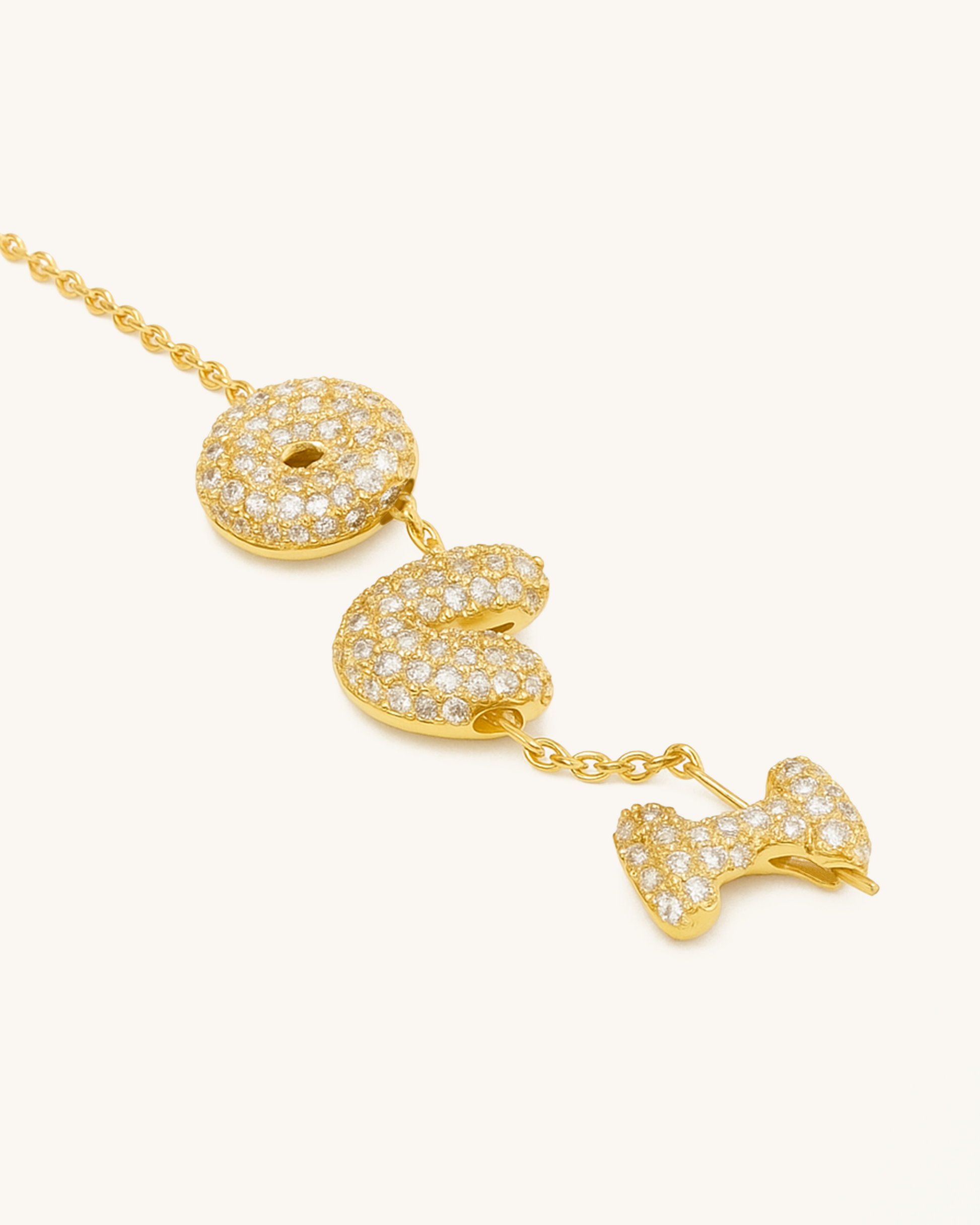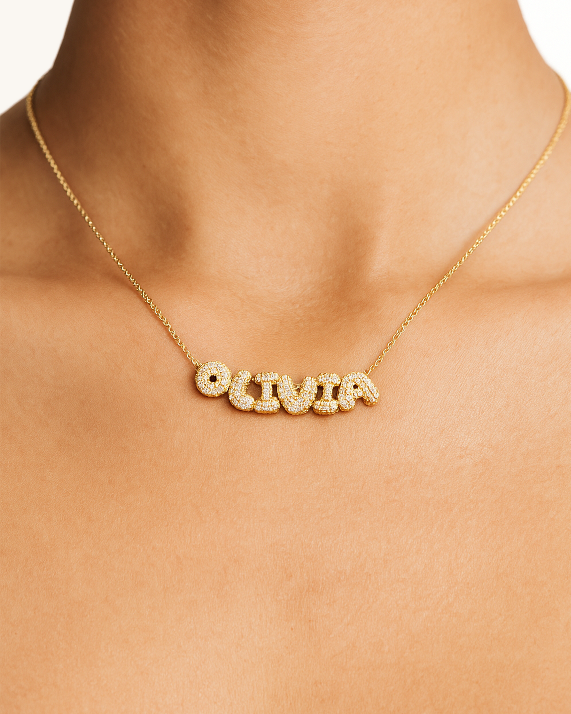 Make your statement shine with this personalized bubble letter name necklace. Featuring bold 1cm letters fully encrusted with dazzling stones, this piece turns any name or word into a sparkling showpiece. Crafted in waterproof stainless steel and plated in 18k gold, it's the perfect blend of style and shine – ideal for gifts, self-expression, or layering.