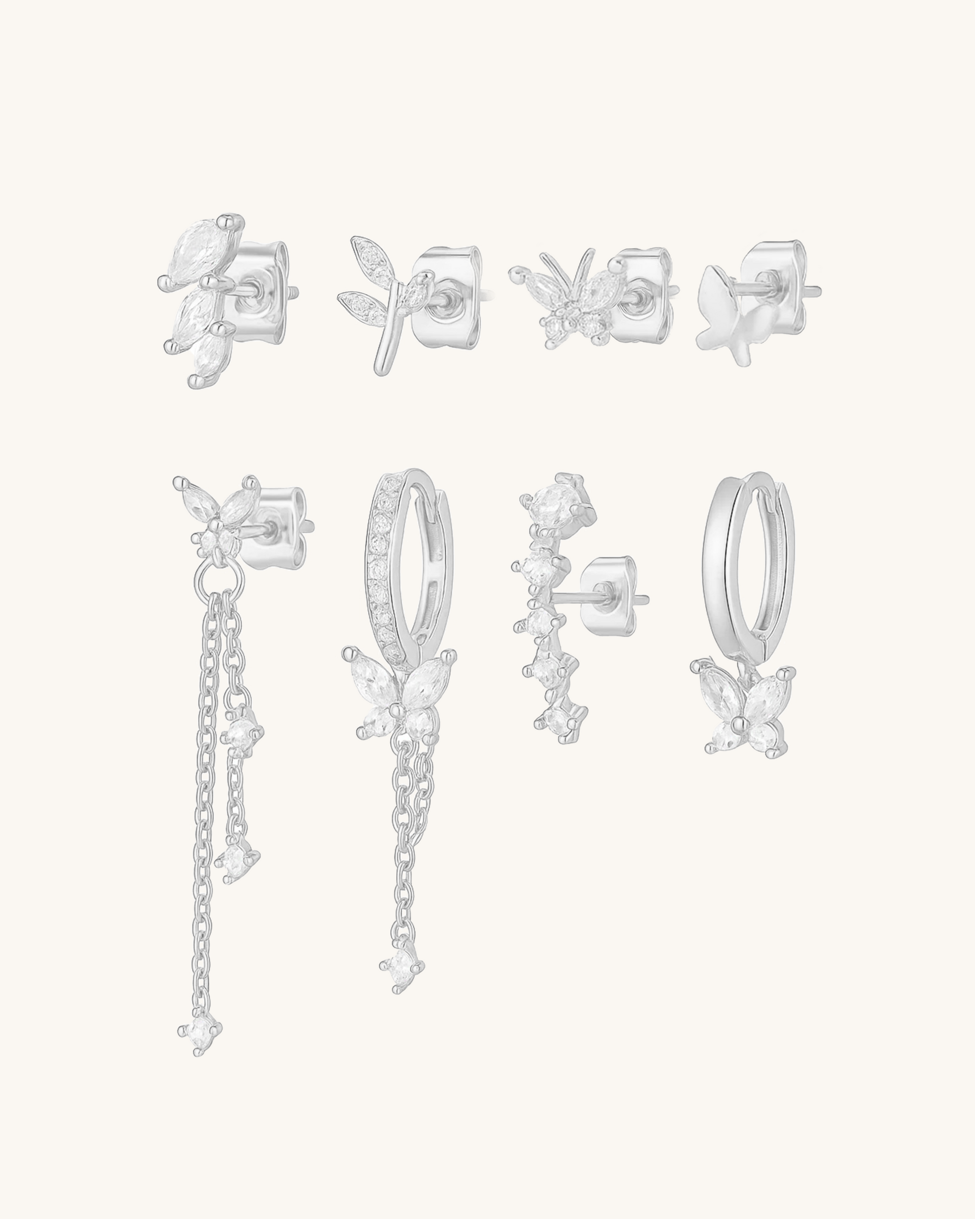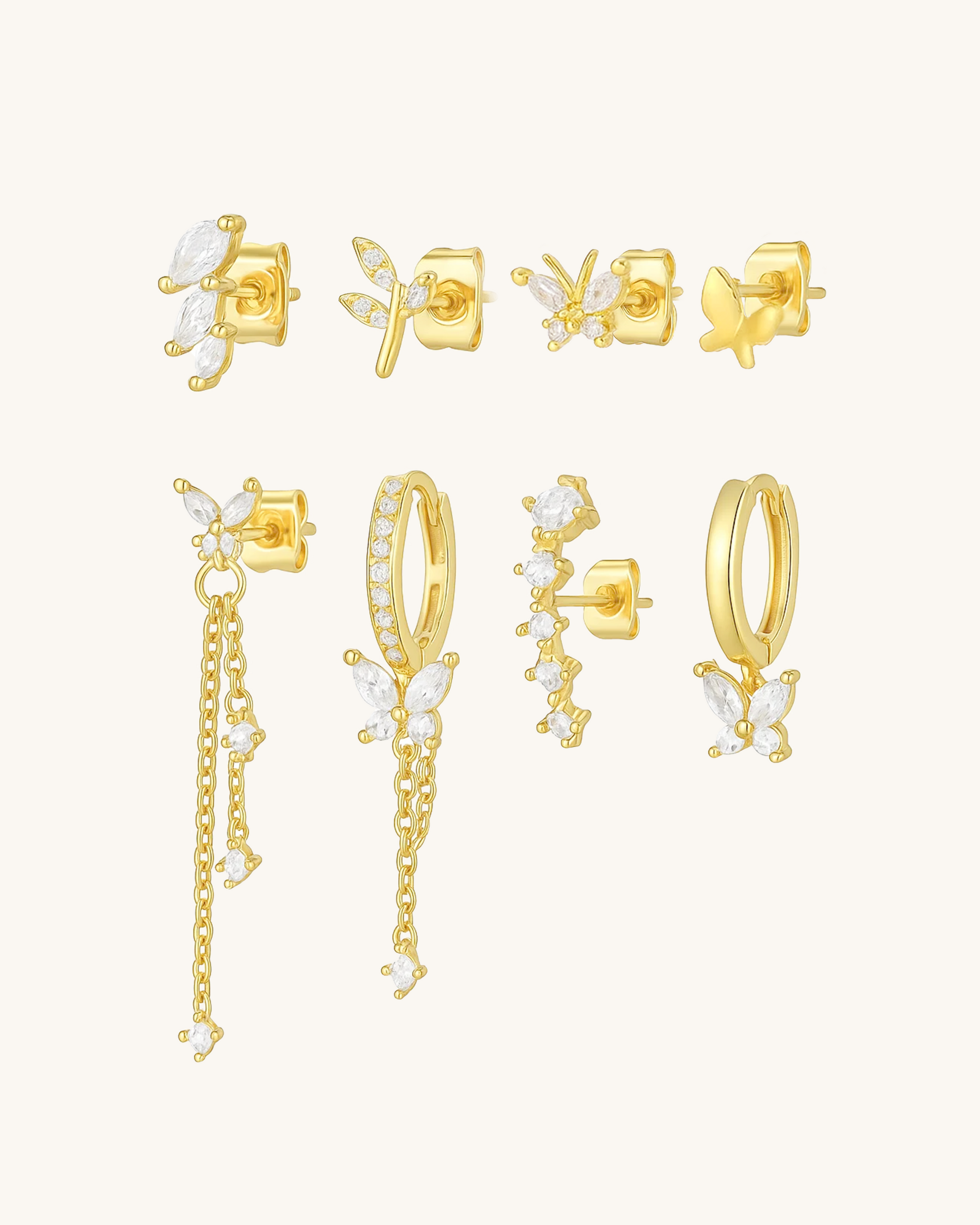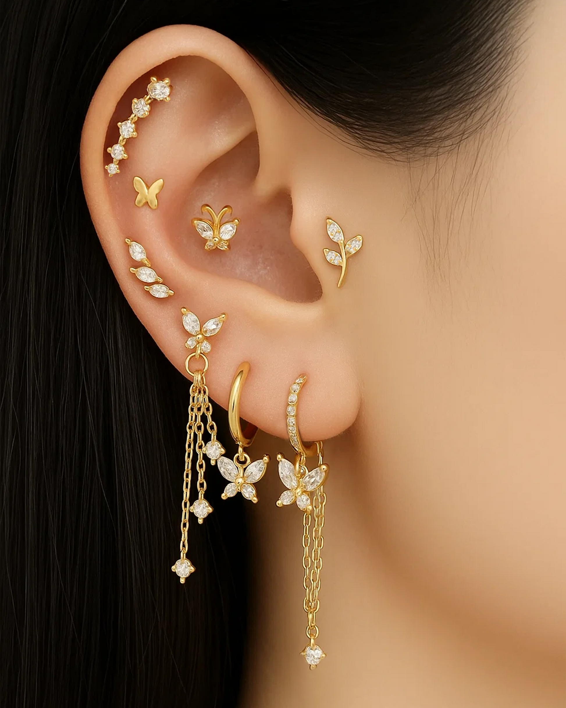 Embrace the elegance of nature with this enchanting ear stack set featuring butterflies, vine leaves, and delicate drops. A harmonious blend of studs, hoops, and dangling chains captures the essence of graceful movement and floral charm. Whether worn as a full set or mixed individually, this collection creates a whimsical and radiant look perfect for springtime or any season of beauty.