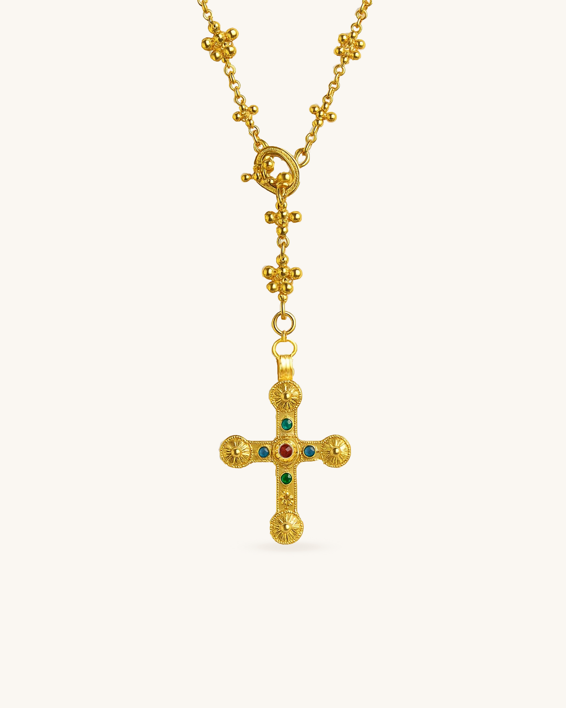 Bold and ornate, the Byzantine Cross Necklace draws inspiration from vintage religious art with its intricate textures and multicolor gem accents. Featuring a long decorative chain, a central toggle clasp, and a large drop-style cross pendant, this piece blends historical elegance with statement style. Ideal for layering or as a standout solo piece.