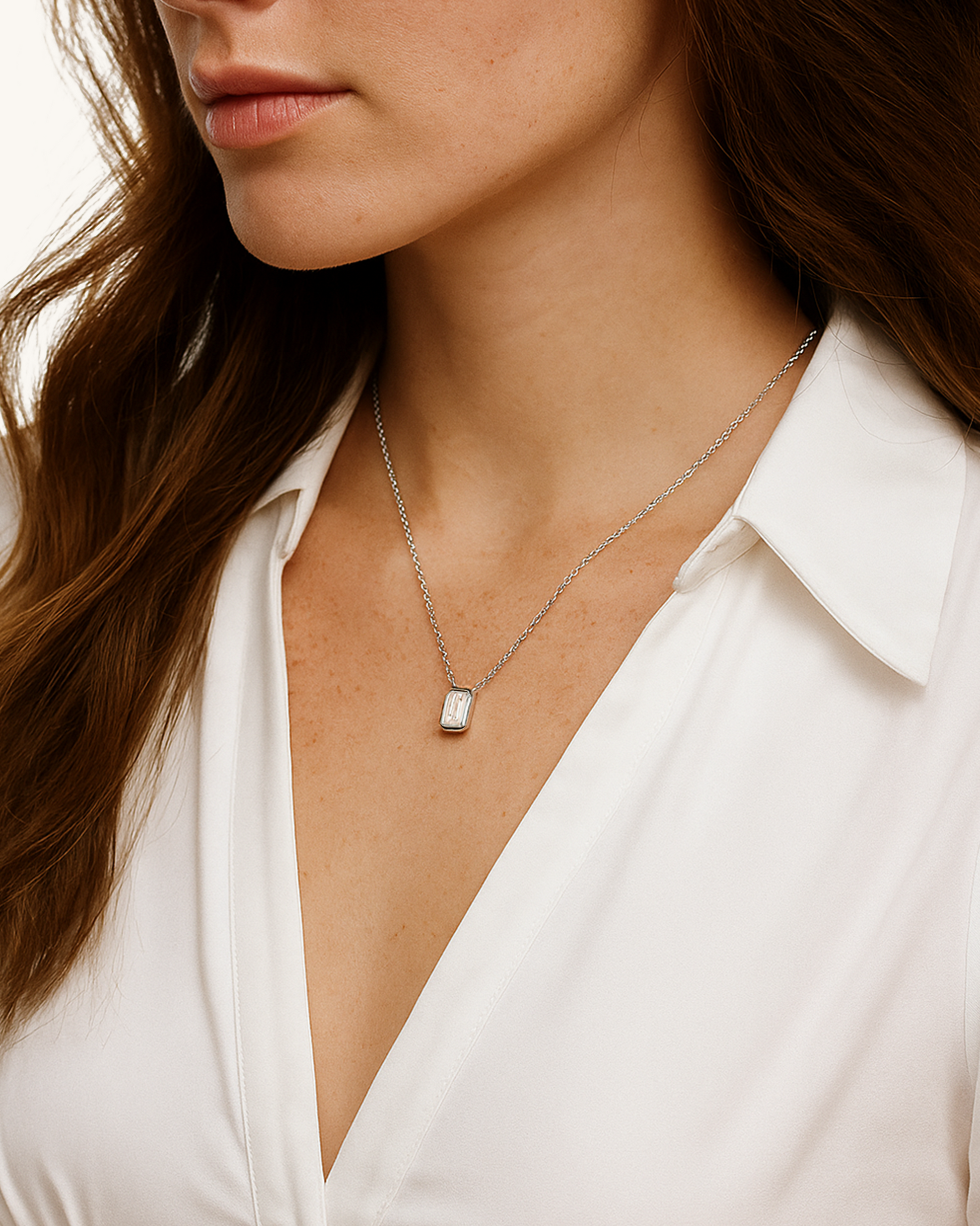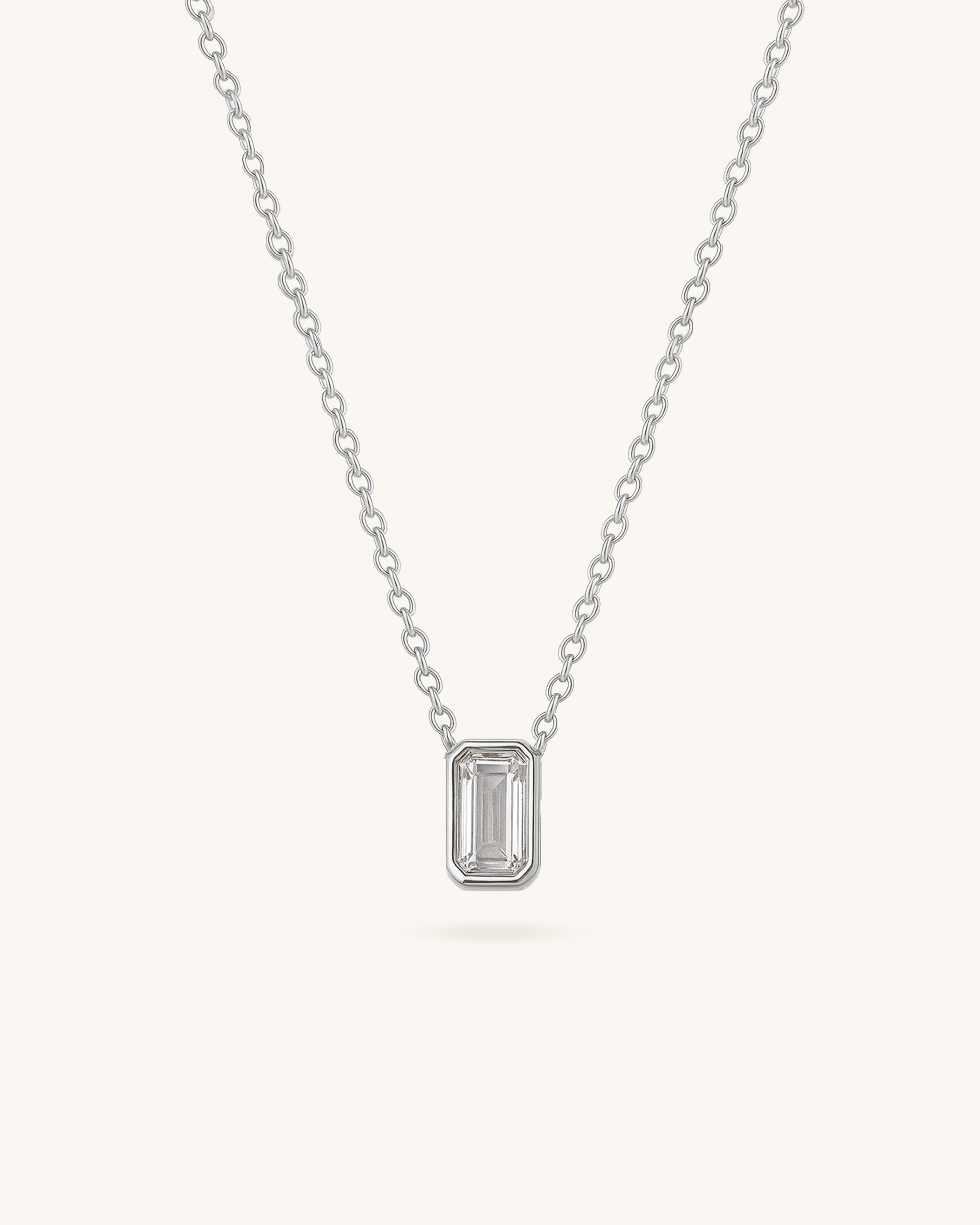Clean and contemporary, the Classic Baguette Necklace features a vertically set rectangular cubic zirconia in a sleek bezel frame. The minimalist silver-tone setting highlights the sharp lines and brilliance of the stone, making it a perfect piece for everyday wear, solo styling, or layering with other chains.