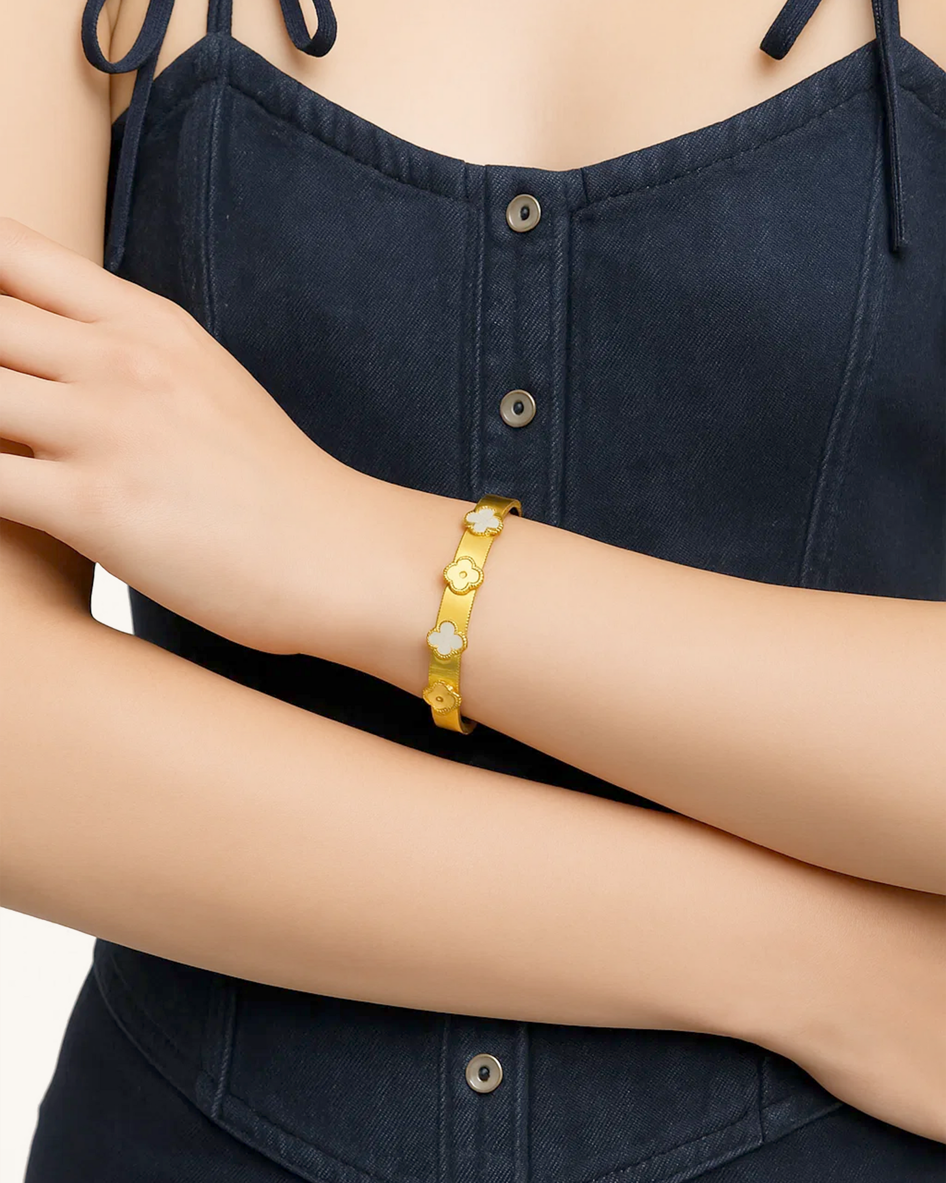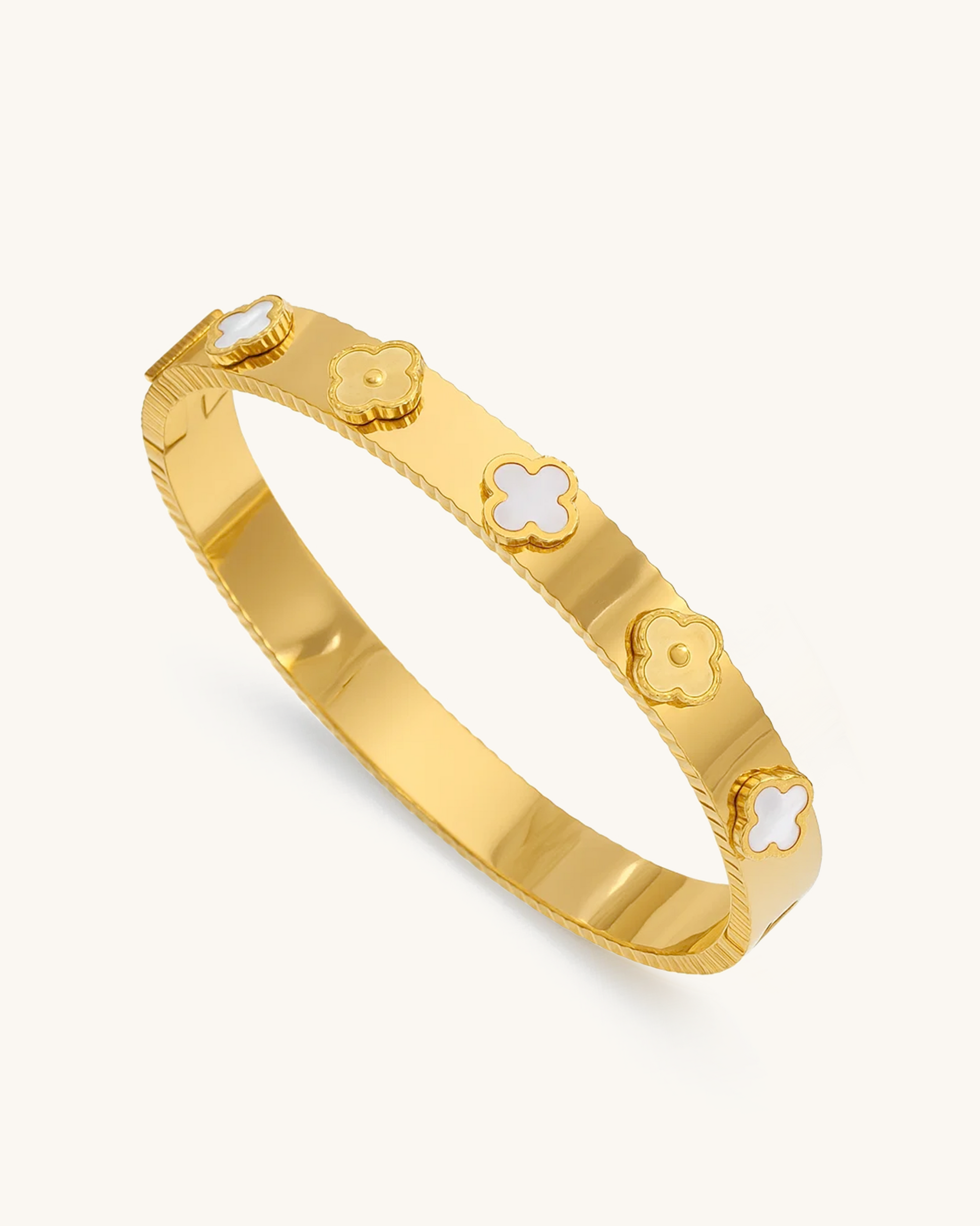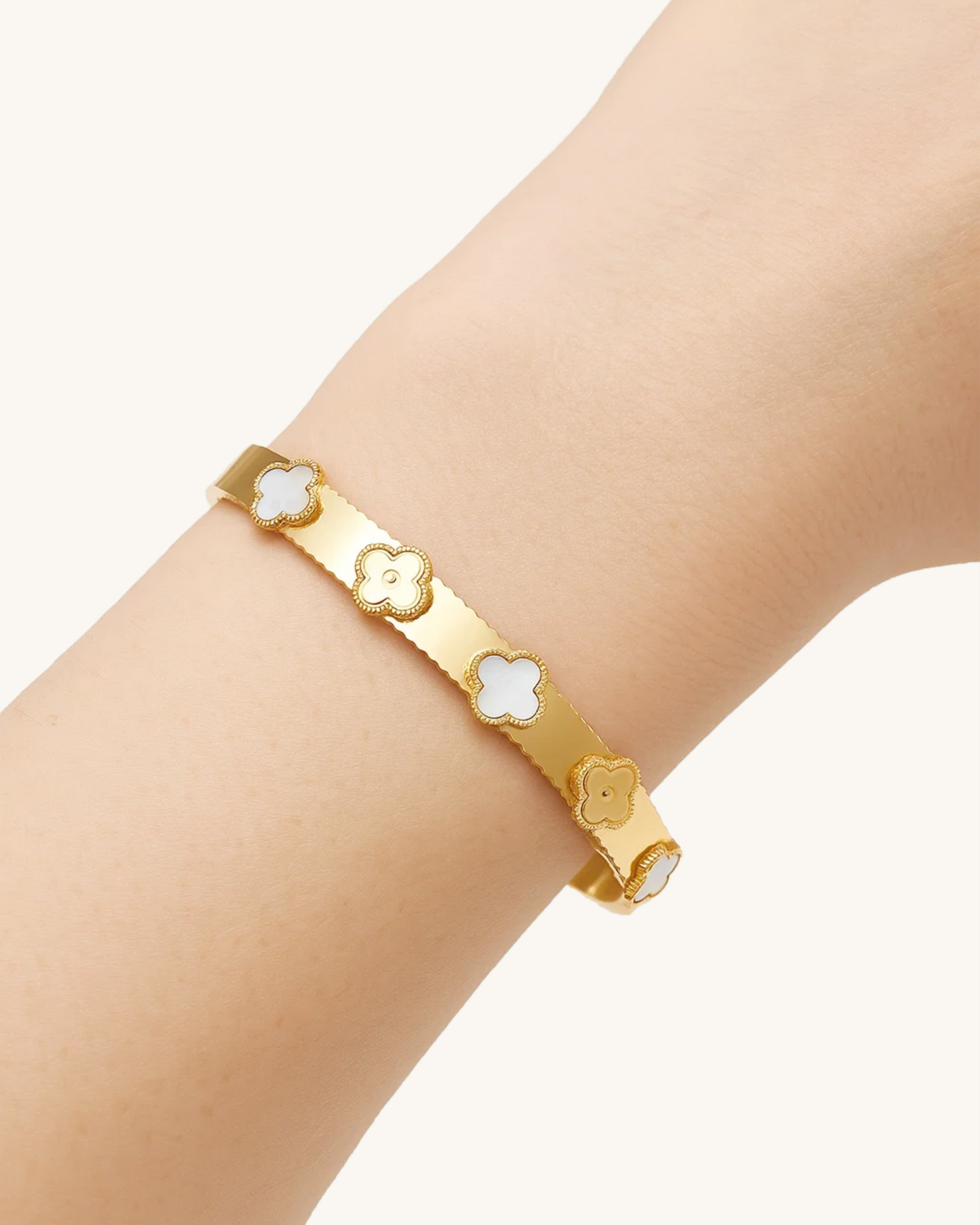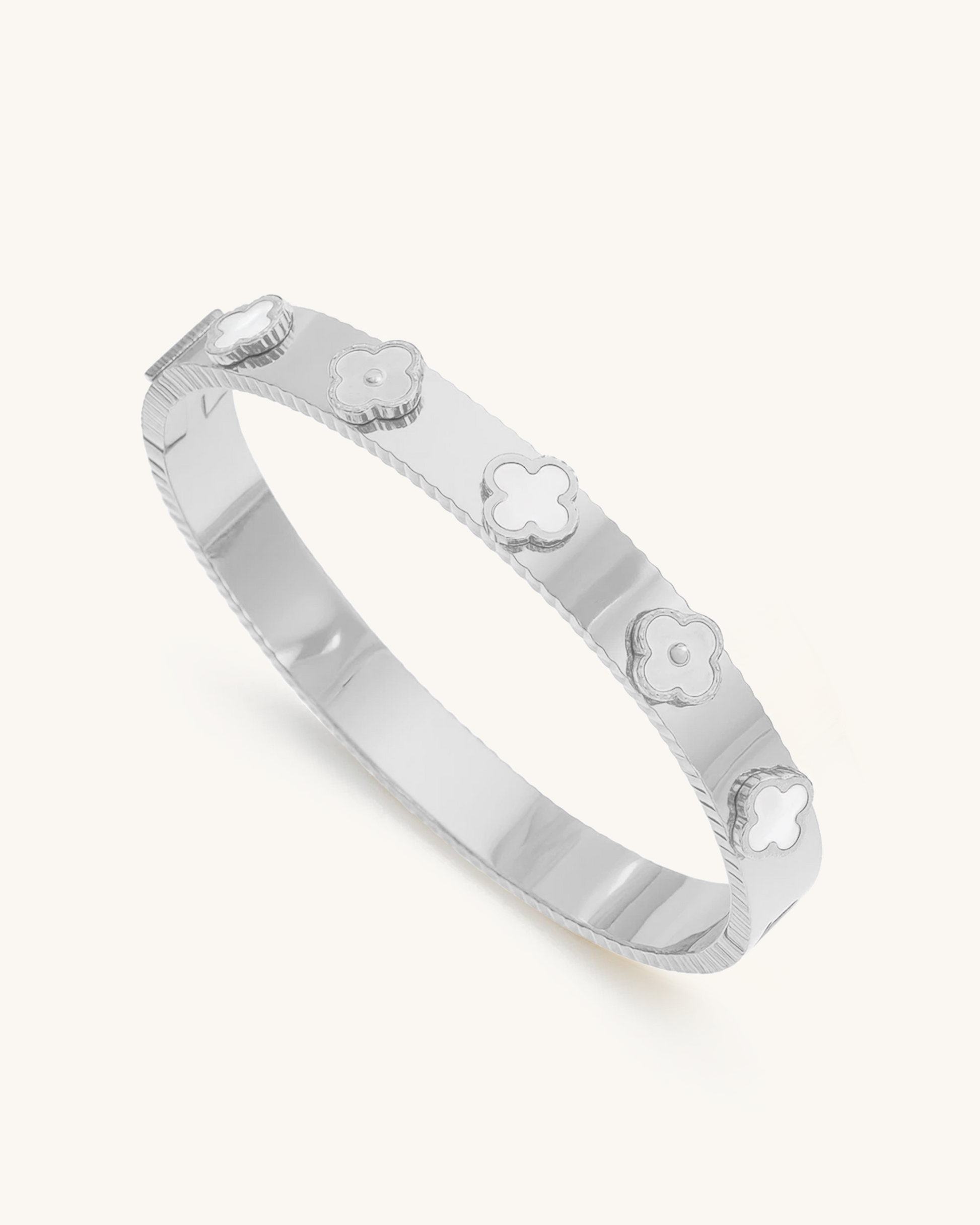 Elegant and symbolic, the Enamel White Bangle features alternating glossy enamel and gold-tone clover motifs on a sleek waterproof band. Made from durable stainless steel with 18K gold or silver plating, this hinged bangle adds a touch of charm and sophistication to any outfit. Wear it solo or stack for a lucky statement.