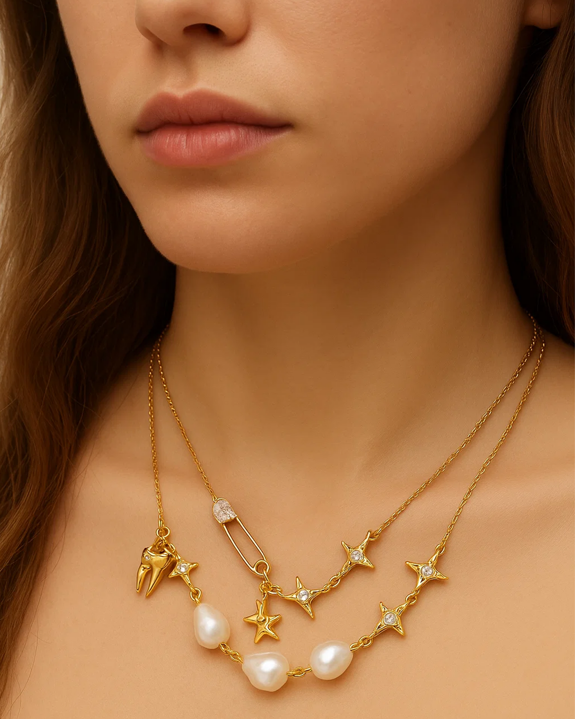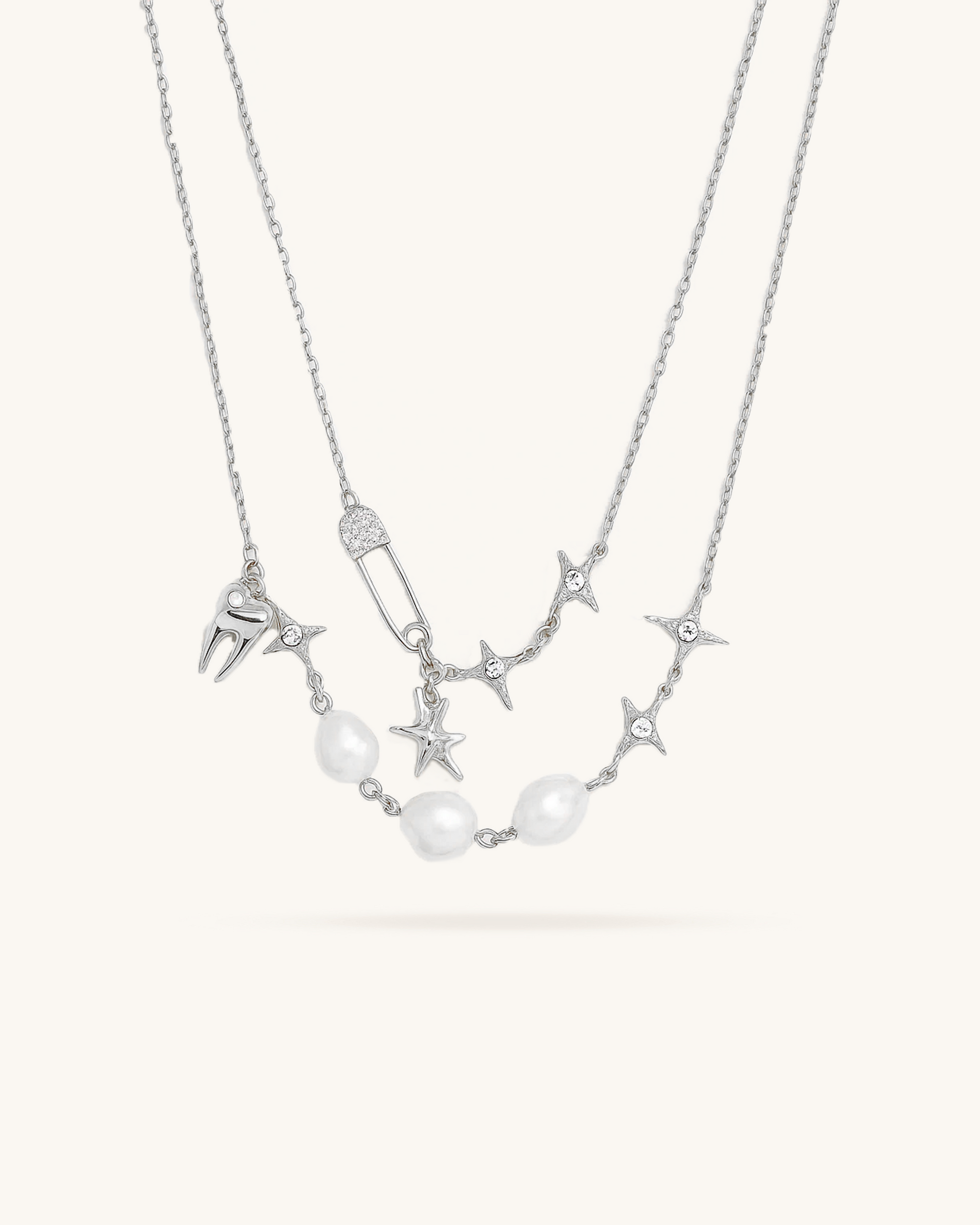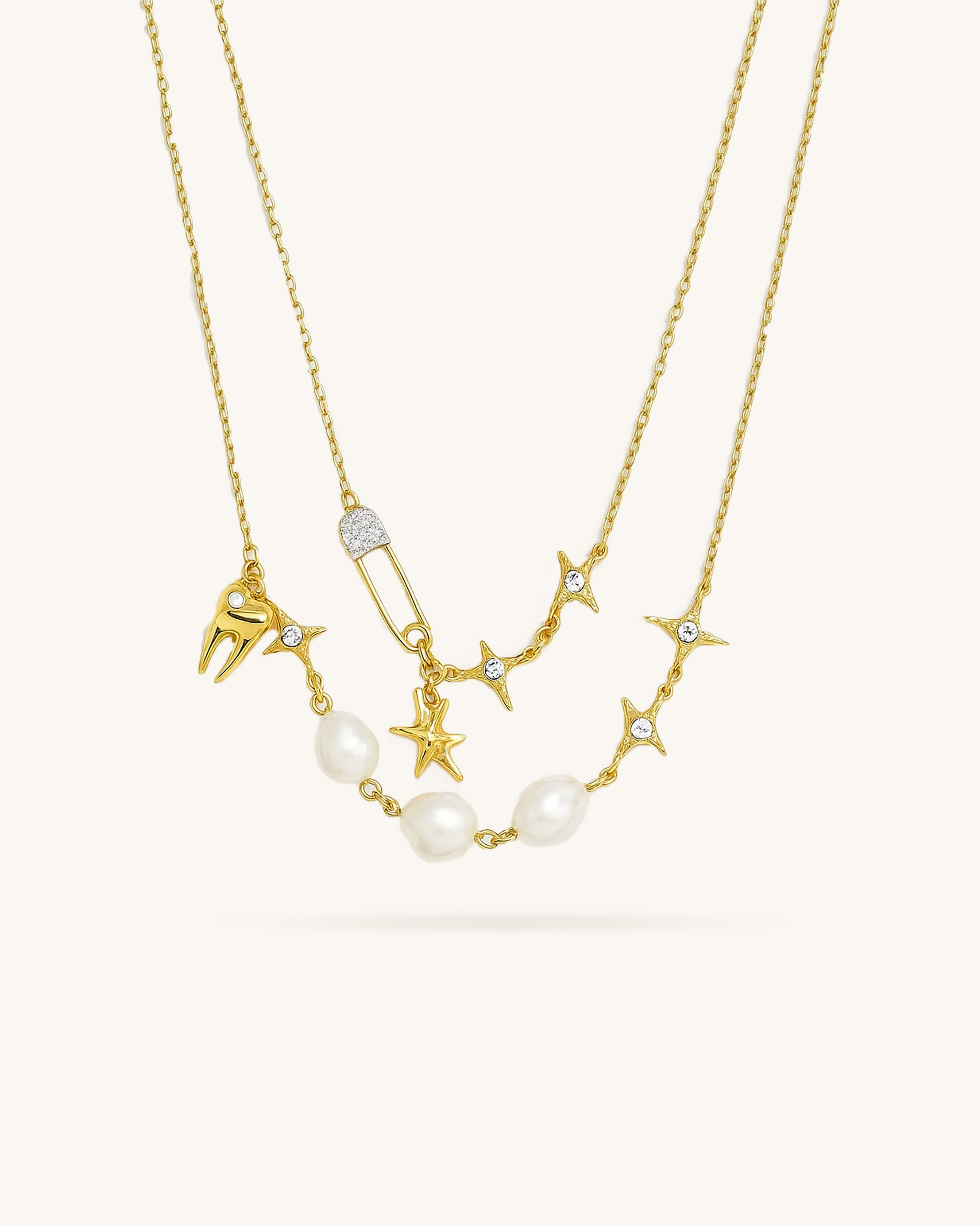 Edgy yet whimsical, the Charm Layered Necklace features a two-chain design adorned with star accents, a sparkling safety pin, asymmetrical imitation pearls, and playful charms like a tooth and starfish. Finished in waterproof gold or silver plating, this statement piece adds attitude and charm to any outfit—perfect for those who love fashion with personality.