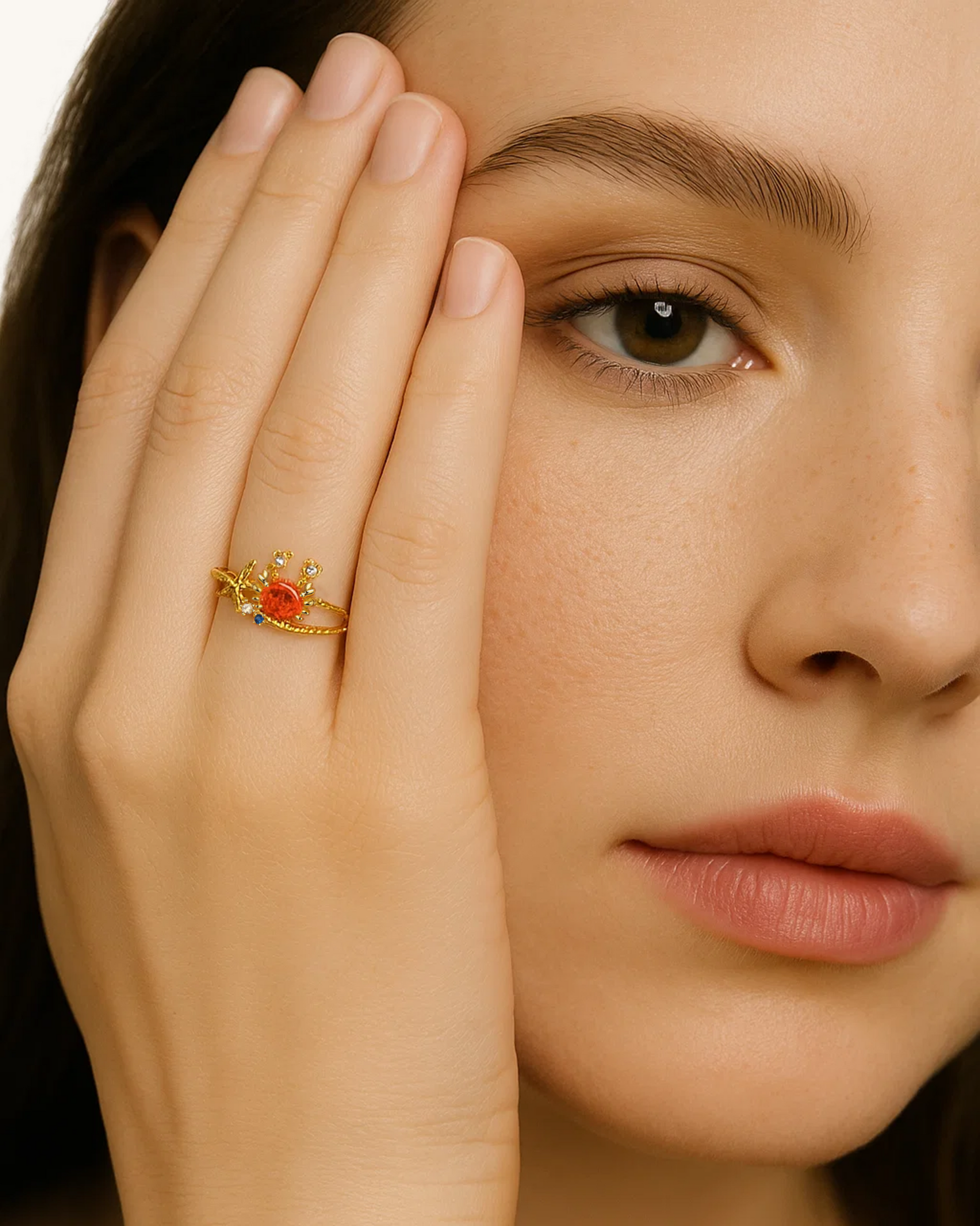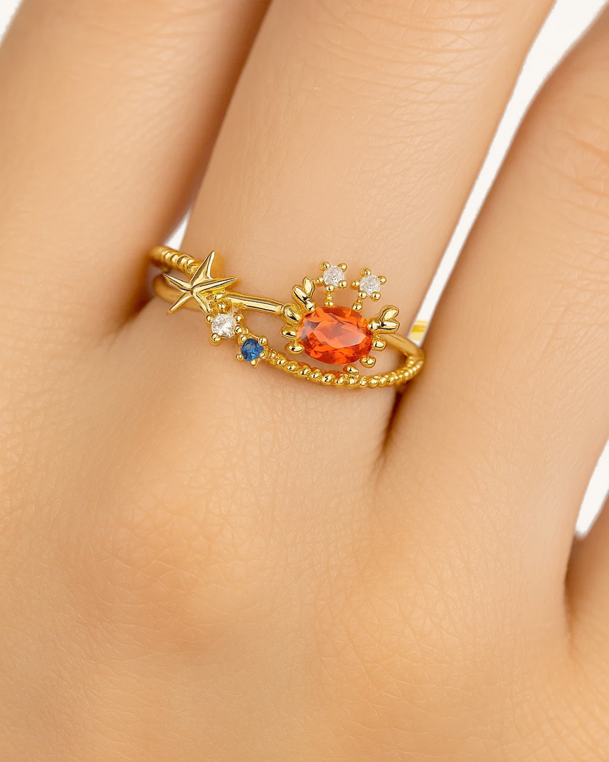 Bright and playful, the Crab & Star Orbit Ring features a whimsical crab motif hugging a vibrant orange gemstone, accented by star and beaded detailing in a flowing orbit-like band. Crafted in 18K gold-plated copper, this ring brings a touch of cosmic charm and ocean magic to your everyday style.