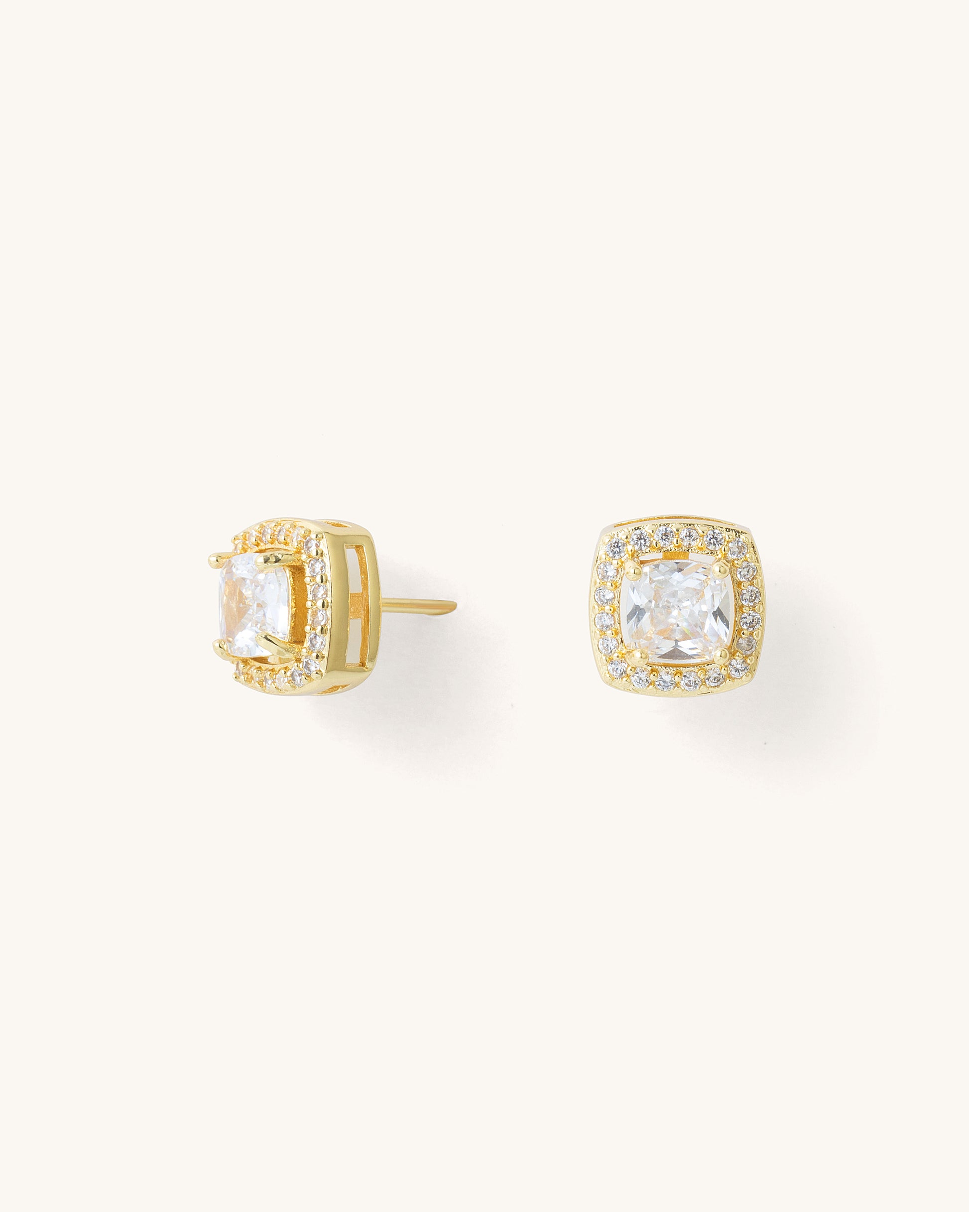 Elegant and timeless, the Cushion Halo Stud Earrings feature a cushion-cut center stone framed by a delicate halo of sparkling cubic zirconia. Available in both gold-plated and silver-plated finishes, these classic studs bring refined brilliance to any look, making them perfect for both everyday wear and special occasions.
