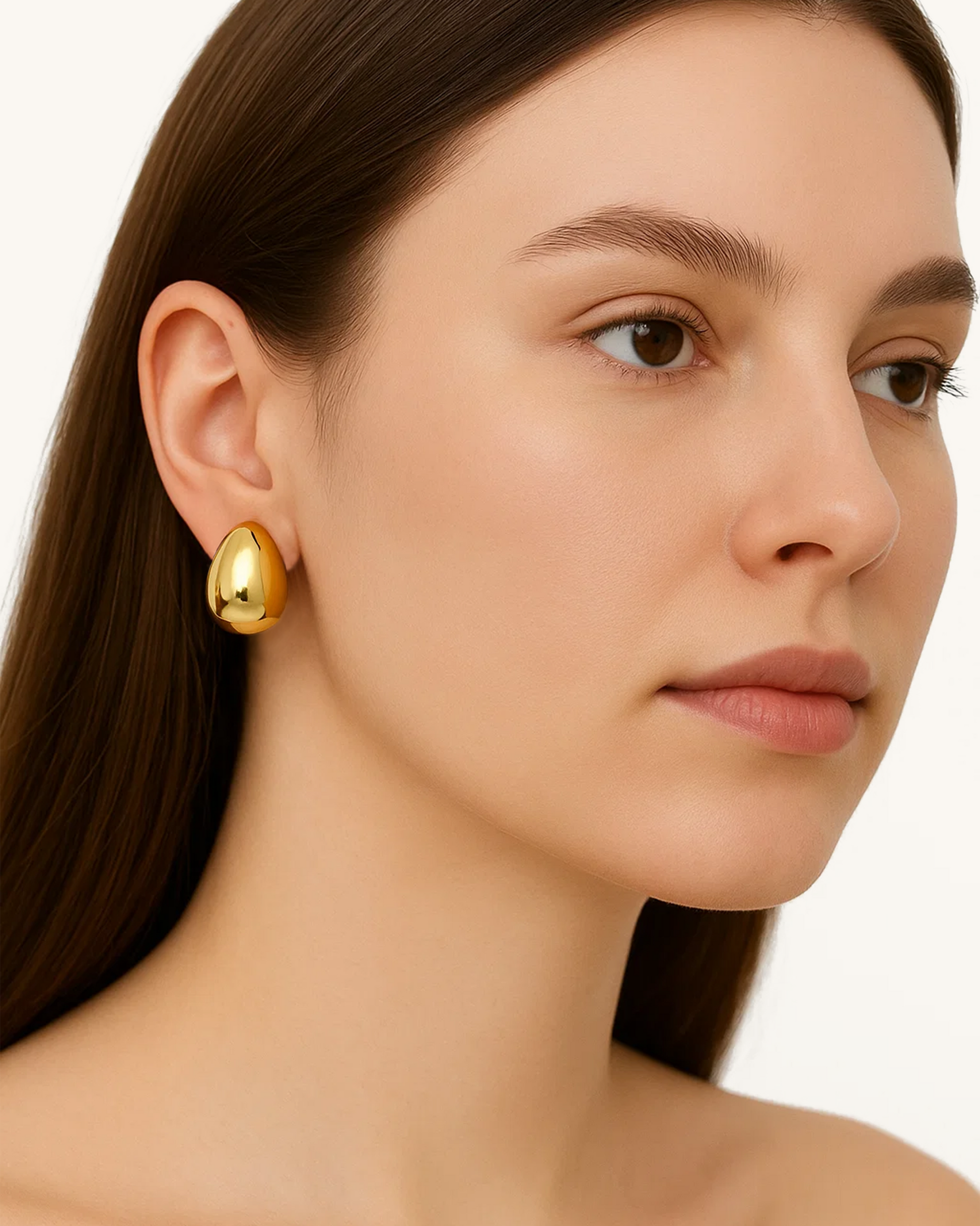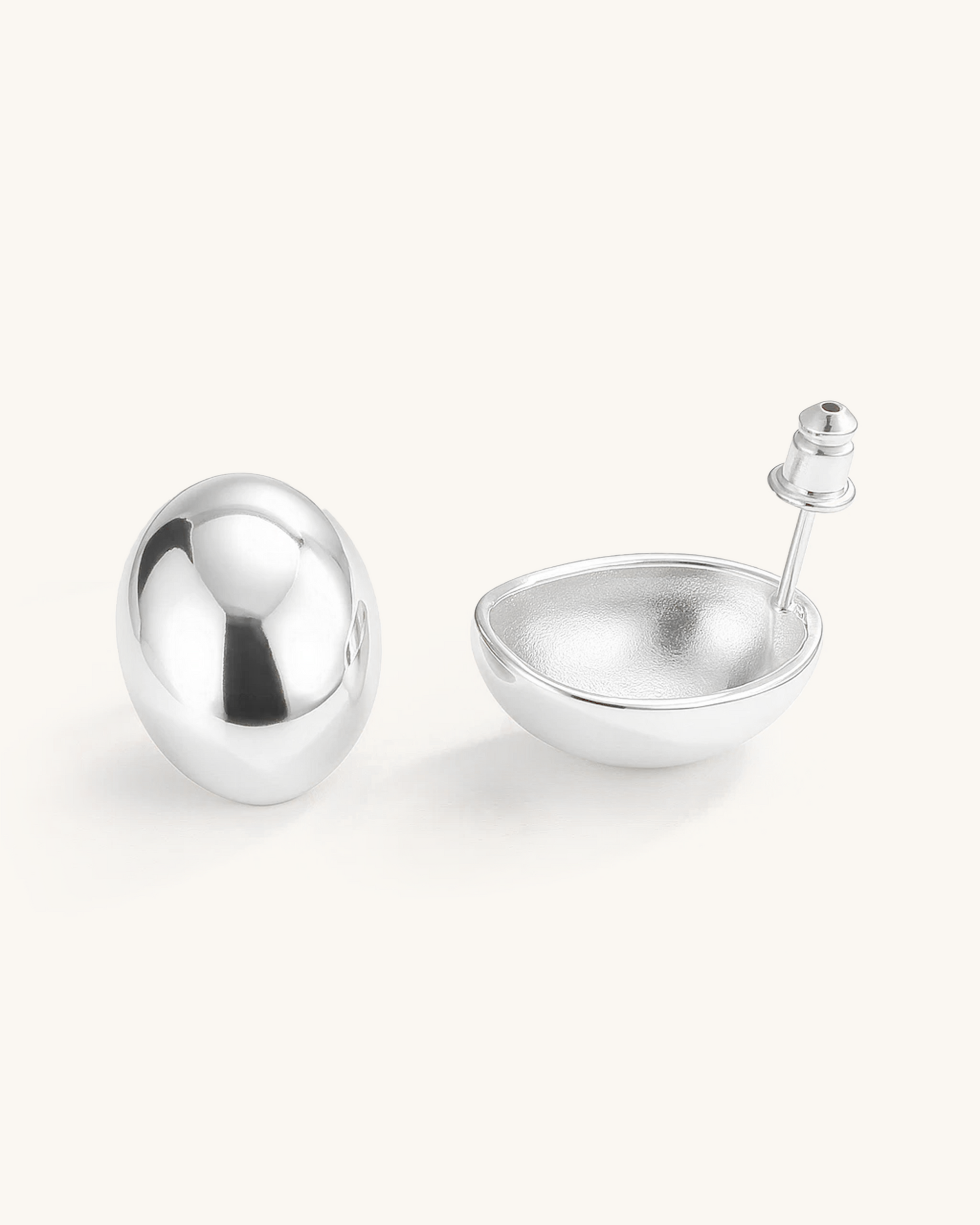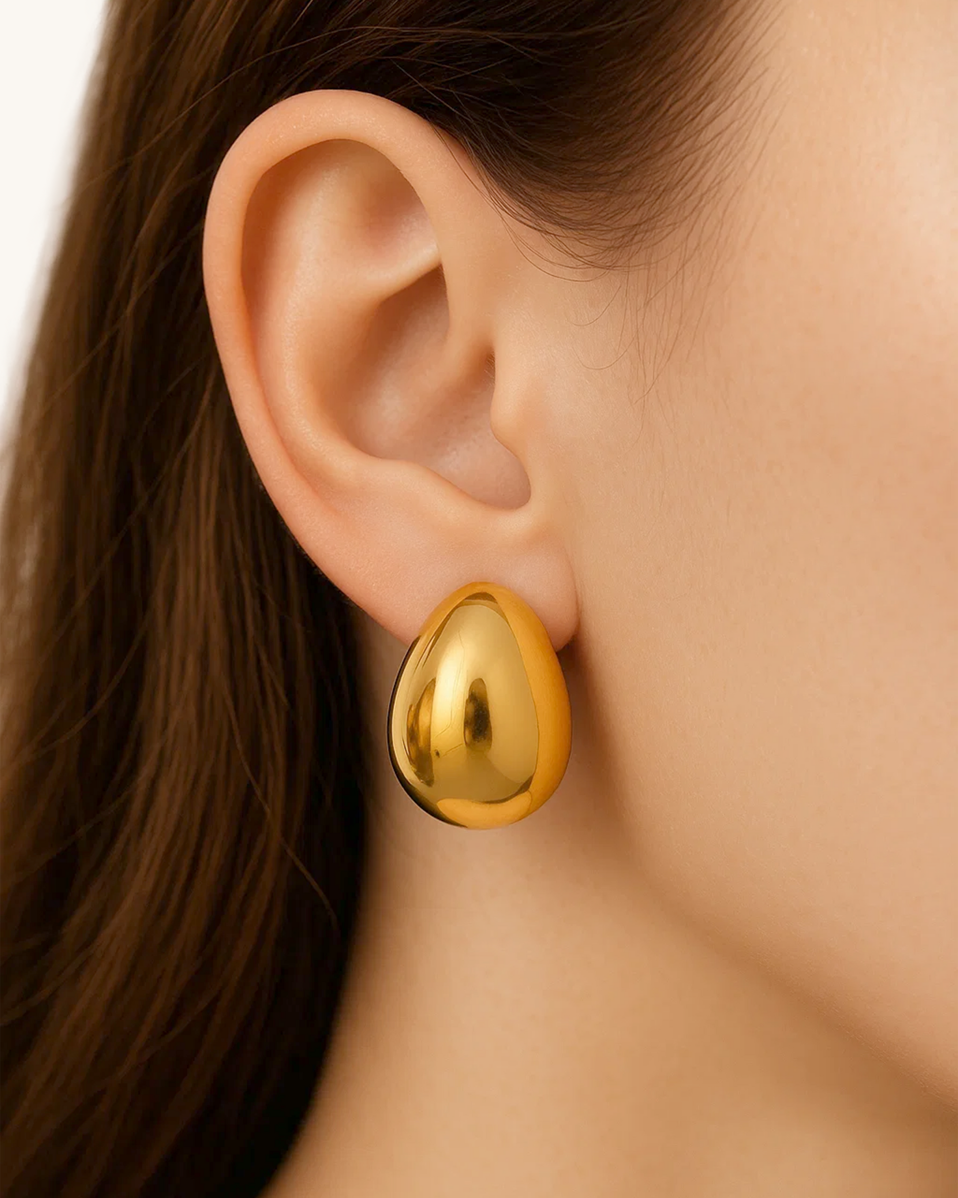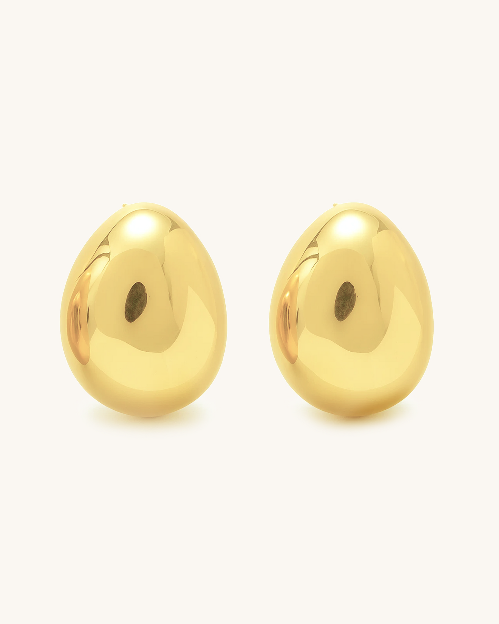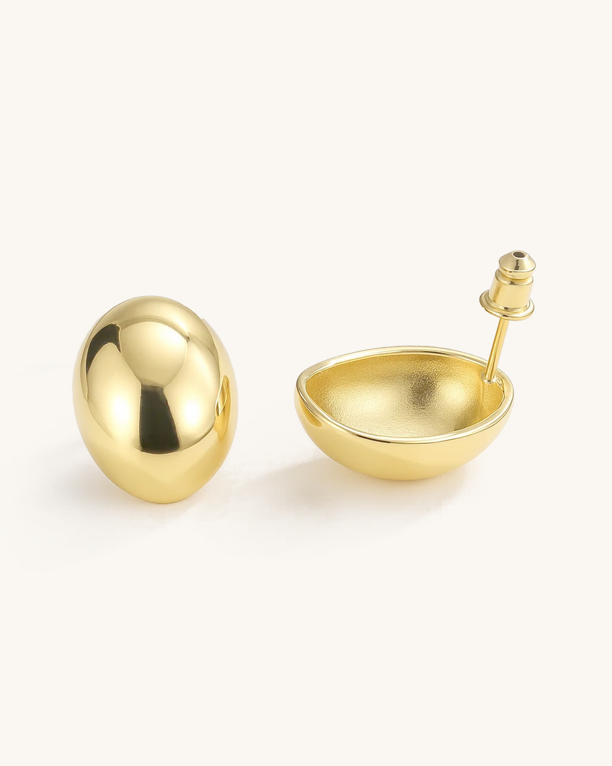 Bold and smooth, the Dome Earrings feature a sculpted oval silhouette with a rounded high-shine finish. Their egg-like shape gives off a soft, modern edge while making a subtle statement. Crafted from waterproof stainless steel and finished in radiant 18K gold, these earrings are the perfect blend of minimalism and volume.