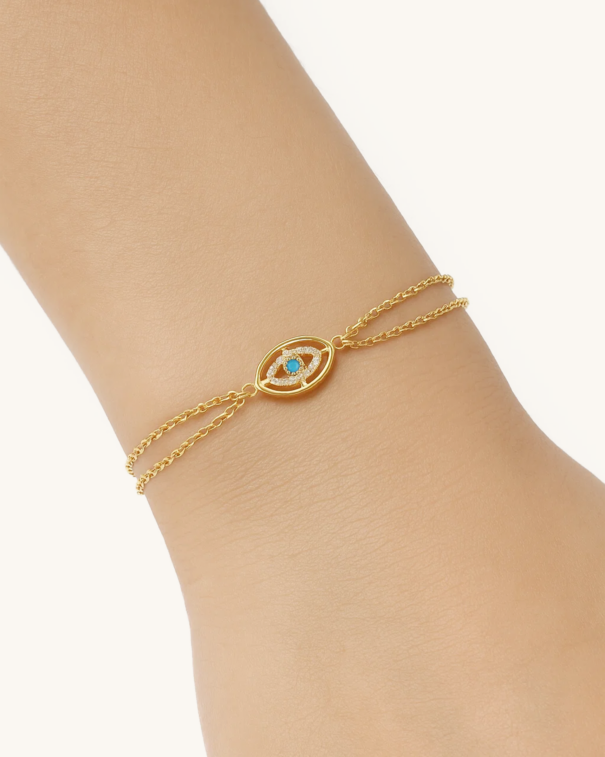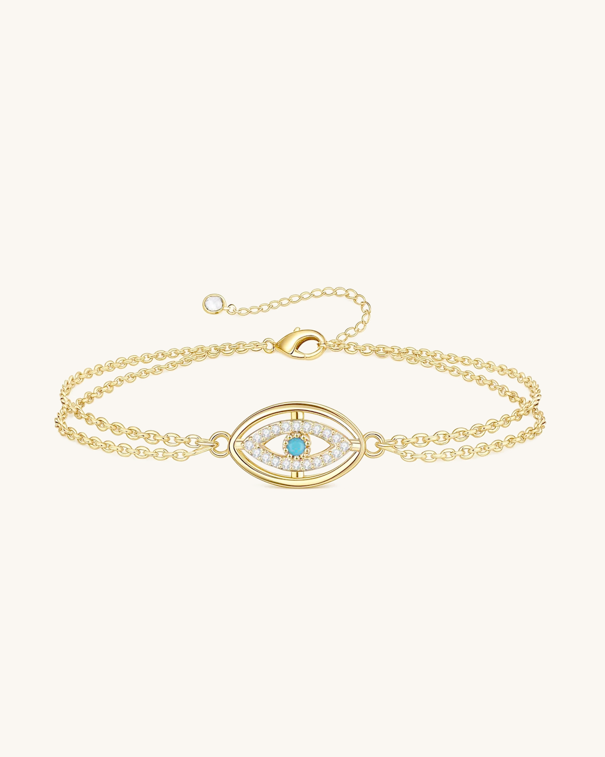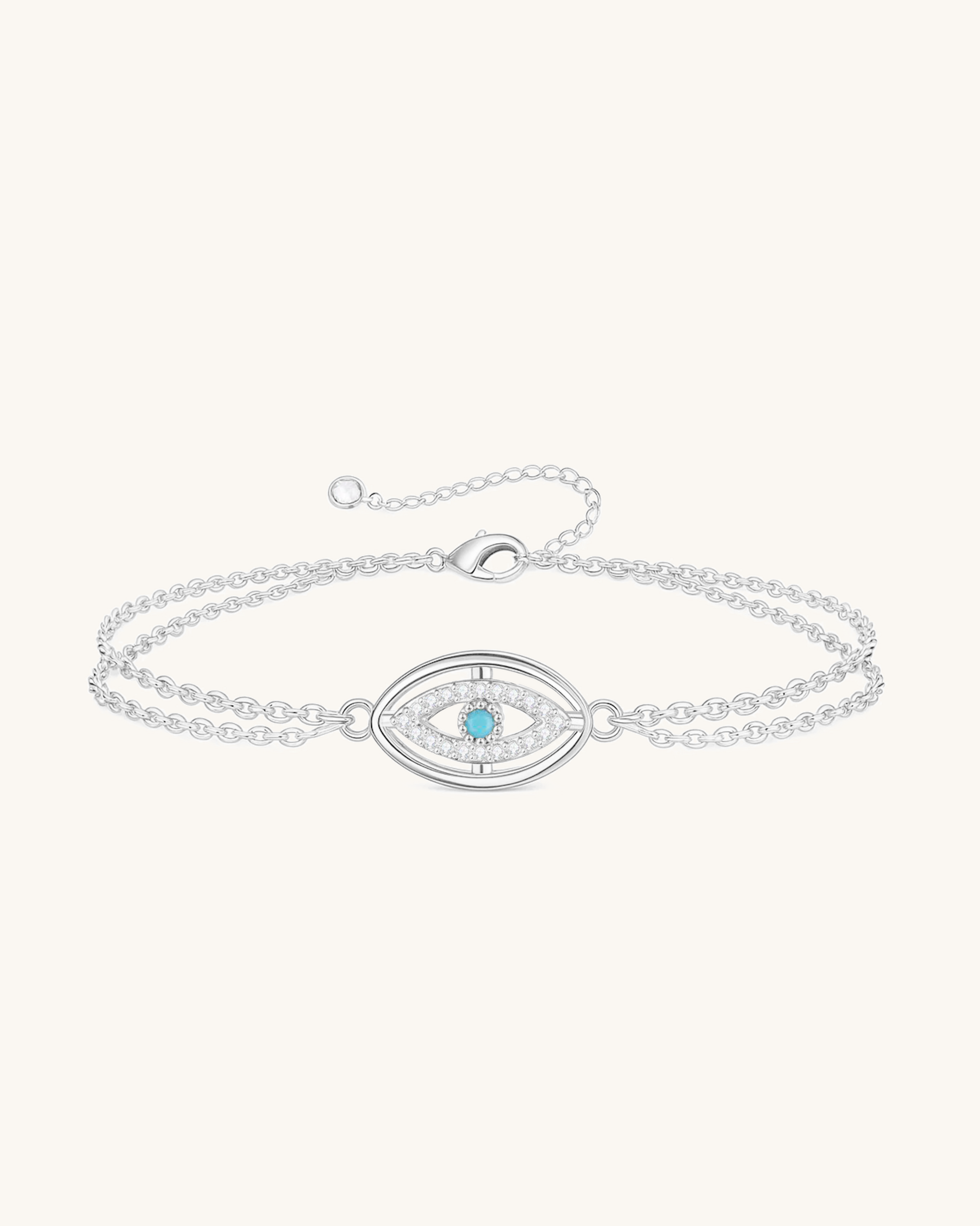 Symbolic and elegant, the Double Evil Eye Bracelet features a protective turquoise-tone eye charm surrounded by a halo of shimmering cubic zirconia. The dual-chain design adds layered texture while maintaining a sleek silhouette. Crafted in waterproof stainless steel with 18K gold or silver plating, it's a meaningful piece designed for style, strength, and everyday protection.