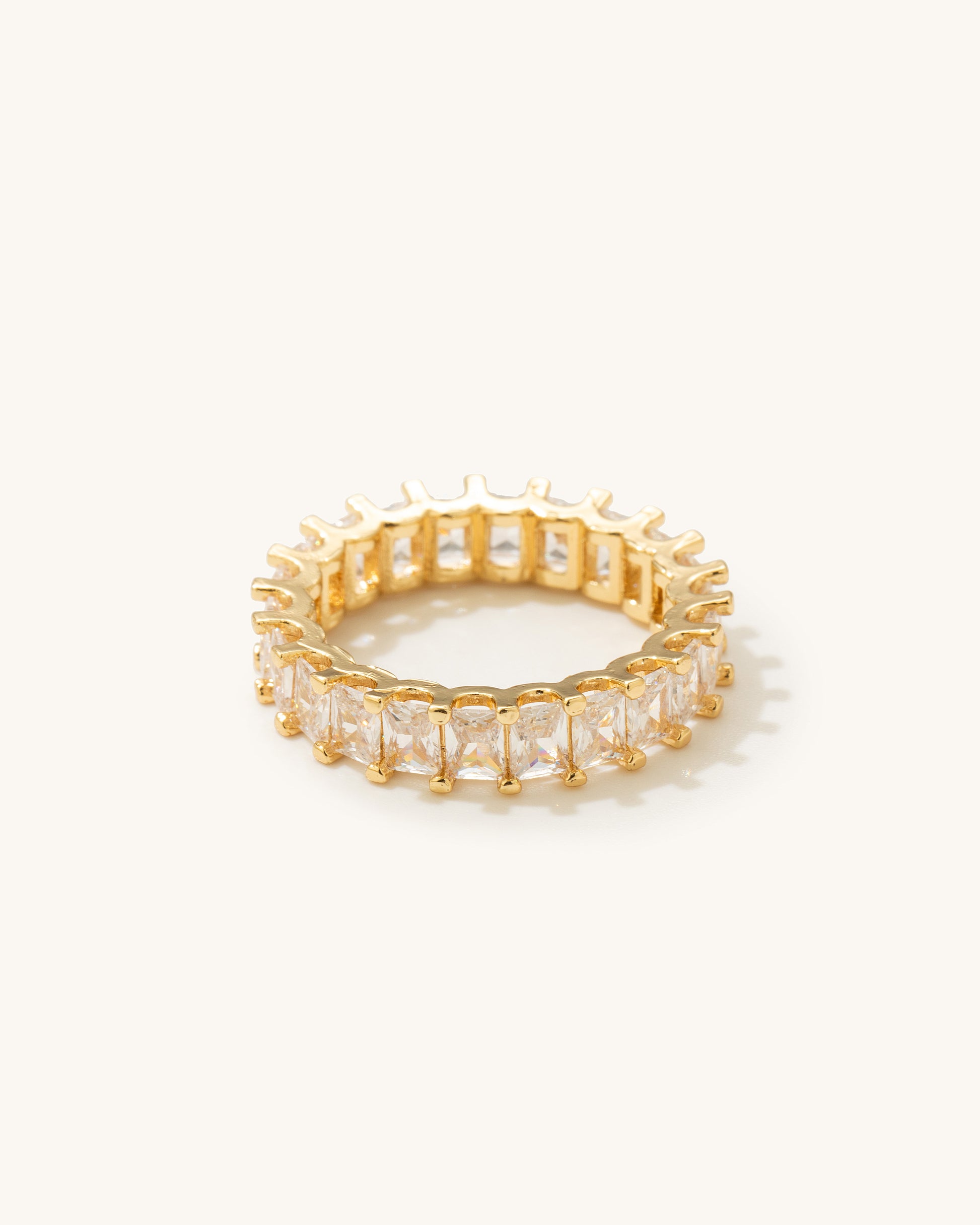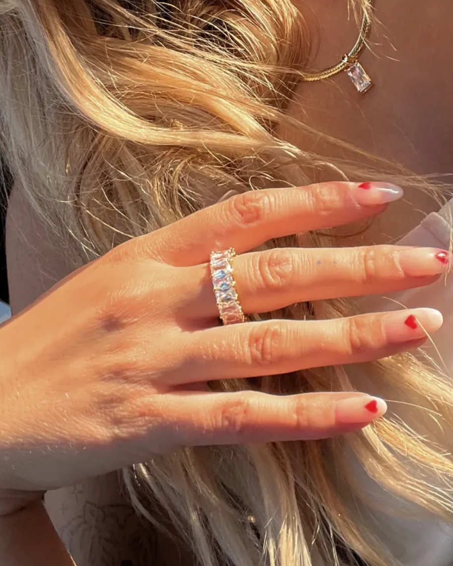 Add effortless glamour to your look with the Emerald Cut Band Ring. Designed with a series of radiant emerald-cut stones set around a bold band, this ring is a timeless piece perfect for everyday sparkle or special occasions.