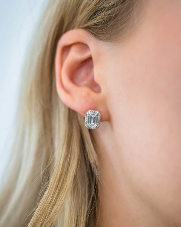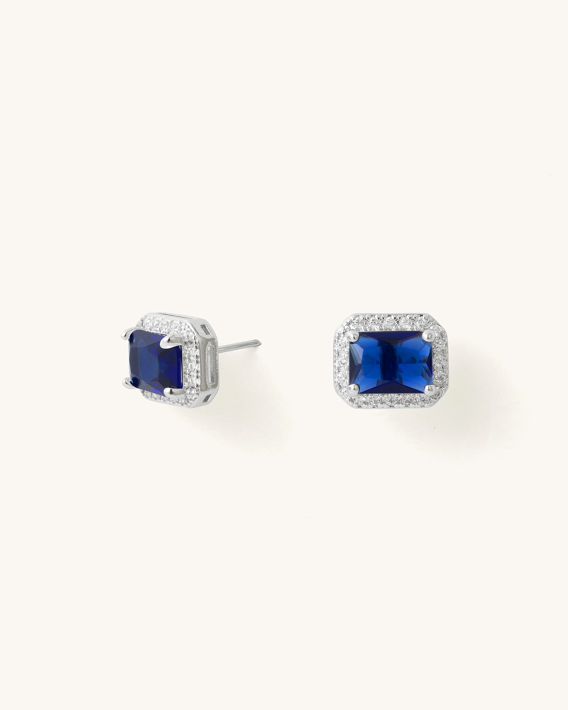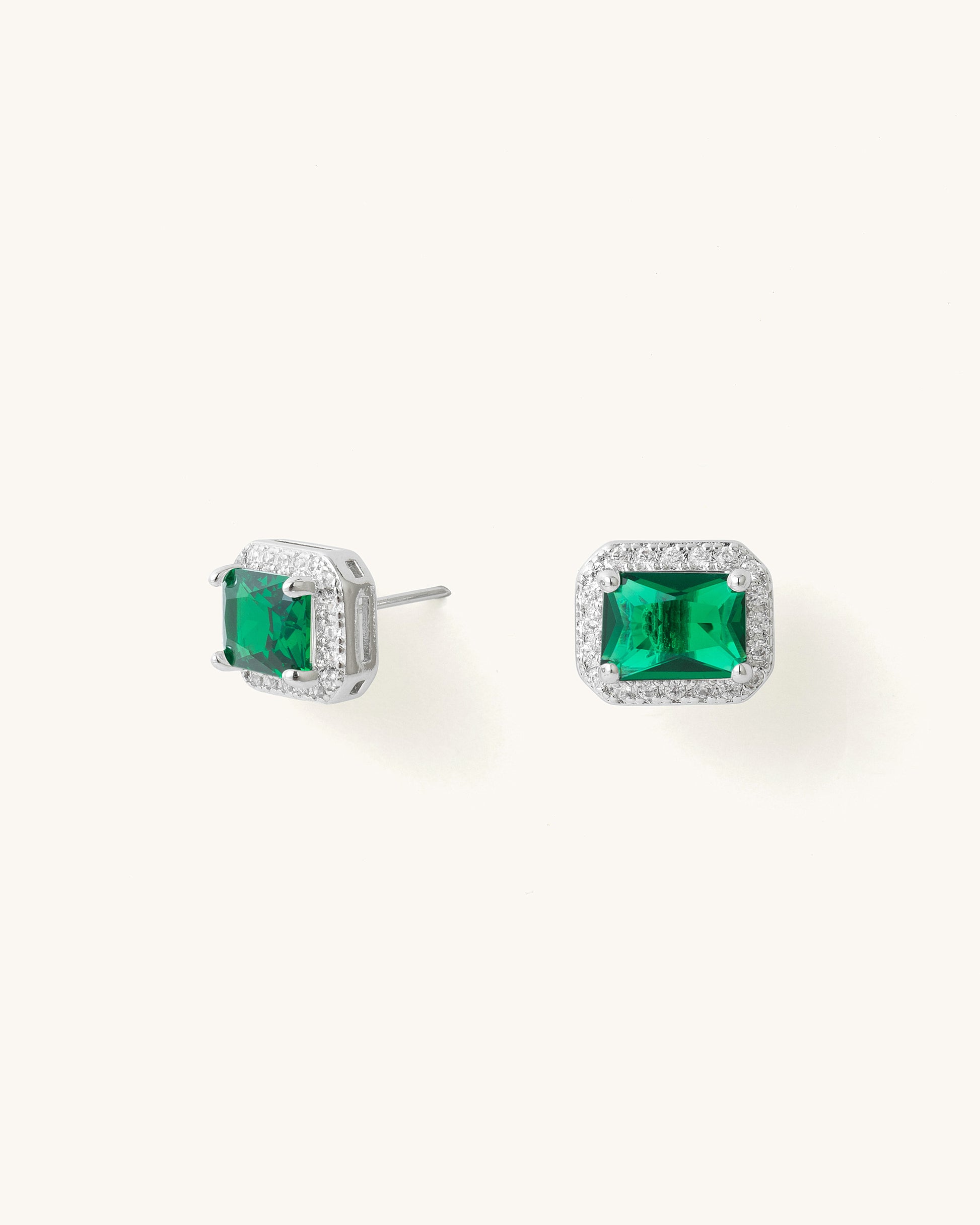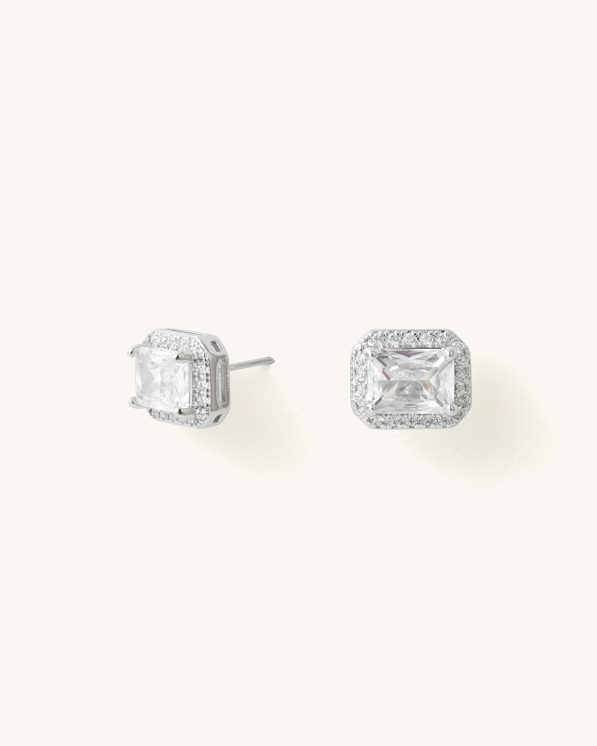 Classic with a twist, the Emerald-Cut Stud Earrings feature a vibrant rectangular center stone framed by a halo of shimmering cubic zirconia. Crafted in a sleek silver-plated finish, these studs add a refined sparkle to your everyday or evening look. Available in green, white, and blue stones to suit your mood.