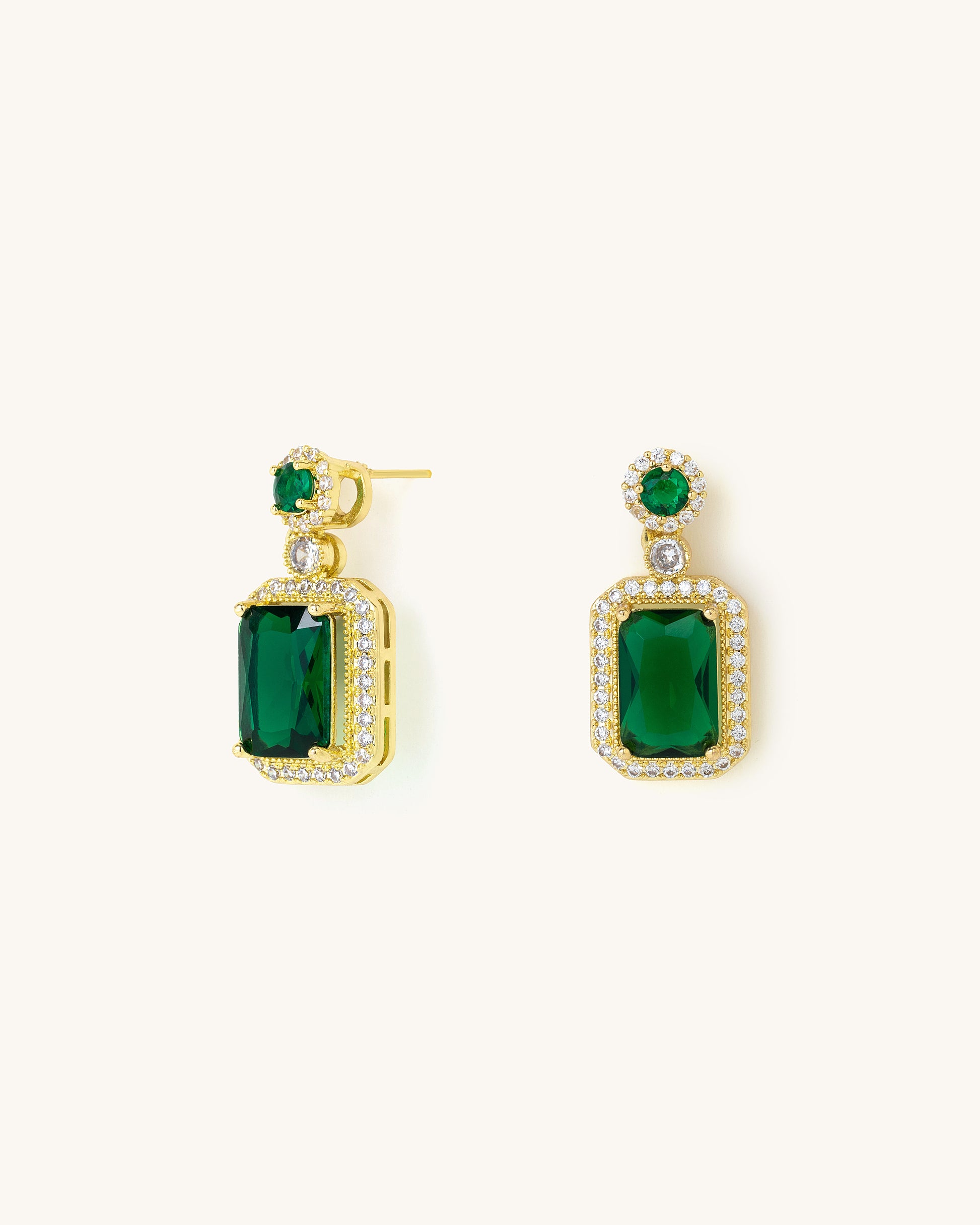Bold and luxurious, the Emerald Green Drop Earrings feature vibrant emerald-toned stones framed by halos of sparkling cubic zirconia. Crafted with a gold-plated finish over copper, these statement earrings bring an elegant vintage charm to any look, perfect for special occasions and evening glamour.