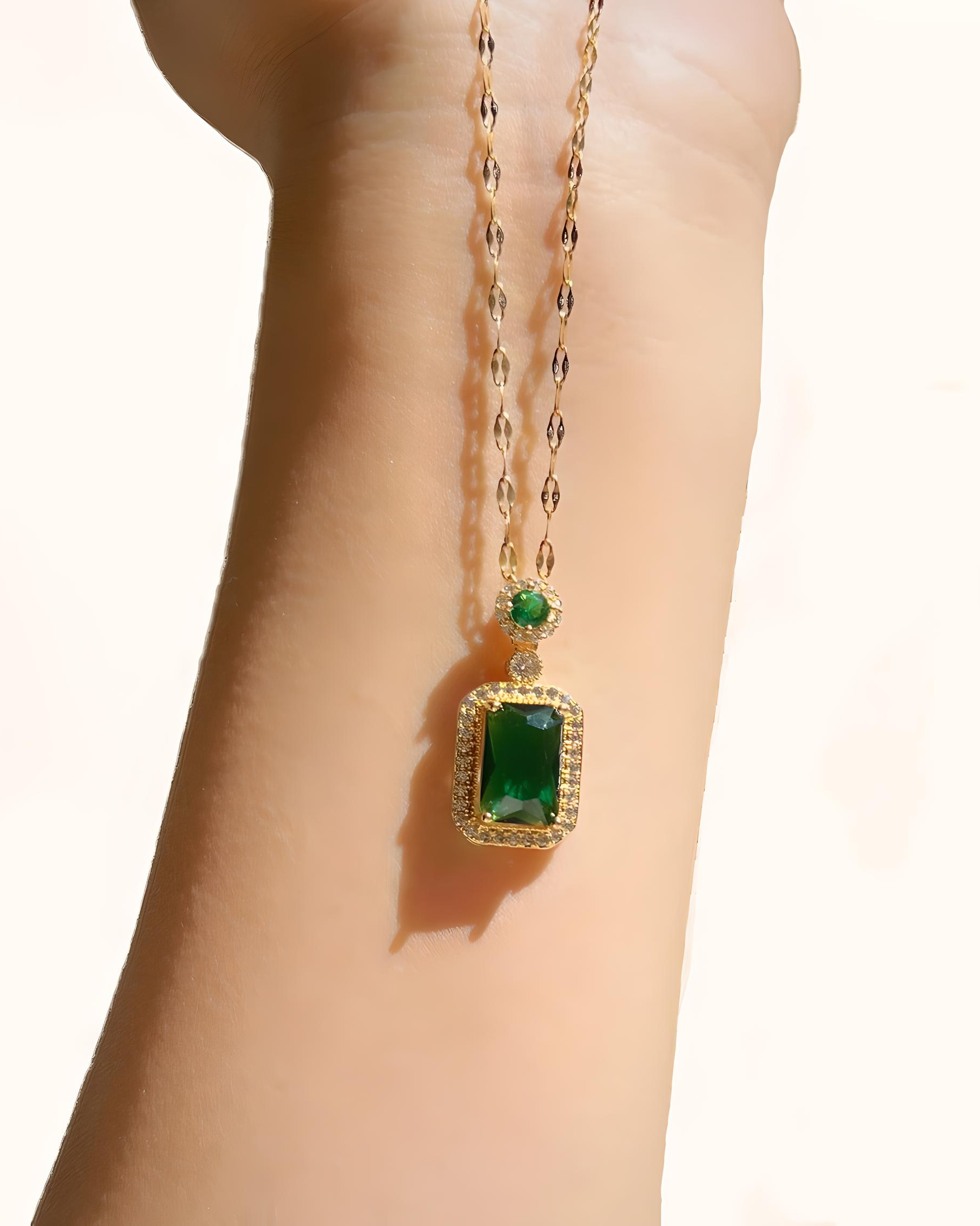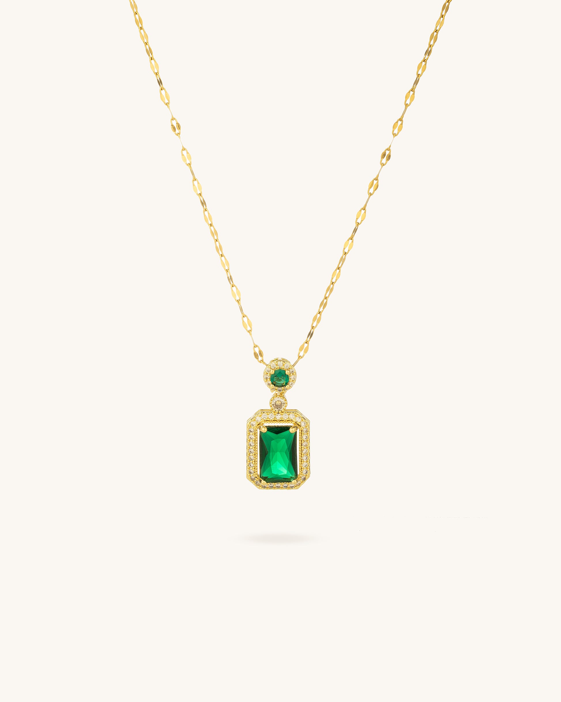 Radiate elegance with the Emerald Green Pendant Necklace. Featuring a vivid emerald-cut stone encircled by shimmering Cubic Zirconia, this piece is paired with a delicate twisted chain. Crafted for everyday sophistication and special moments alike.