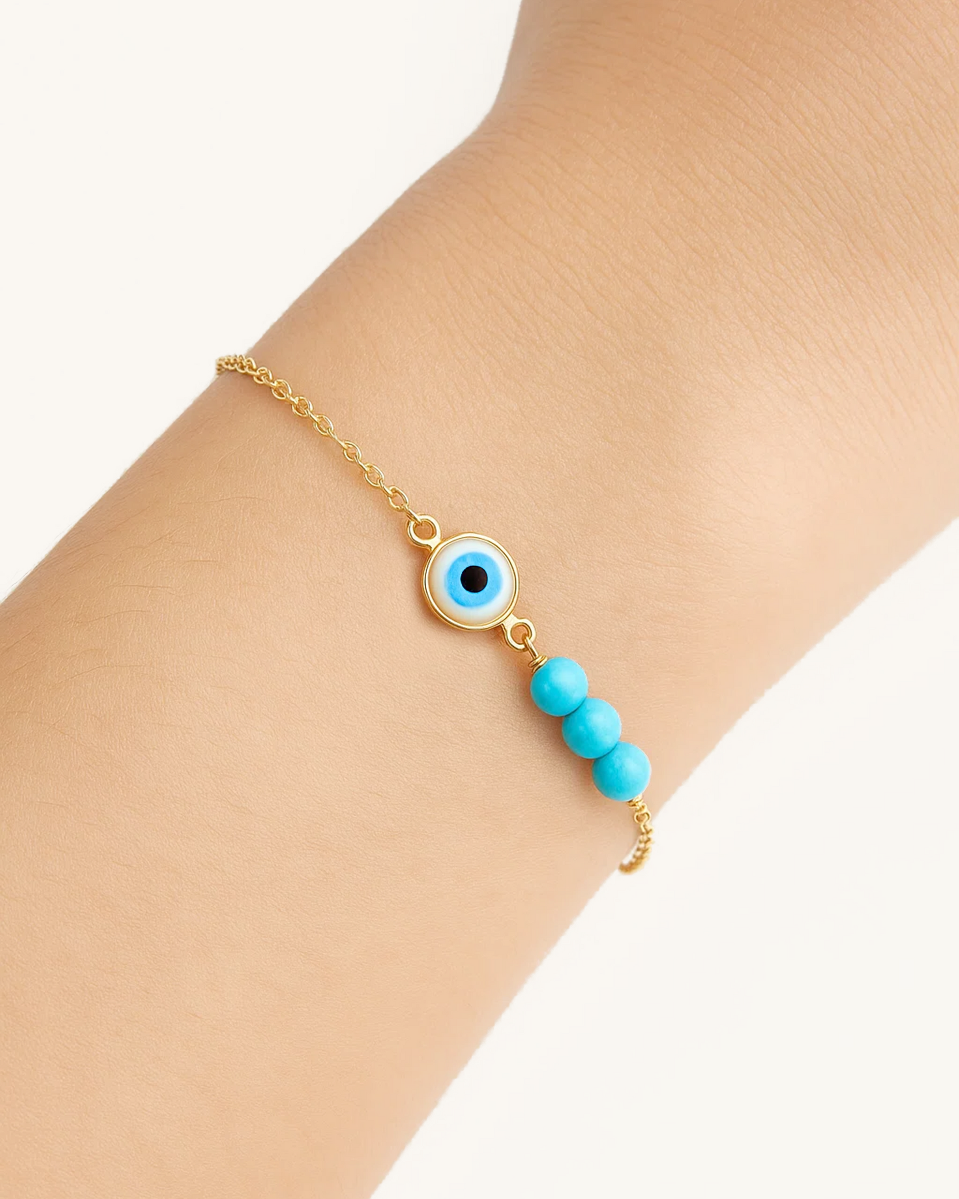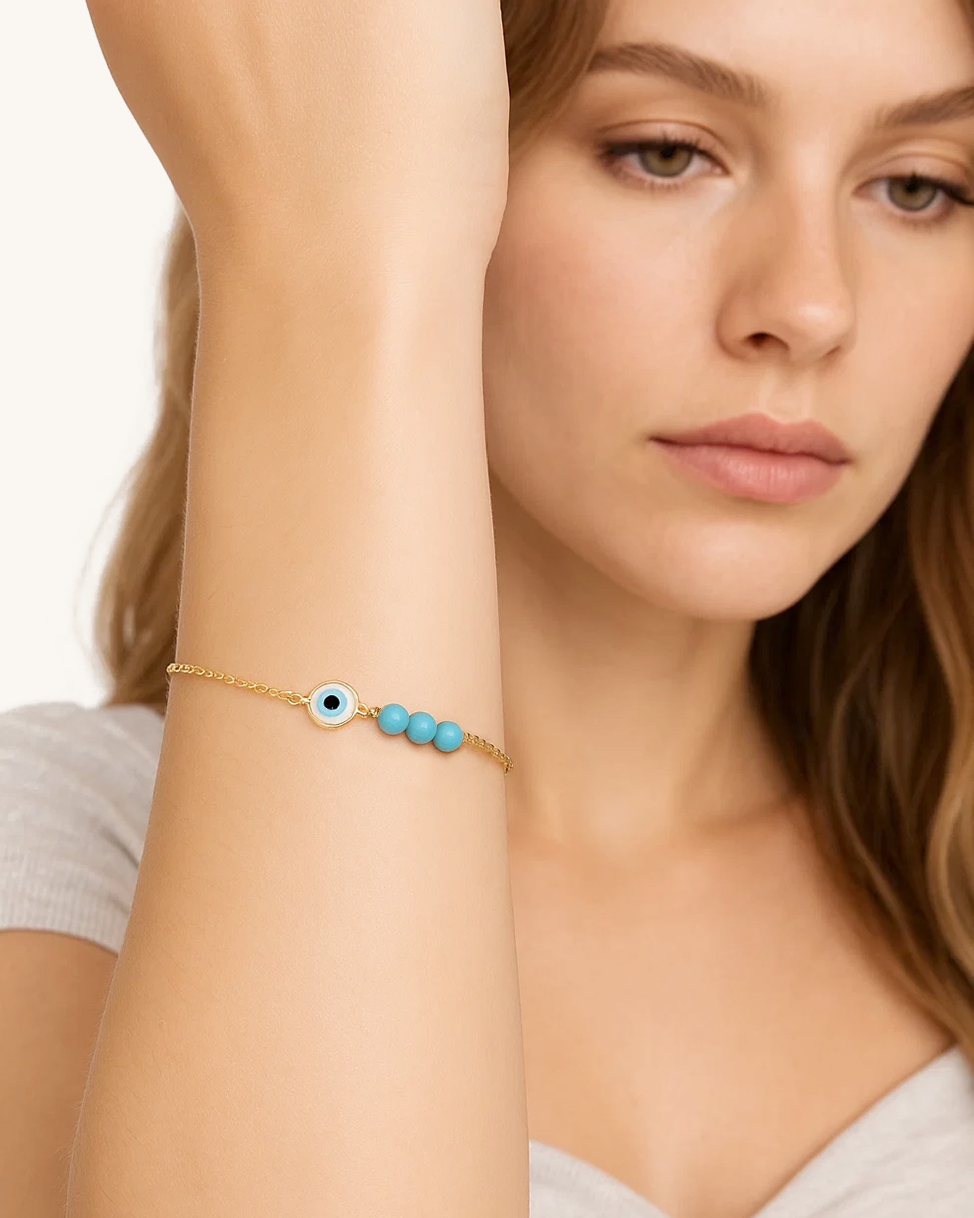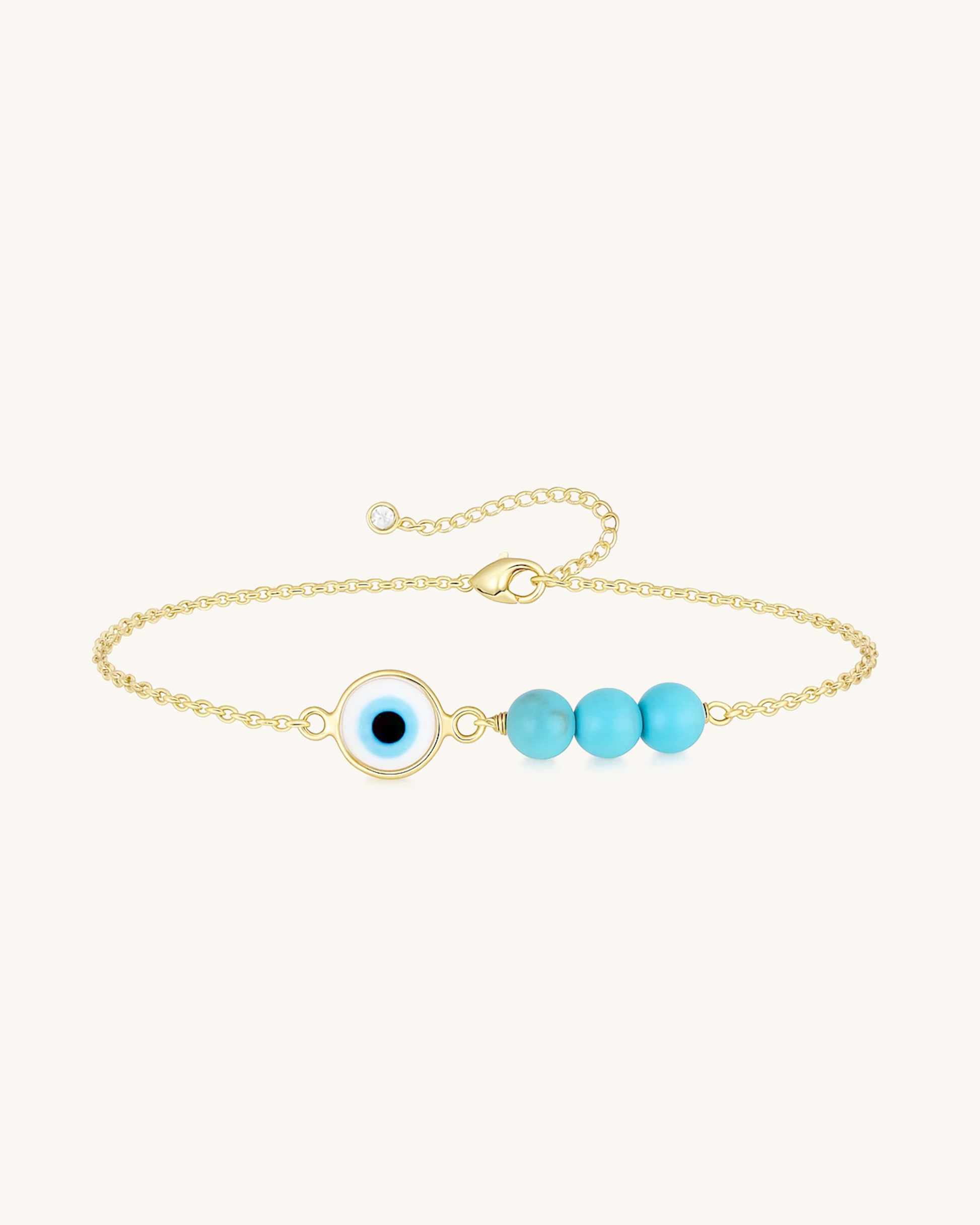 Symbolic and stylish, the Evil Eye Charm Bracelet features a protective blue evil eye charm paired with smooth turquoise-toned beads for a pop of color and meaning. Crafted from waterproof stainless steel with 18K gold or silver plating, this piece offers both everyday elegance and spiritual protection. Perfect for solo wear or stacking with your favorite lucky charms.