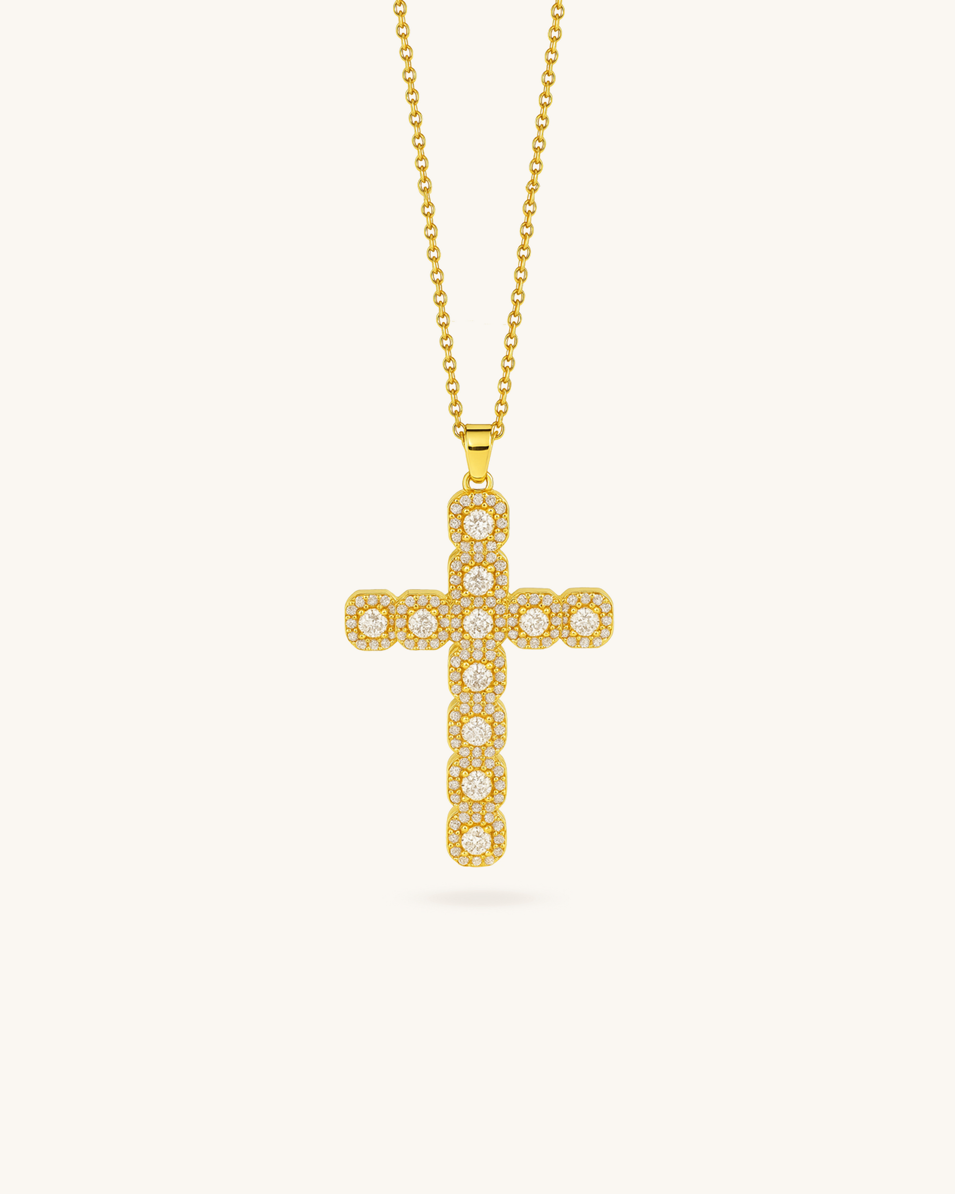 Command attention with the Full Shine Cross Pendant, featuring an oversized cross silhouette fully embellished with pavé-set cubic zirconia. Made from waterproof stainless steel and finished in luxurious 18K gold plating, this piece fuses spiritual symbolism with striking style. Perfect for layering or worn solo as a bold statement of faith and fashion.