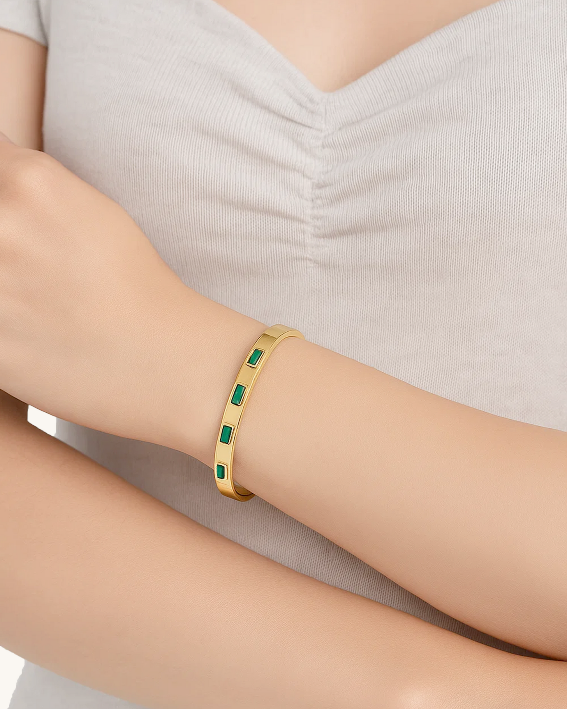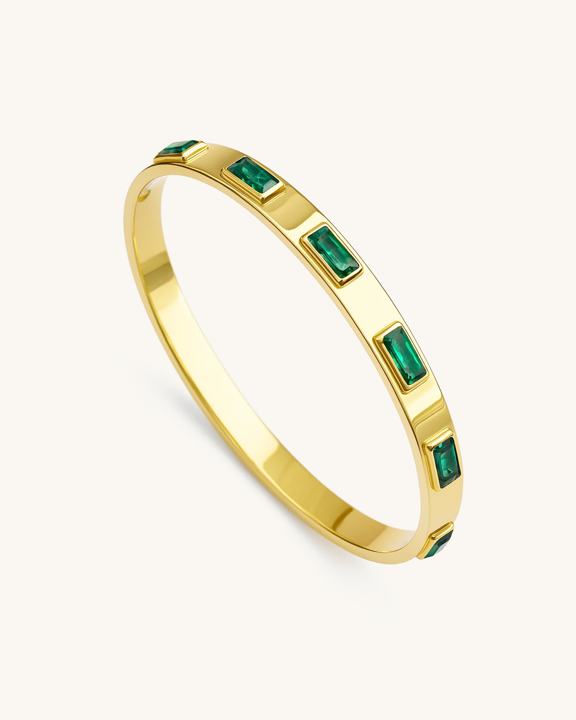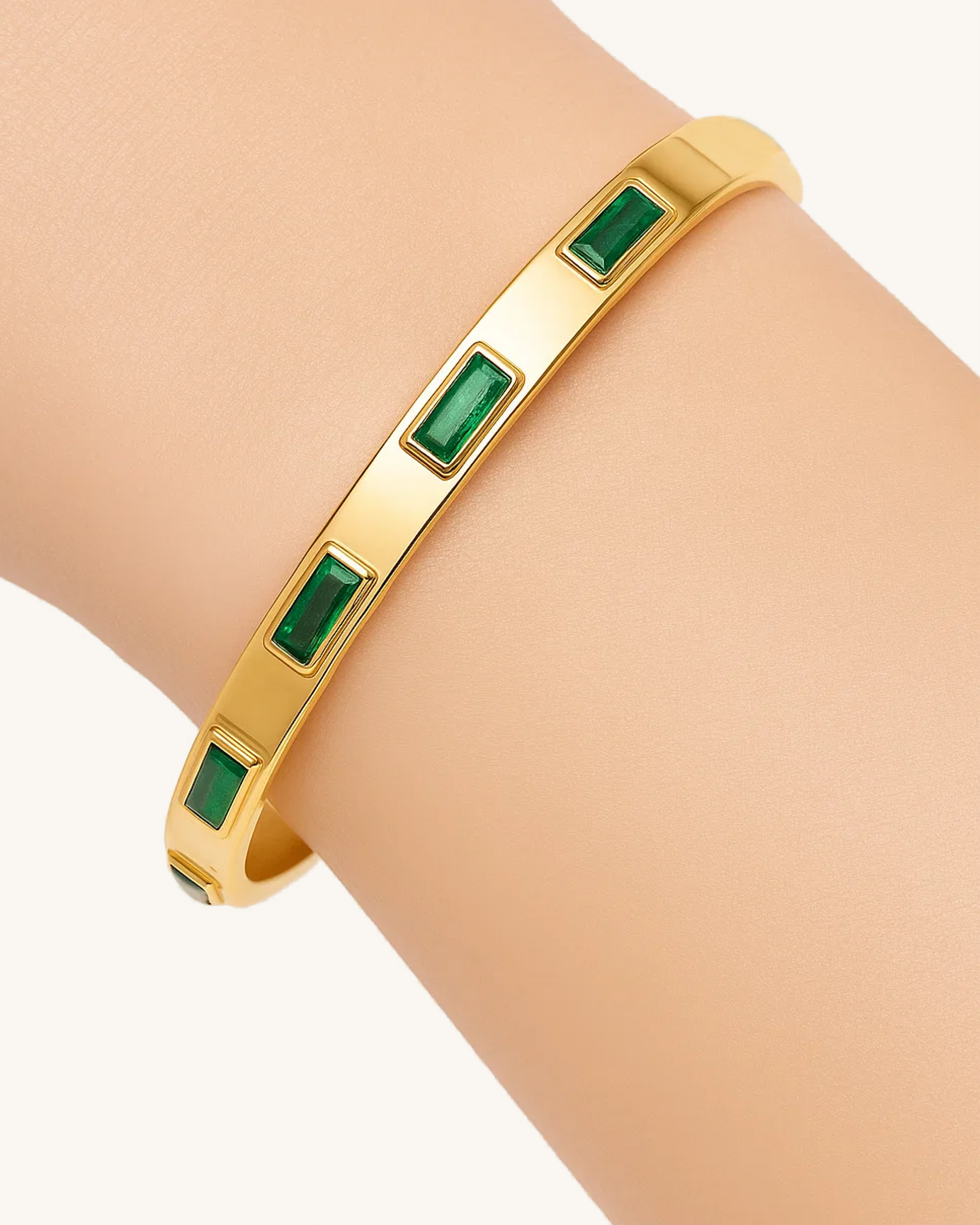 Vibrant and polished, the Green Inlay Bangle features a sleek waterproof band adorned with rectangular green cubic zirconia stones. The emerald-inspired layout adds a refined pop of color, while the slim 6mm profile makes it perfect for stacking or solo styling. Crafted from stainless steel and plated in 18K gold, it blends classic elegance with everyday wearability.
