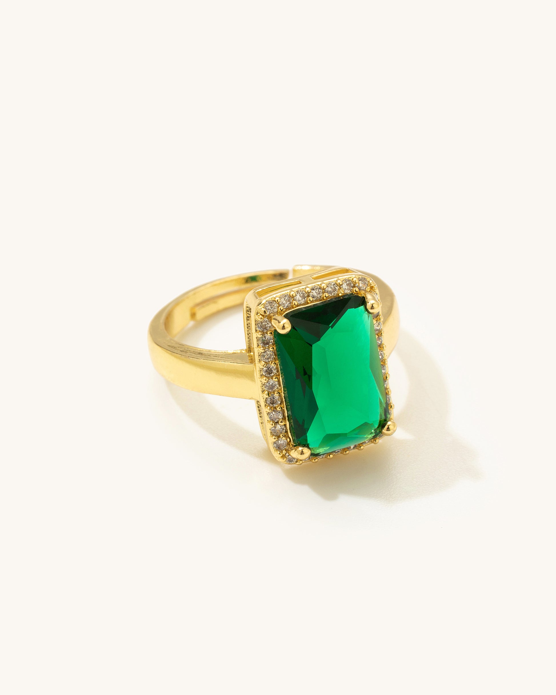 Add a bold pop of color with the Emerald Rectangle Ring. Featuring a vibrant green emerald-cut centerpiece surrounded by shimmering stones, this statement design embodies confidence and sophistication. Perfect for elevating any look.