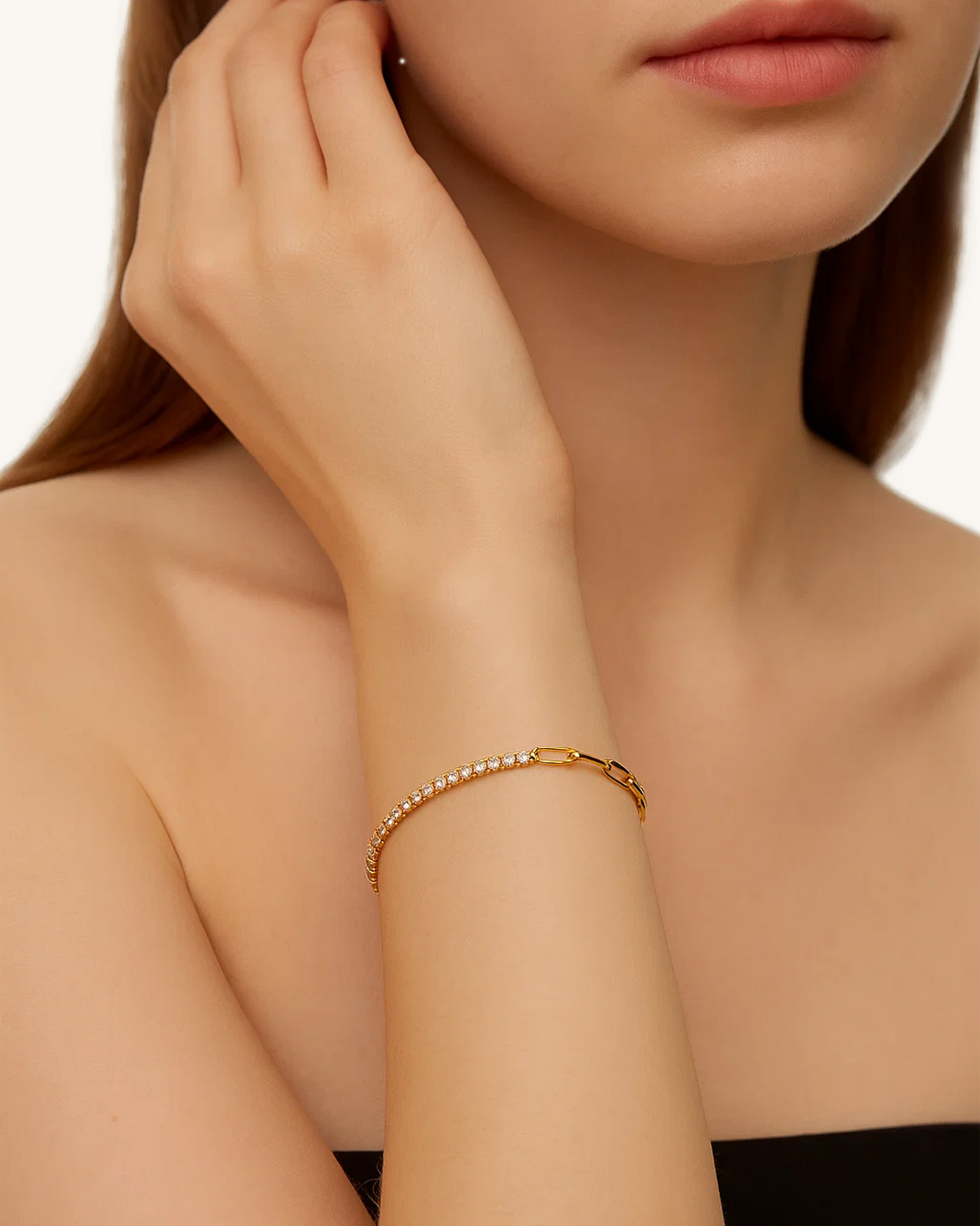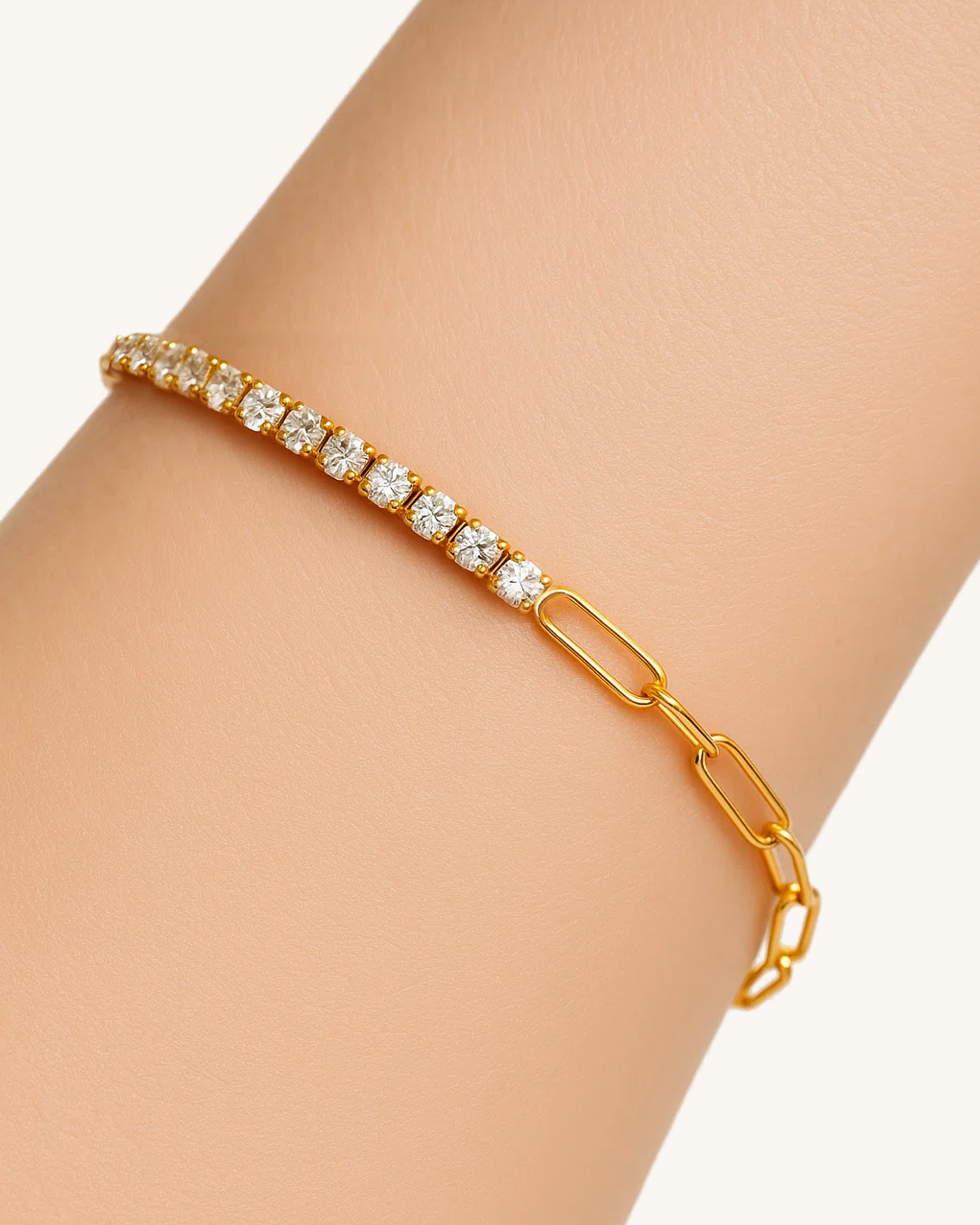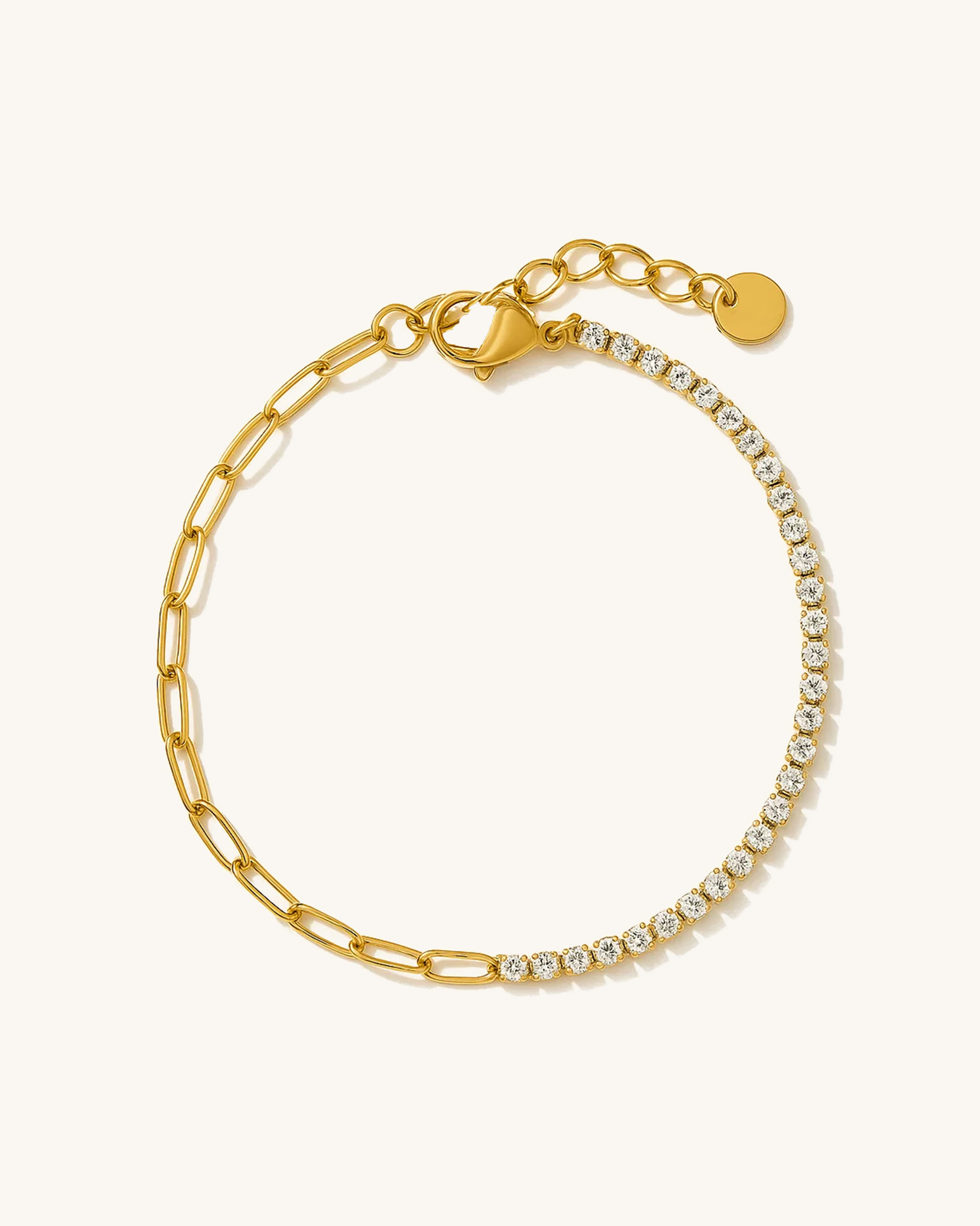 Modern and minimal, the Half Tennis Chain Bracelet features a unique half-and-half design—one side lined with brilliant pavé cubic zirconia, the other styled with sleek paperclip chain links. Made from waterproof stainless steel and finished in 14K gold or silver plating, it blends shine and structure for everyday elegance or easy stacking.