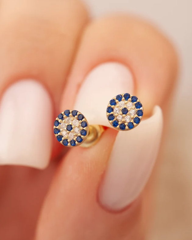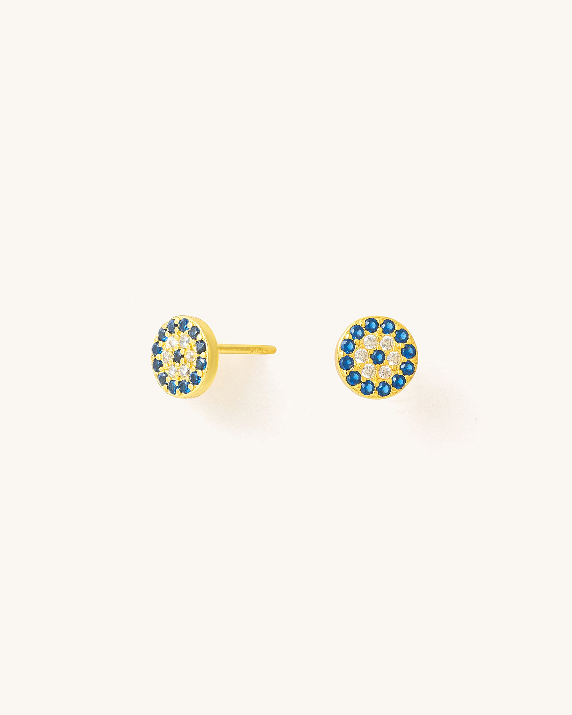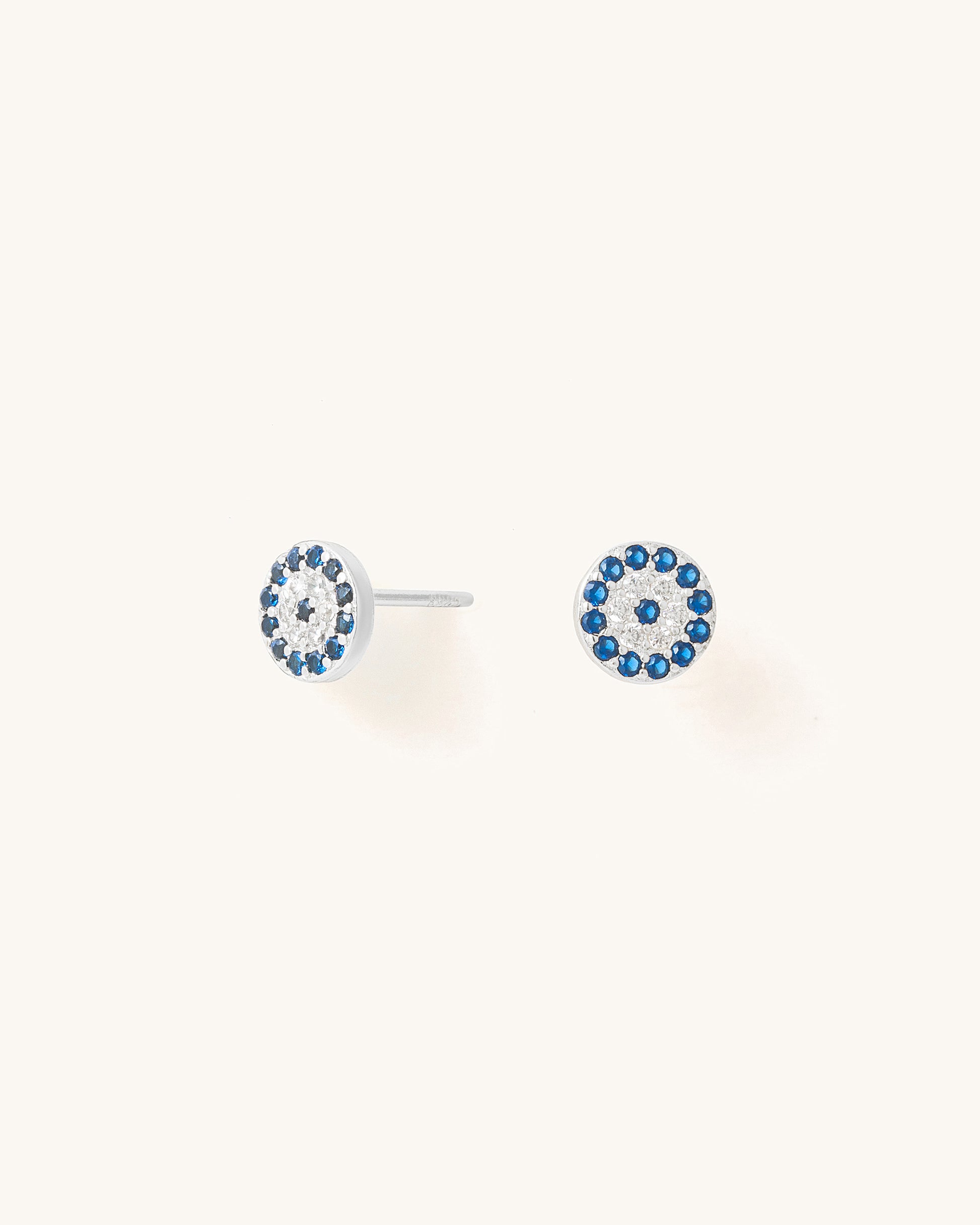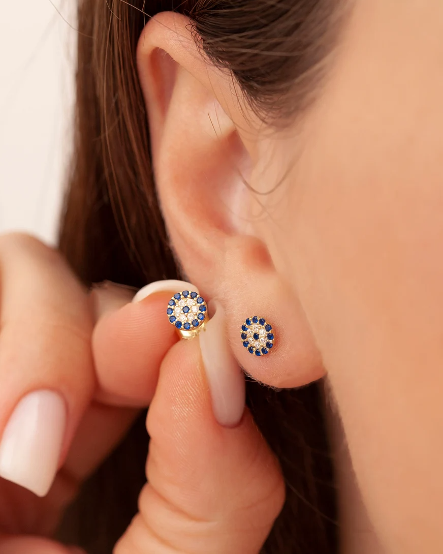 Subtle yet striking, the Demon Eye Mini Studs feature a delicate round design paved with sparkling blue and white stones. Perfect for adding a protective charm to your everyday jewelry stack.