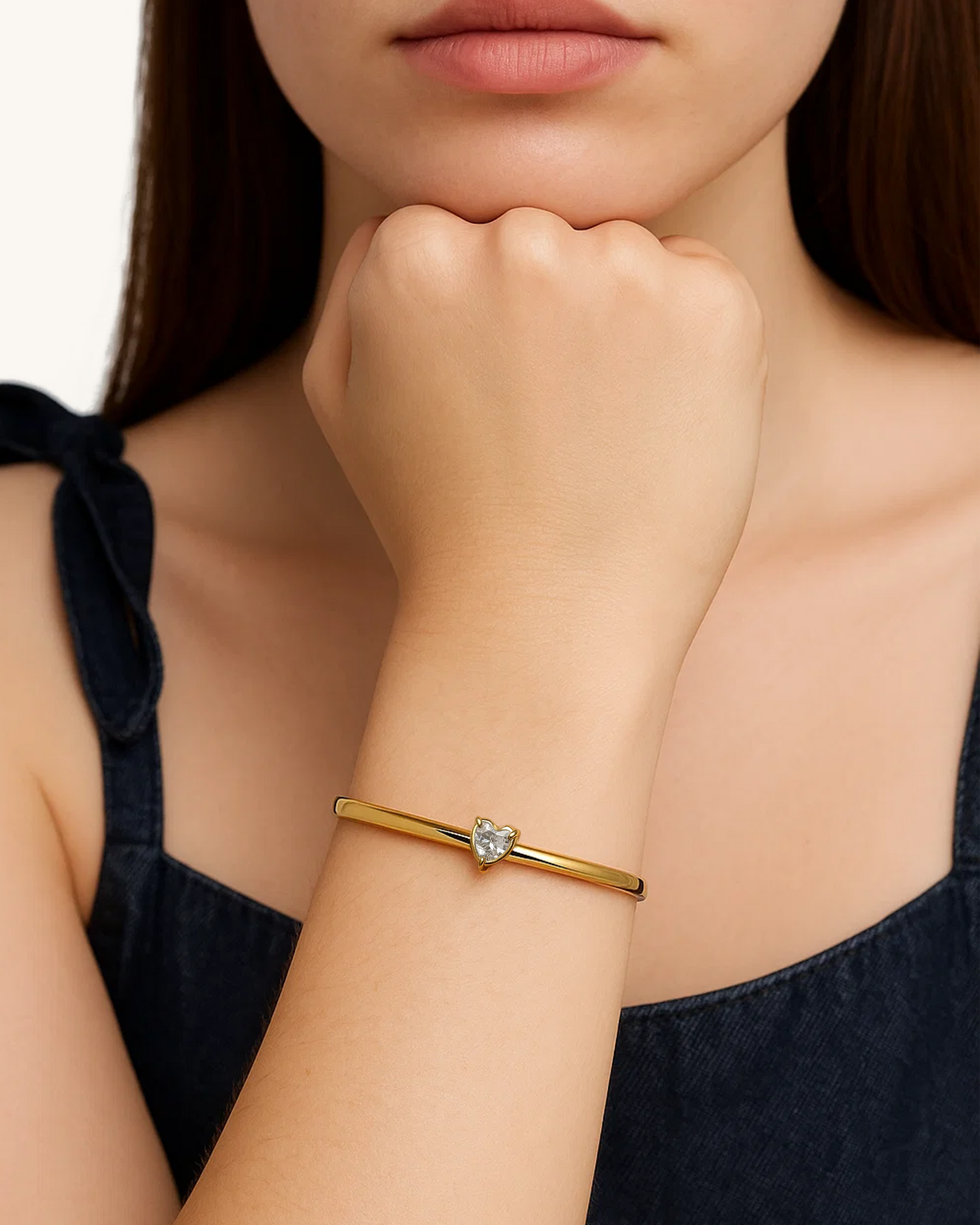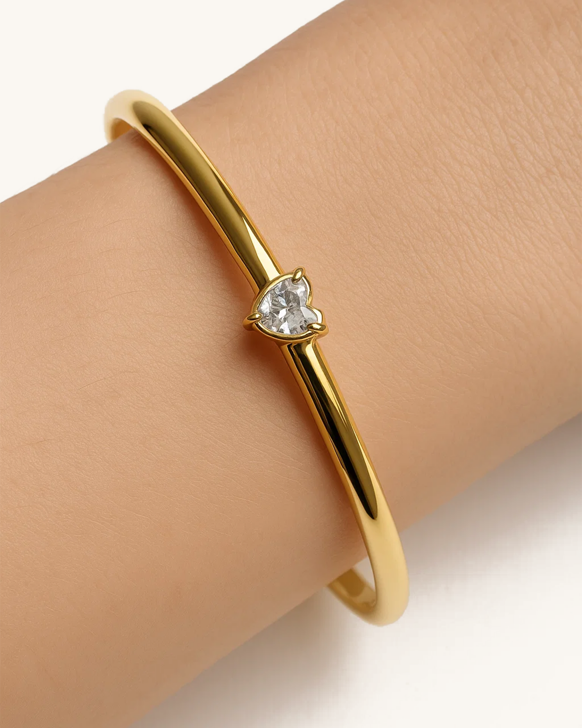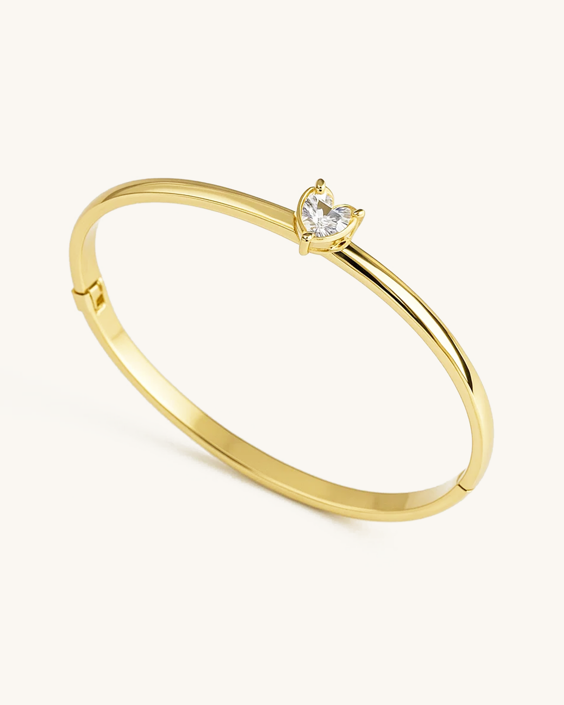 Subtle and romantic, the Heart Solitaire Bangle features a sleek polished band with a single heart-cut cubic zirconia at the center. Its minimalist design makes it perfect for daily wear or special moments. Crafted in waterproof stainless steel with gold or silver plating, this timeless bracelet is a delicate expression of love and elegance.