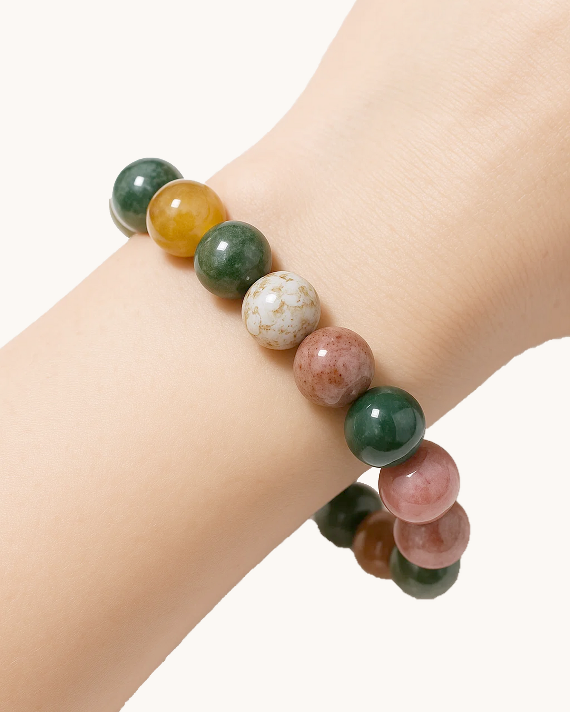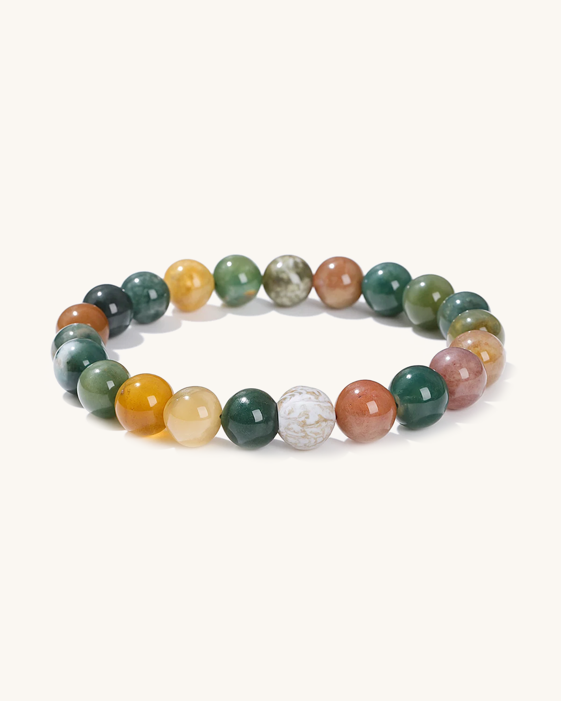 Earthy and centering, the India Agate Bracelet features 8mm smooth round beads in rich, grounding tones—ranging from deep green and rust red to soft mustard and ivory. Revered for its ability to bring emotional stability, protection, and connection to the earth, India Agate is a perfect stone for those seeking calm in chaos and strength in stillness.