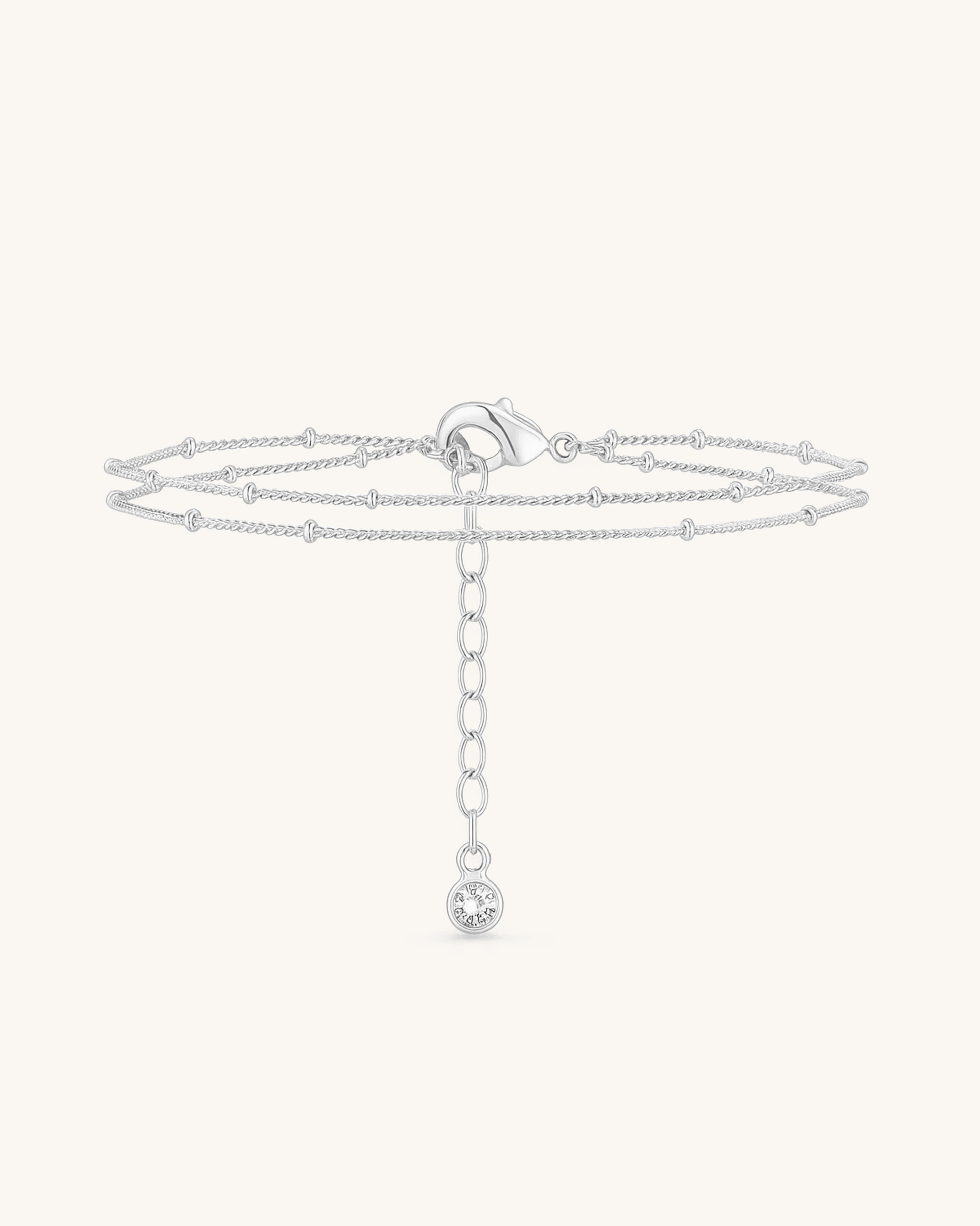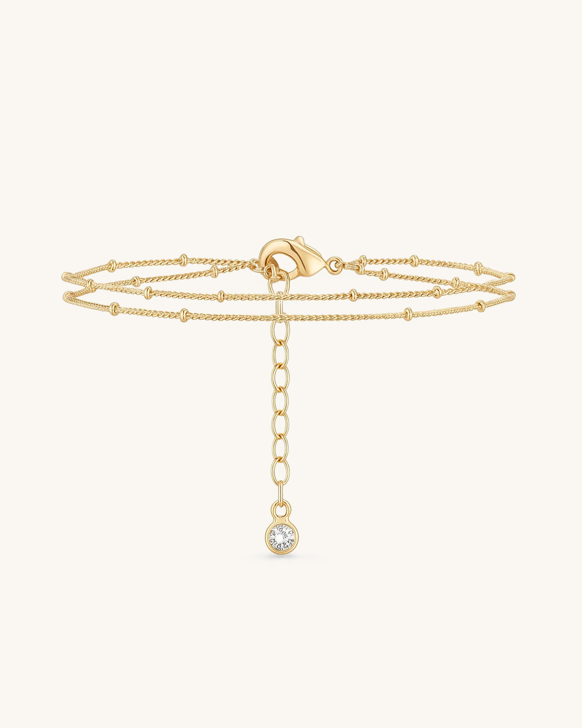 Delicate and modern, the Layer Drop Chain Bracelet features three fine beaded chains and a single cubic zirconia charm at the end of a dainty dangling extender. Crafted from waterproof stainless steel and available in 18K gold or silver plating, this bracelet adds soft shimmer and airy elegance to your wrist. Ideal for layering or wearing solo for a minimalist statement.
