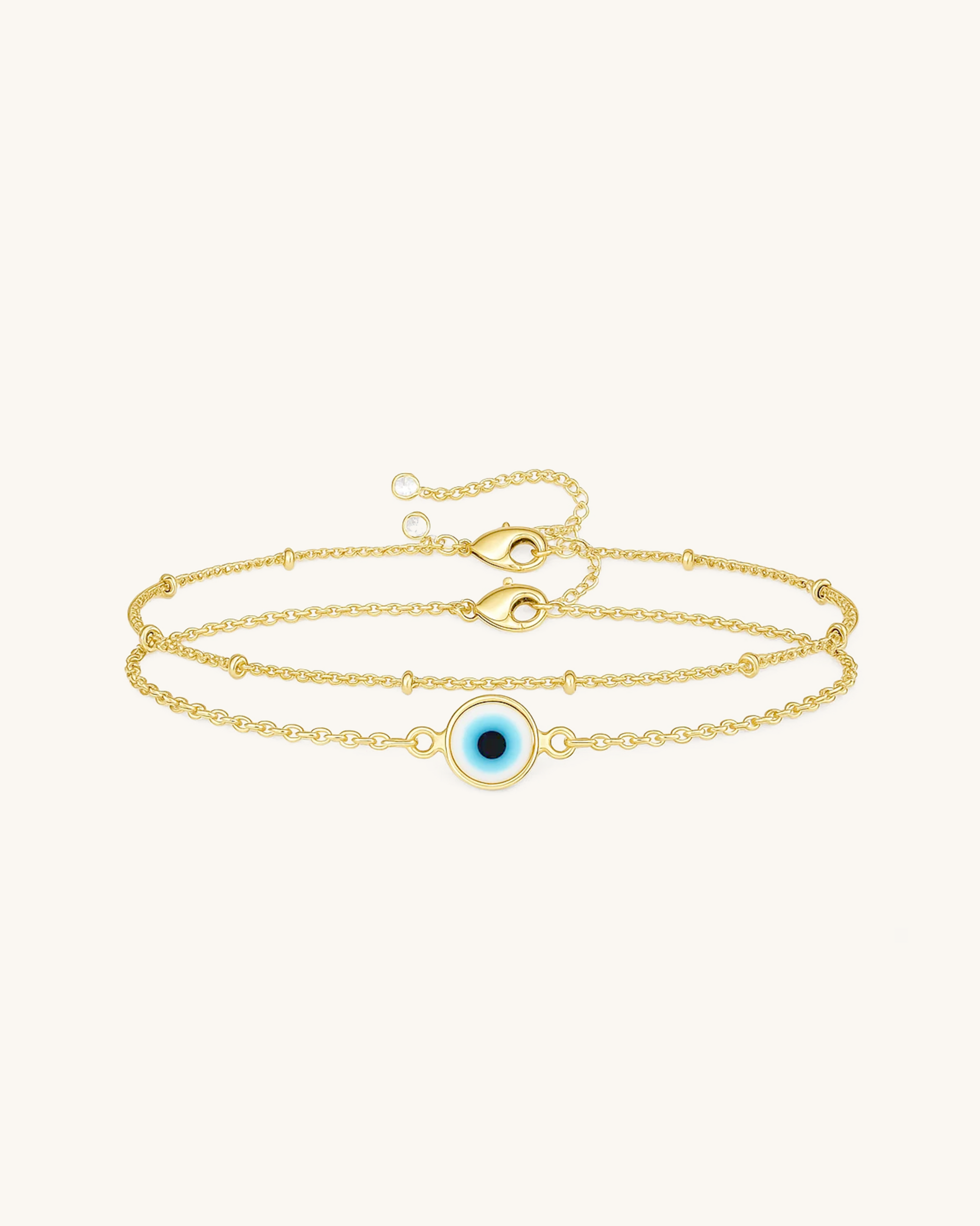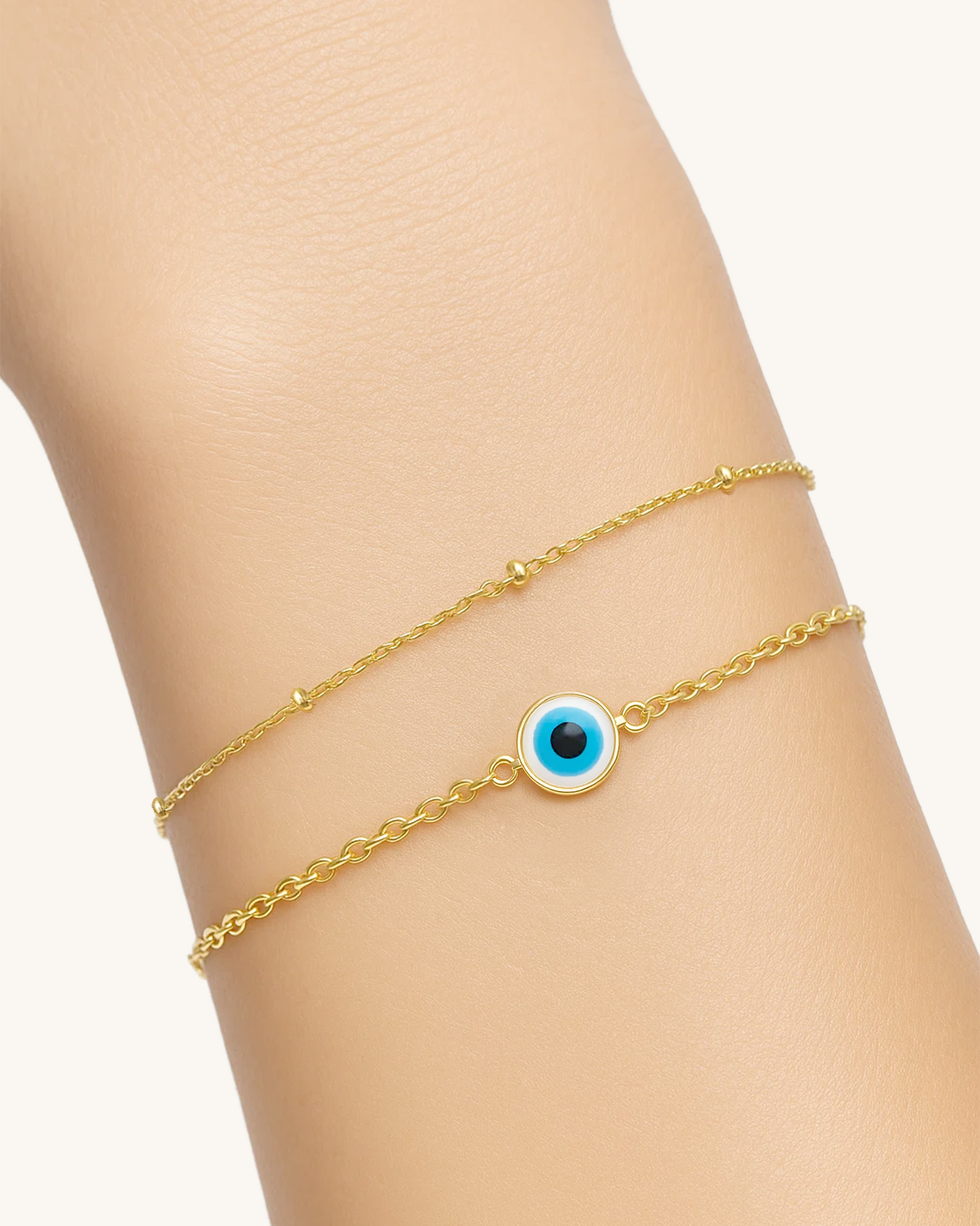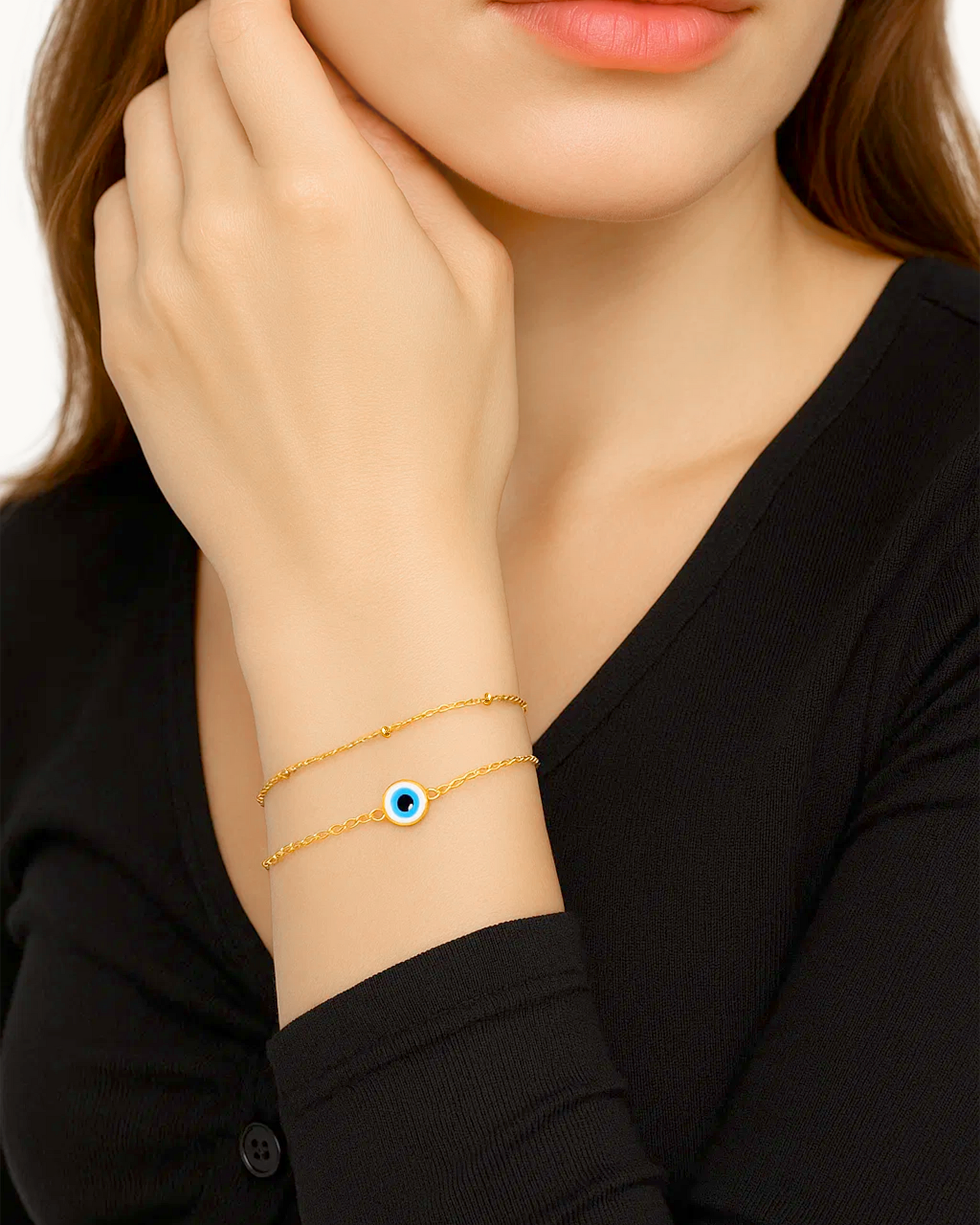 Designed for both style and symbolism, the Layer Evil Eye Bracelet features two delicate chains—one minimalist, one adorned with a blue evil eye charm said to ward off negative energy and attract good luck. Crafted from waterproof stainless steel and plated in 18K gold, it’s the perfect piece for layering or wearing solo with intention and grace.