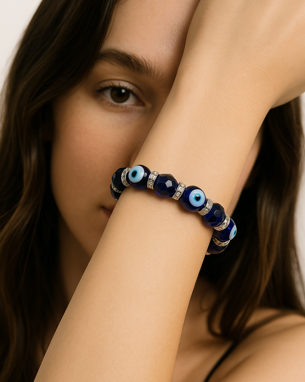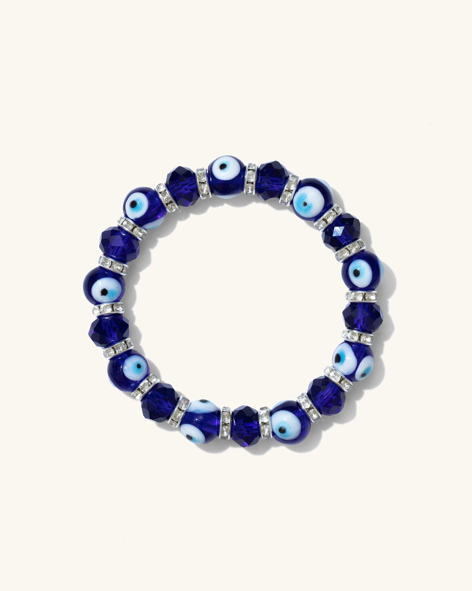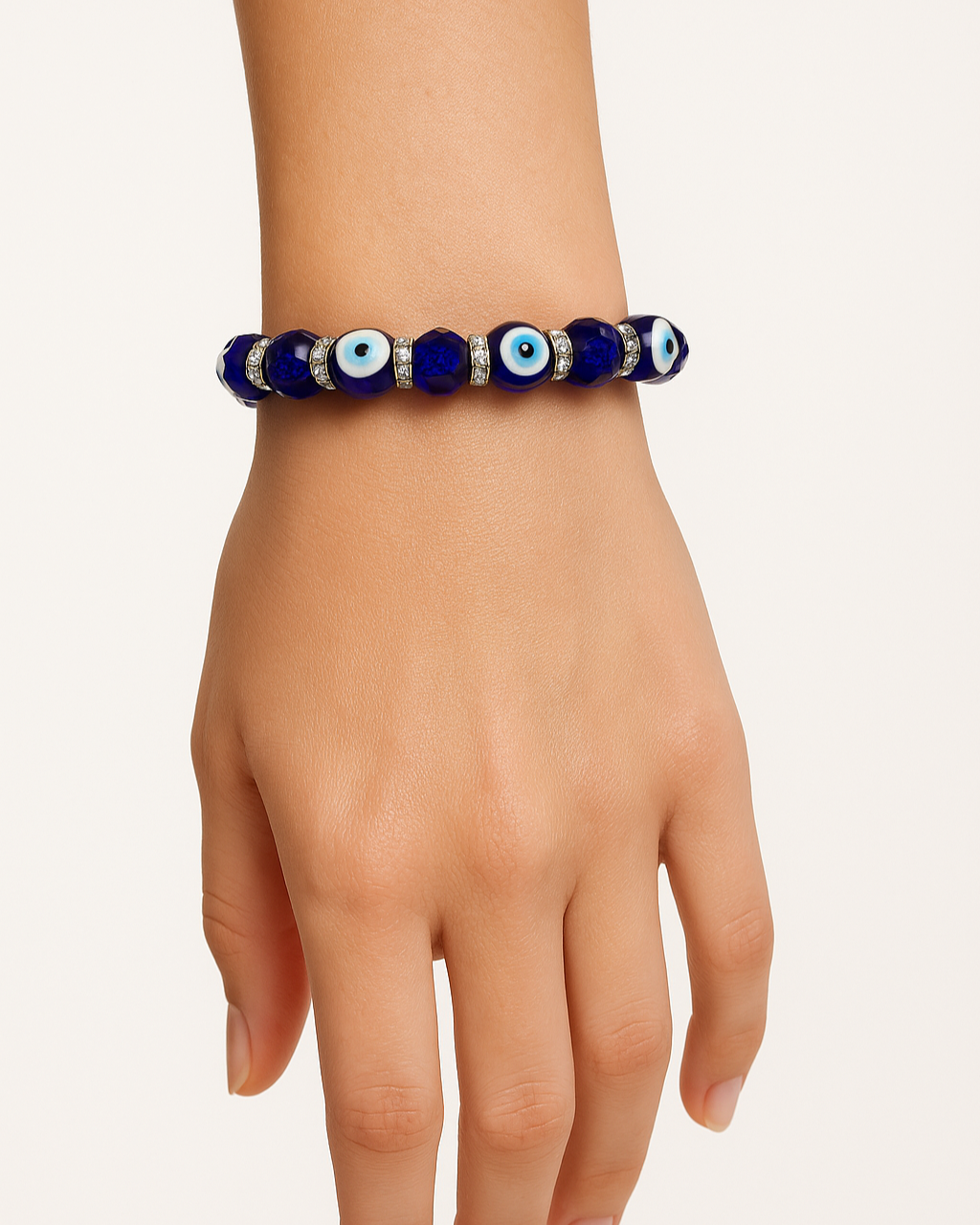 Carry a symbol of good luck and protection wherever you go with the Dark Blue Demon Eye Bracelet. Designed with deep blue faceted crystal beads and signature evil eye glass charms, this stretch bracelet adds a bold, meaningful touch to any outfit.