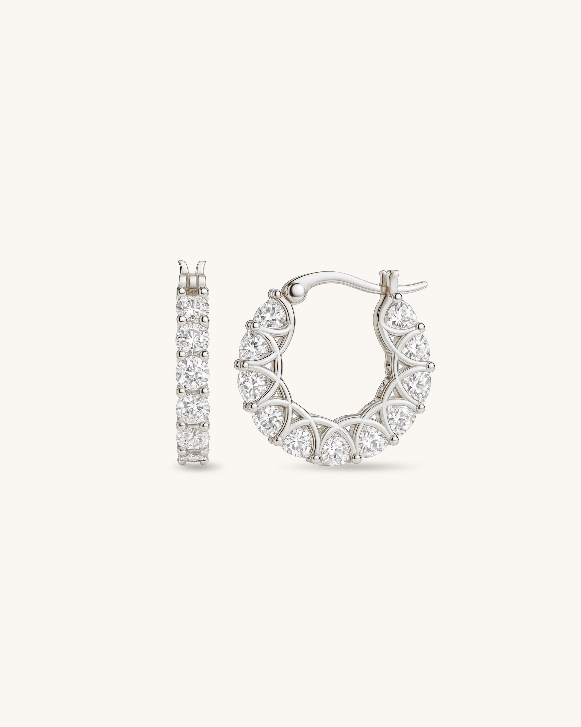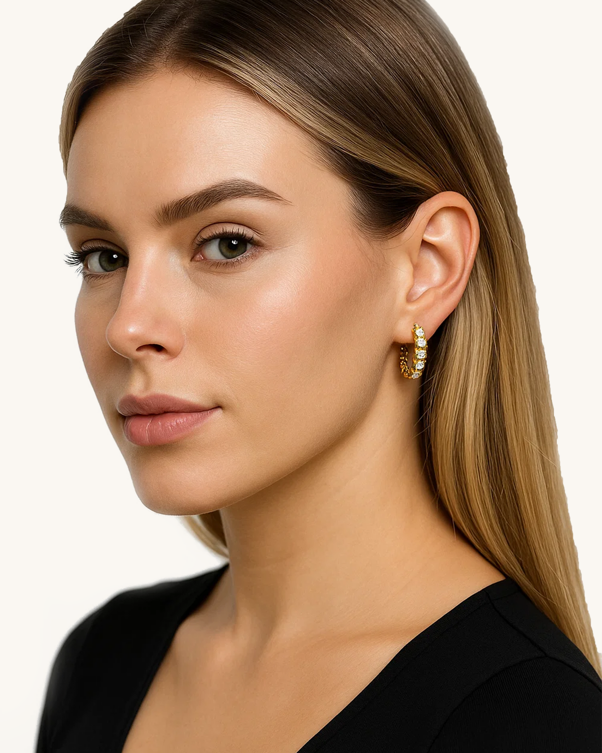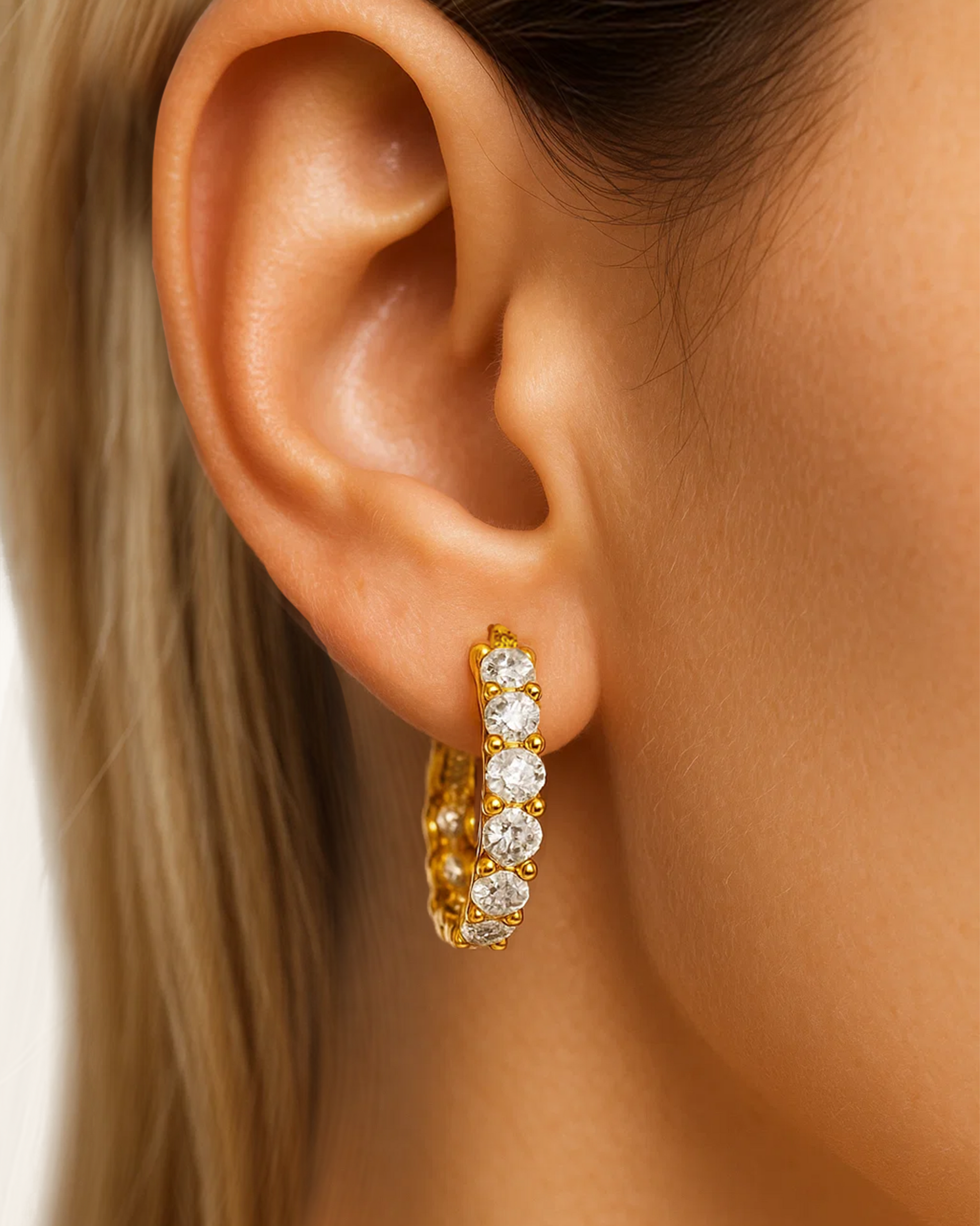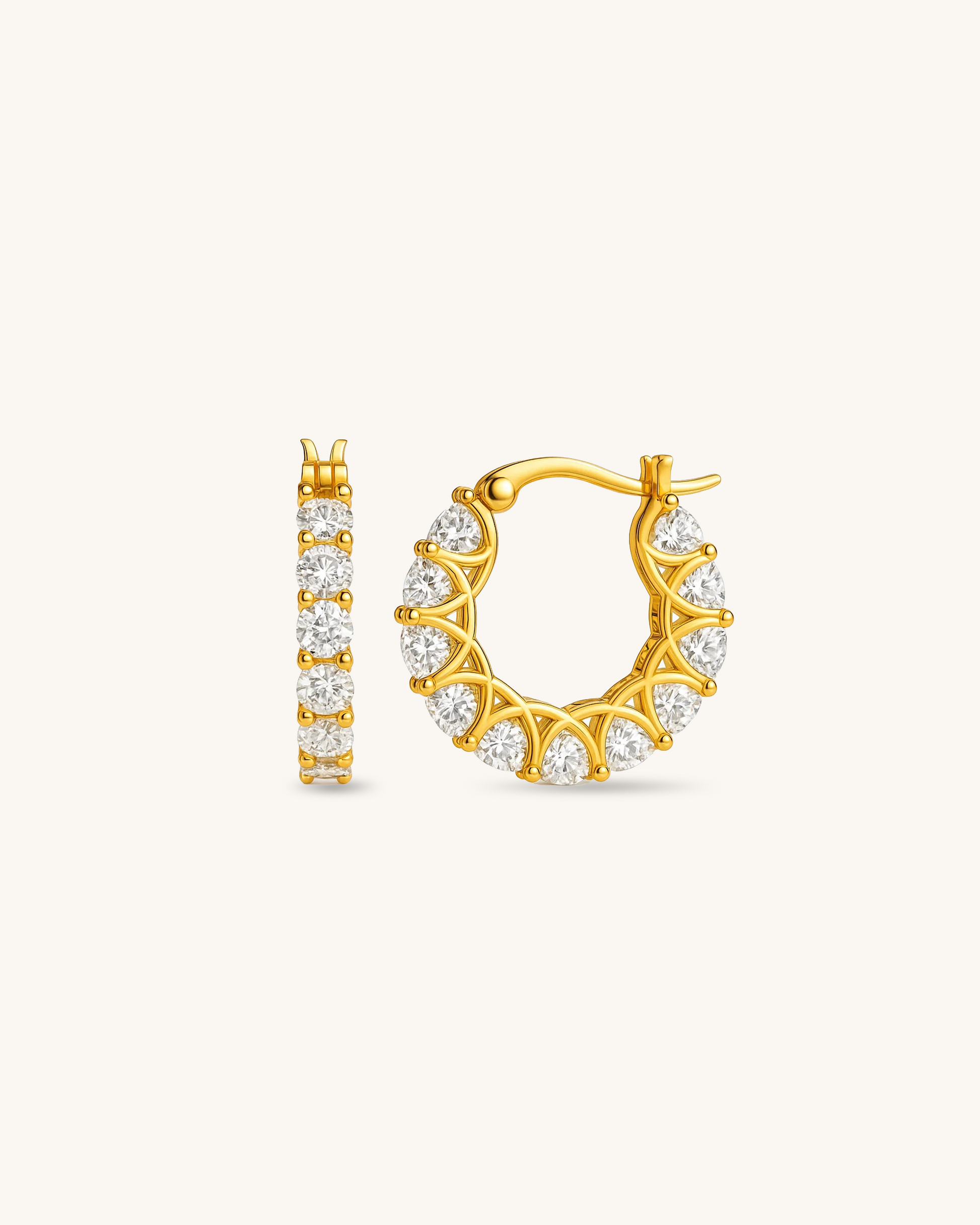 Bold and refined, the Luxe CZ Hoop Earrings feature a full front of brilliant round-cut cubic zirconia framed in a delicate open lattice setting. The structured arc creates a dimensional shine from every angle, making them the perfect blend of statement and sophistication. Ideal for evening wear, special occasions, or elevating your everyday style.