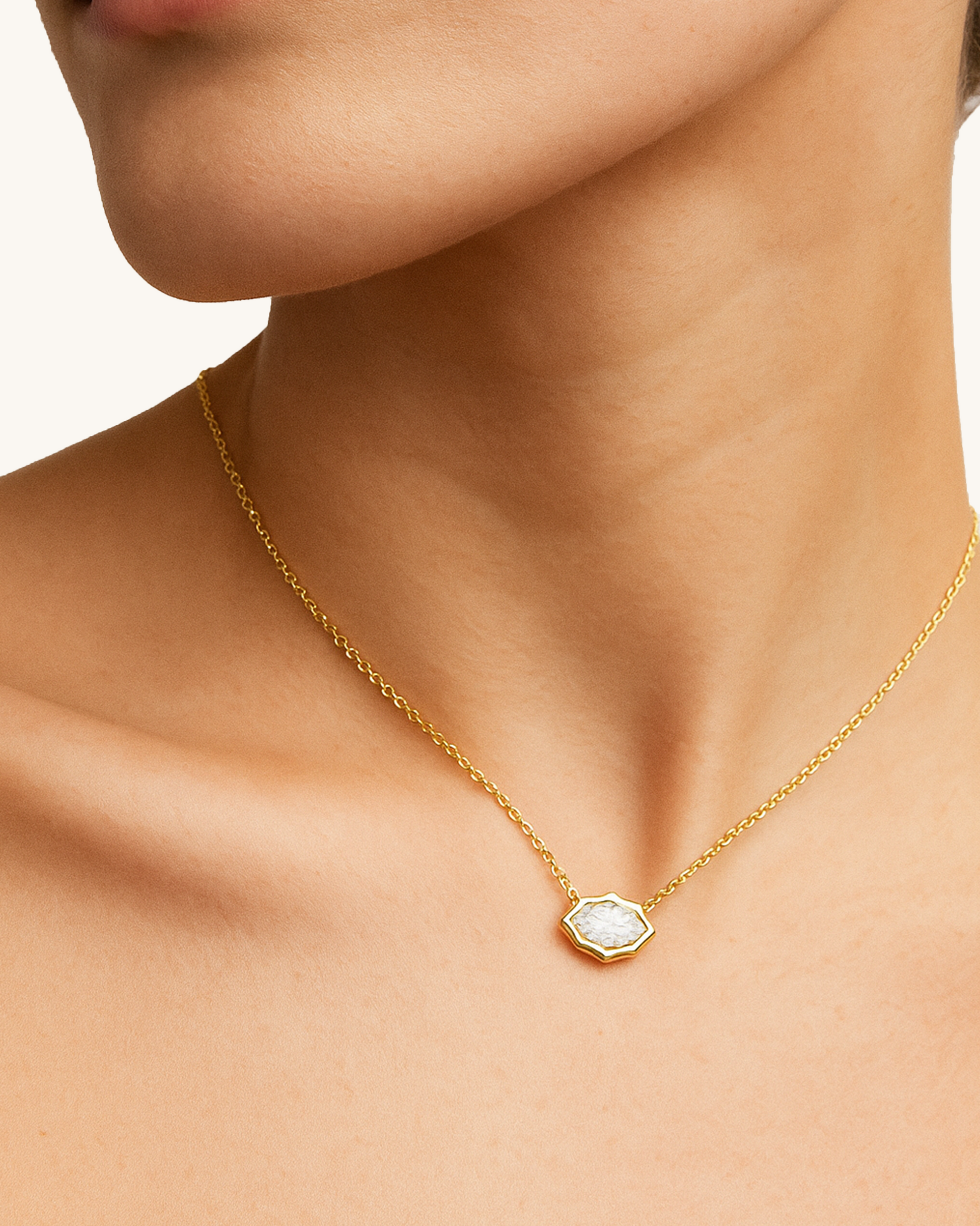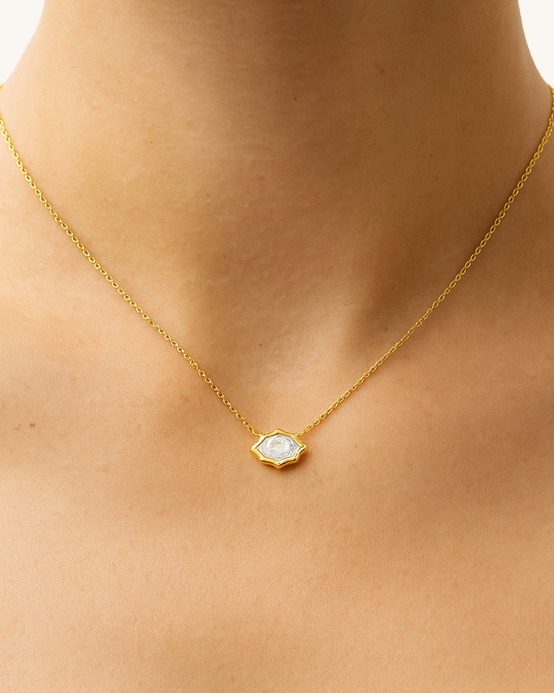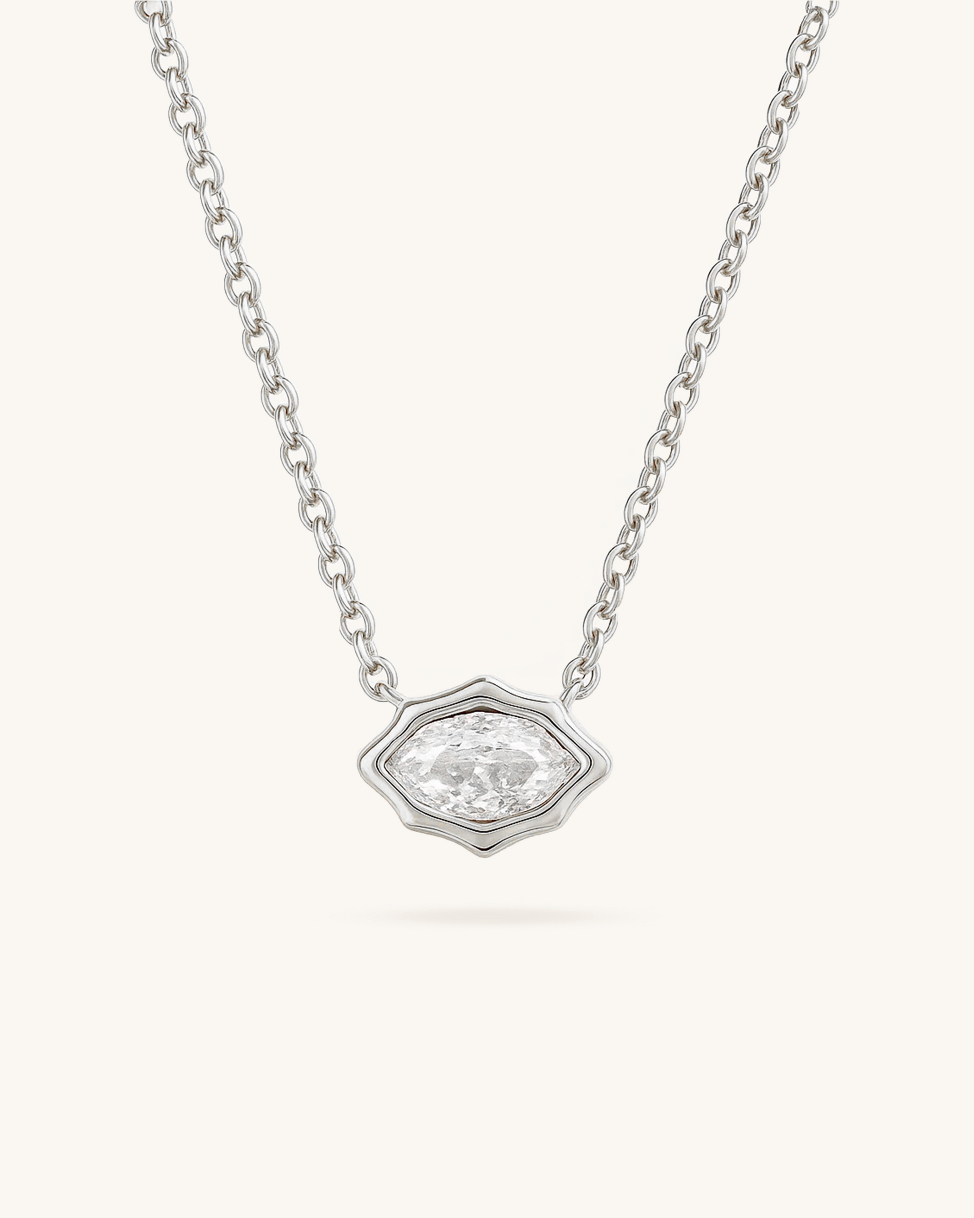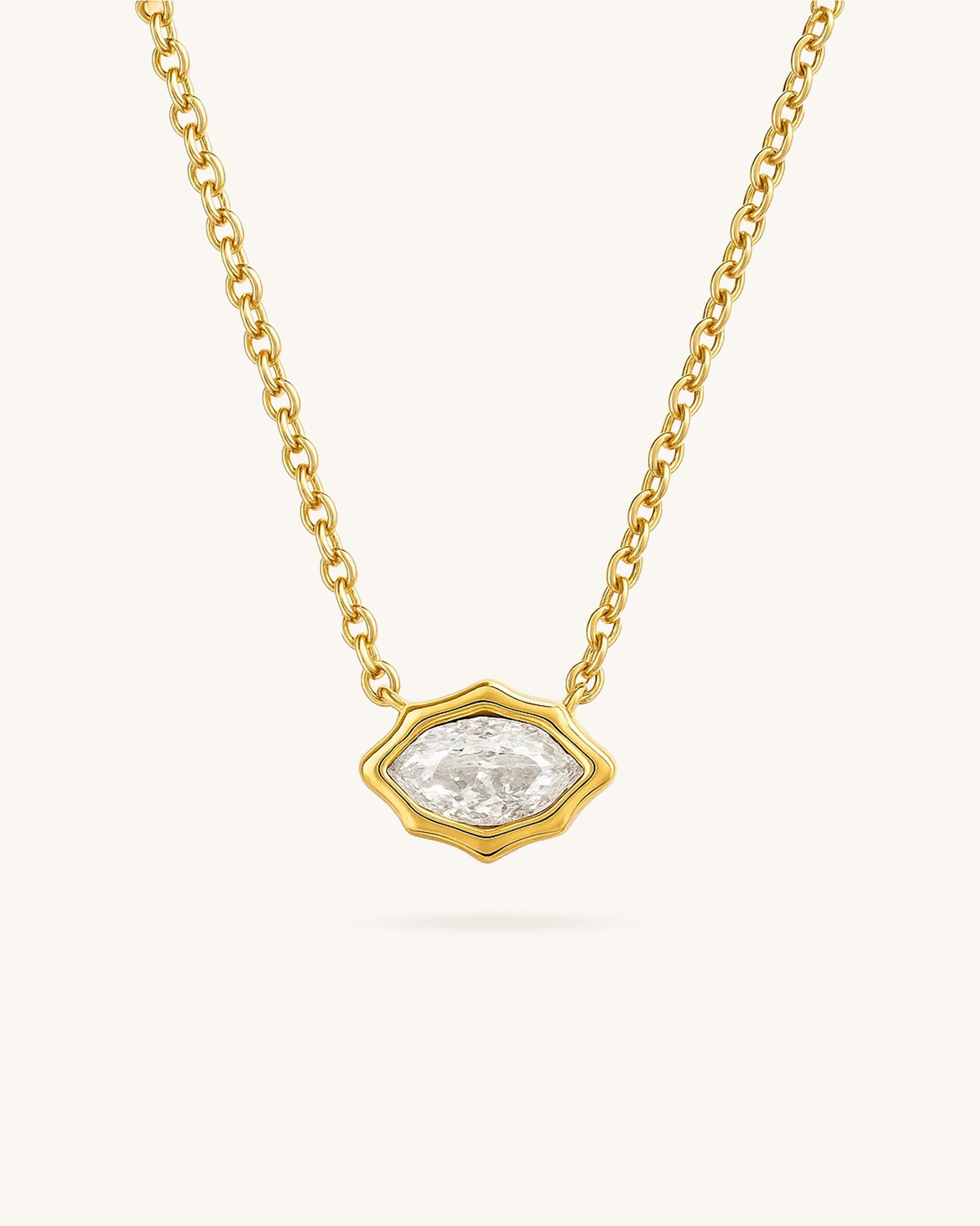 Sleek and sculptural, the Marquise Frame Necklace features a unique faceted center stone set within a decorative marquise-shaped bezel frame. With its soft curves and elegant proportions, this pendant offers just the right touch of sparkle for everyday wear. Available in gold or silver finish, it layers beautifully or shines on its own.