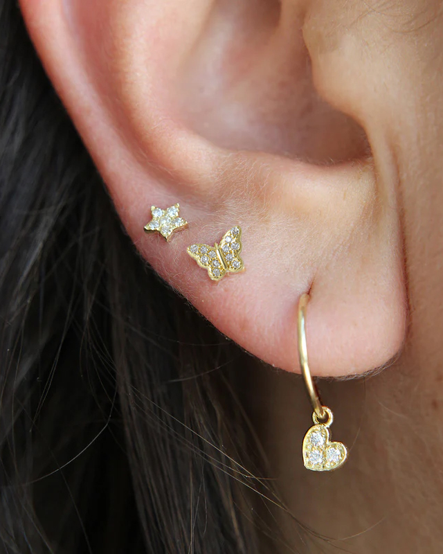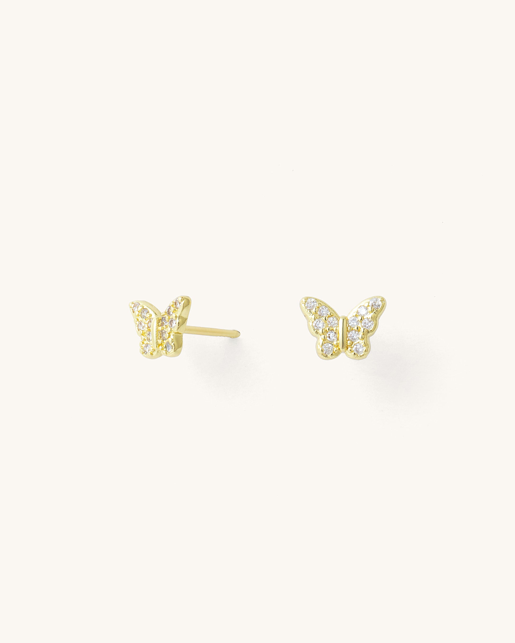 Delicate and playful, the Butterfly Stud Earrings feature a dainty butterfly silhouette adorned with shimmering cubic zirconia. Available in both gold-plated and silver-plated finishes, these earrings add a touch of whimsy and sparkle to your everyday style, perfect for stacking or wearing solo.