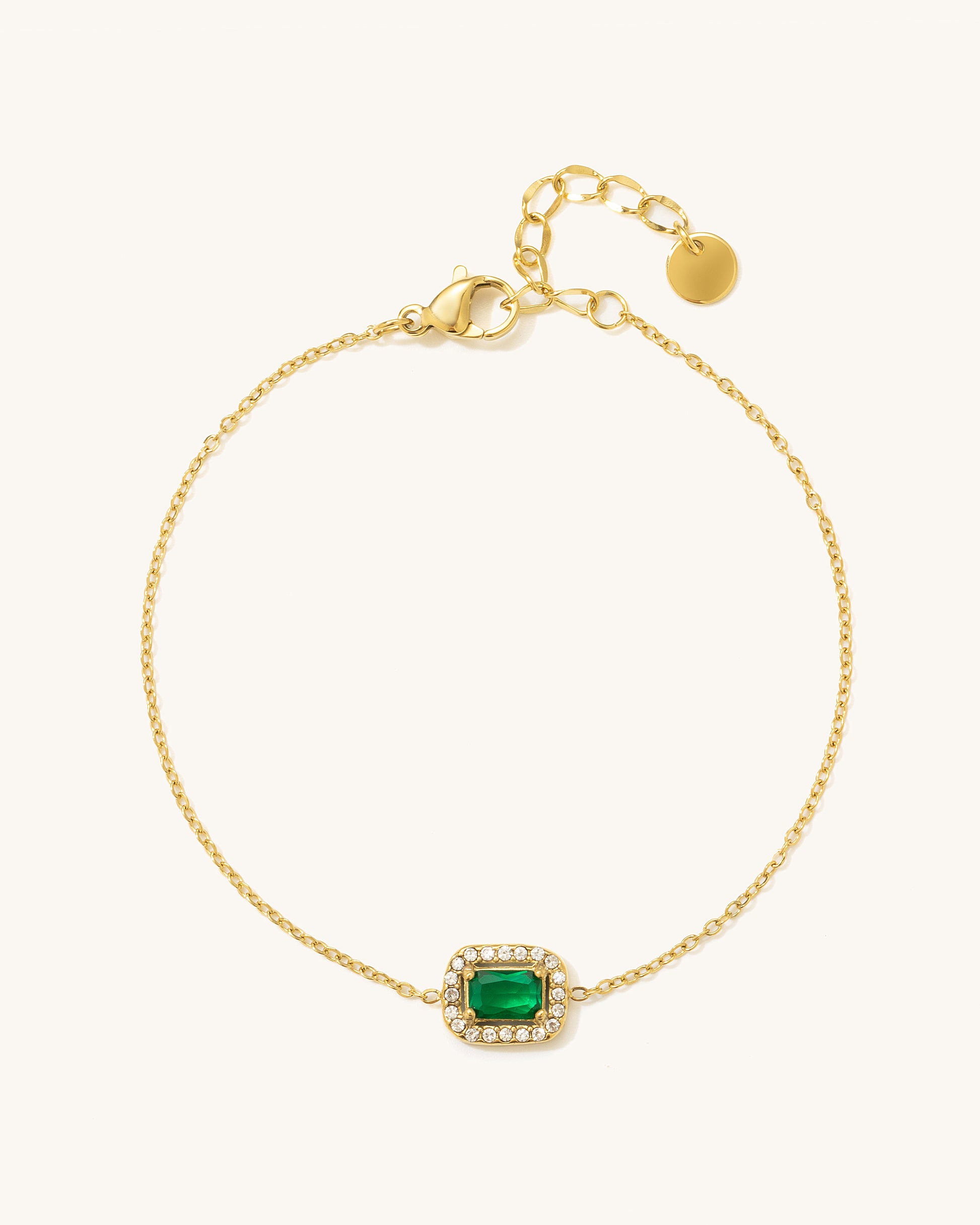 Subtle yet striking, the Mini Green Bracelet features a petite emerald-toned stone framed with sparkling cubic zirconia. Set on a fine gold-plated stainless steel chain, this delicate piece adds just the right touch of color and shine to your everyday style. Perfect for layering or wearing solo for an understated pop of green.