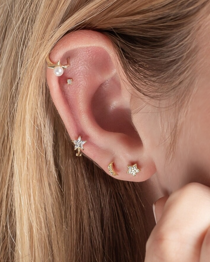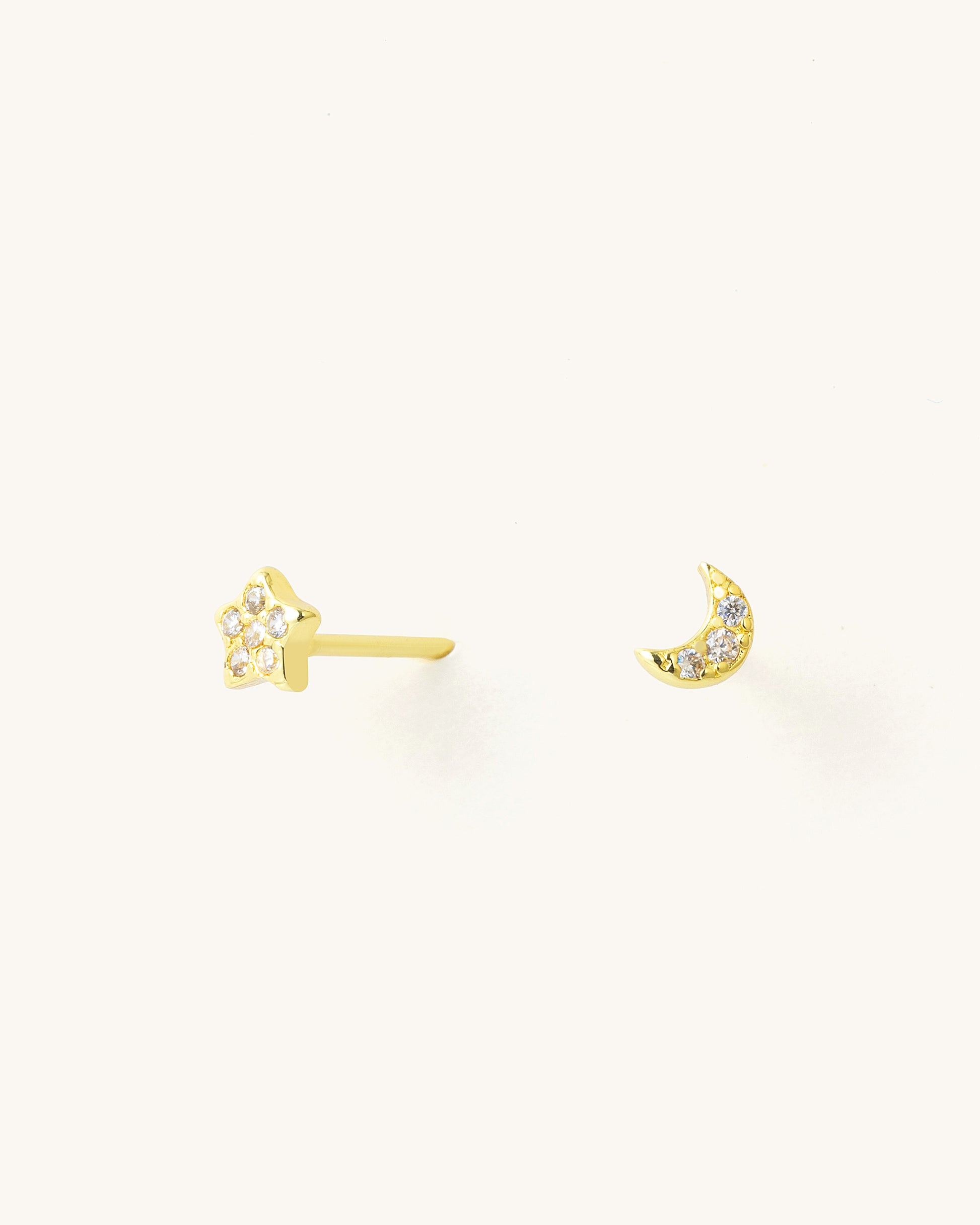 Delicate and playful, the Moon and Star Stud Earrings feature a sparkling crescent moon paired with a twinkling star, each adorned with shimmering cubic zirconia. Available in both gold-plated and silver-plated finishes, this mismatched set adds a whimsical charm to your everyday look, perfect for stacking or wearing solo.