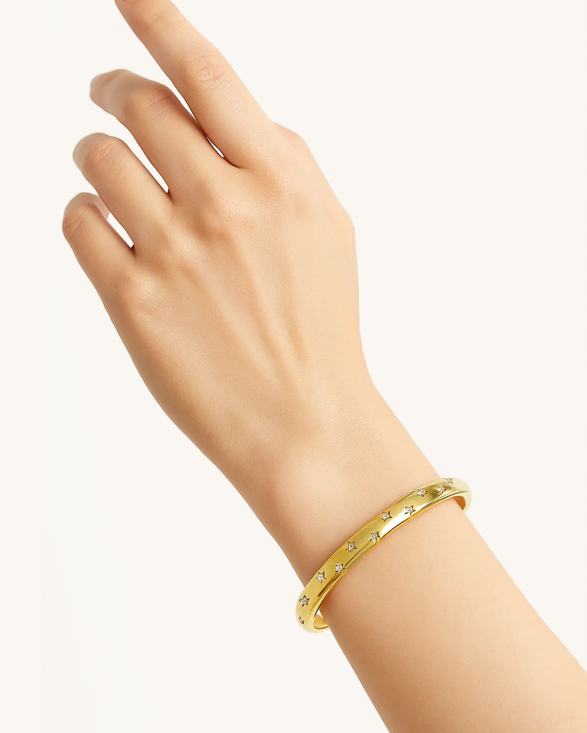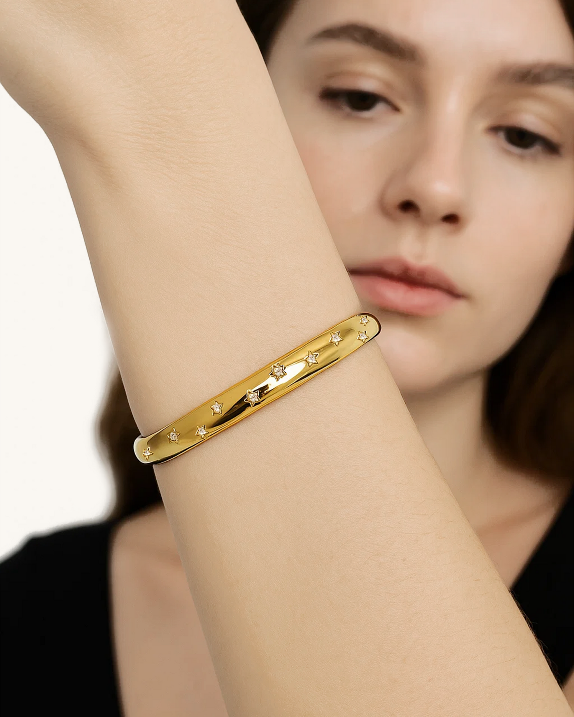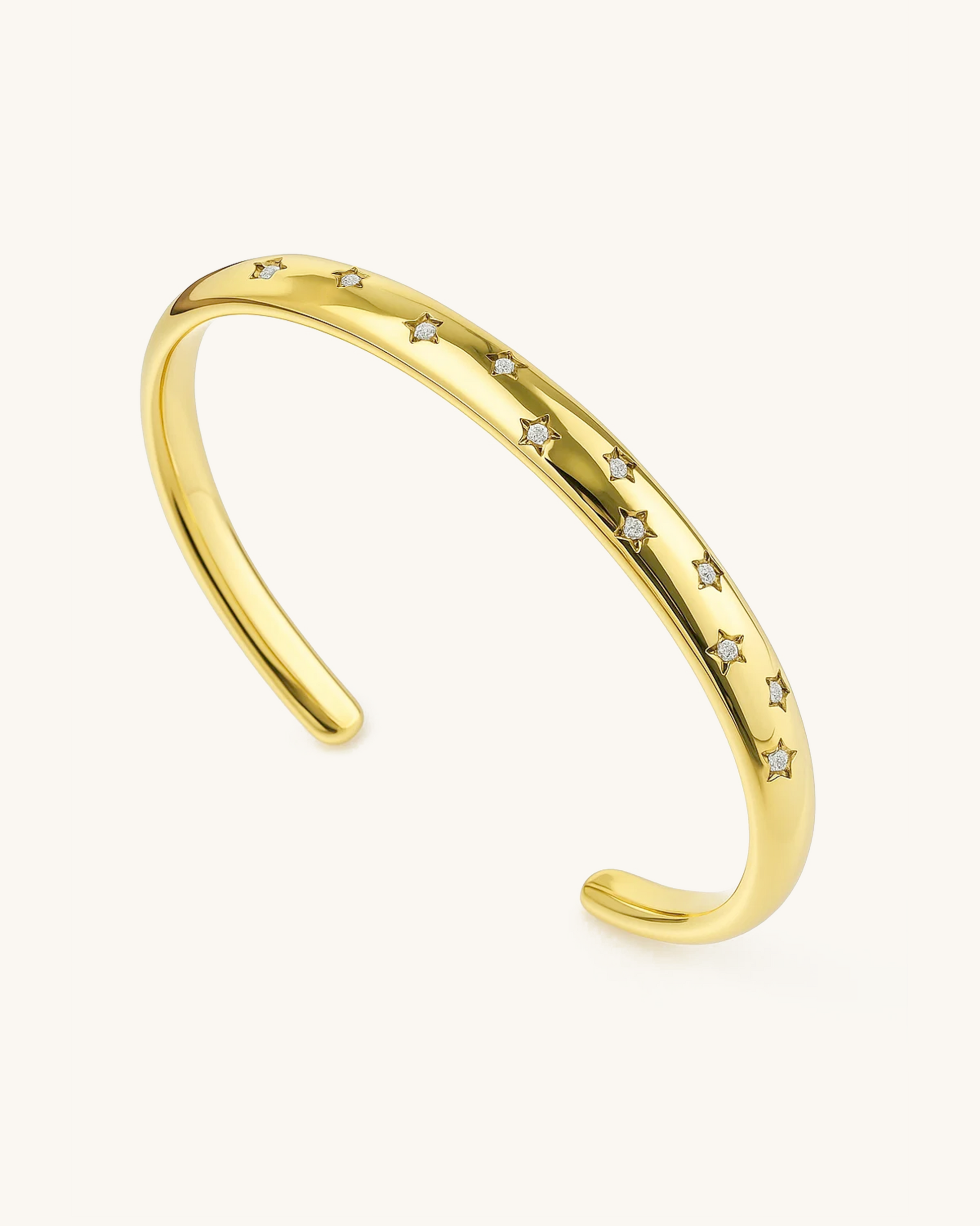 Sleek and minimal, the Open Star Cuff features a polished curved band in a classic open design, accented with scattered engraved stars set with sparkling cubic zirconia. Crafted from waterproof stainless steel and finished in 18K gold or silver plating, it offers a comfortable fit and subtle celestial sparkle—perfect for everyday wear or stacking with other bangles.