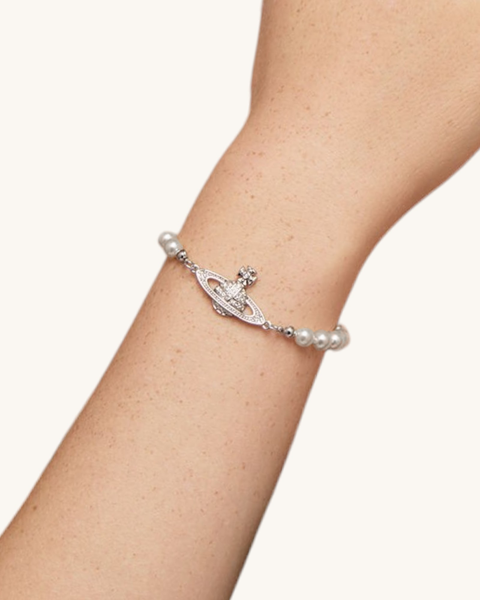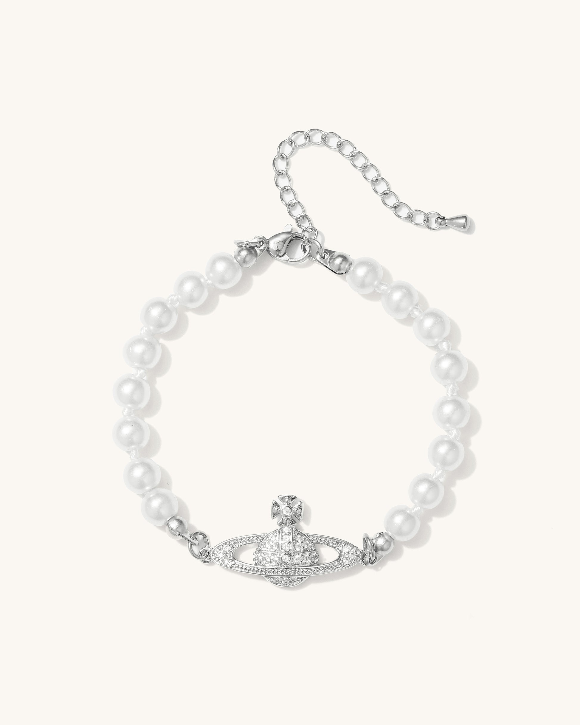 Make a cosmic statement with the ORBIT Pearl Bracelet. Featuring imitation pearls and a sparkling planet charm linked by a pavé safety pin, this playful yet elegant design brings a touch of the universe to your everyday style.