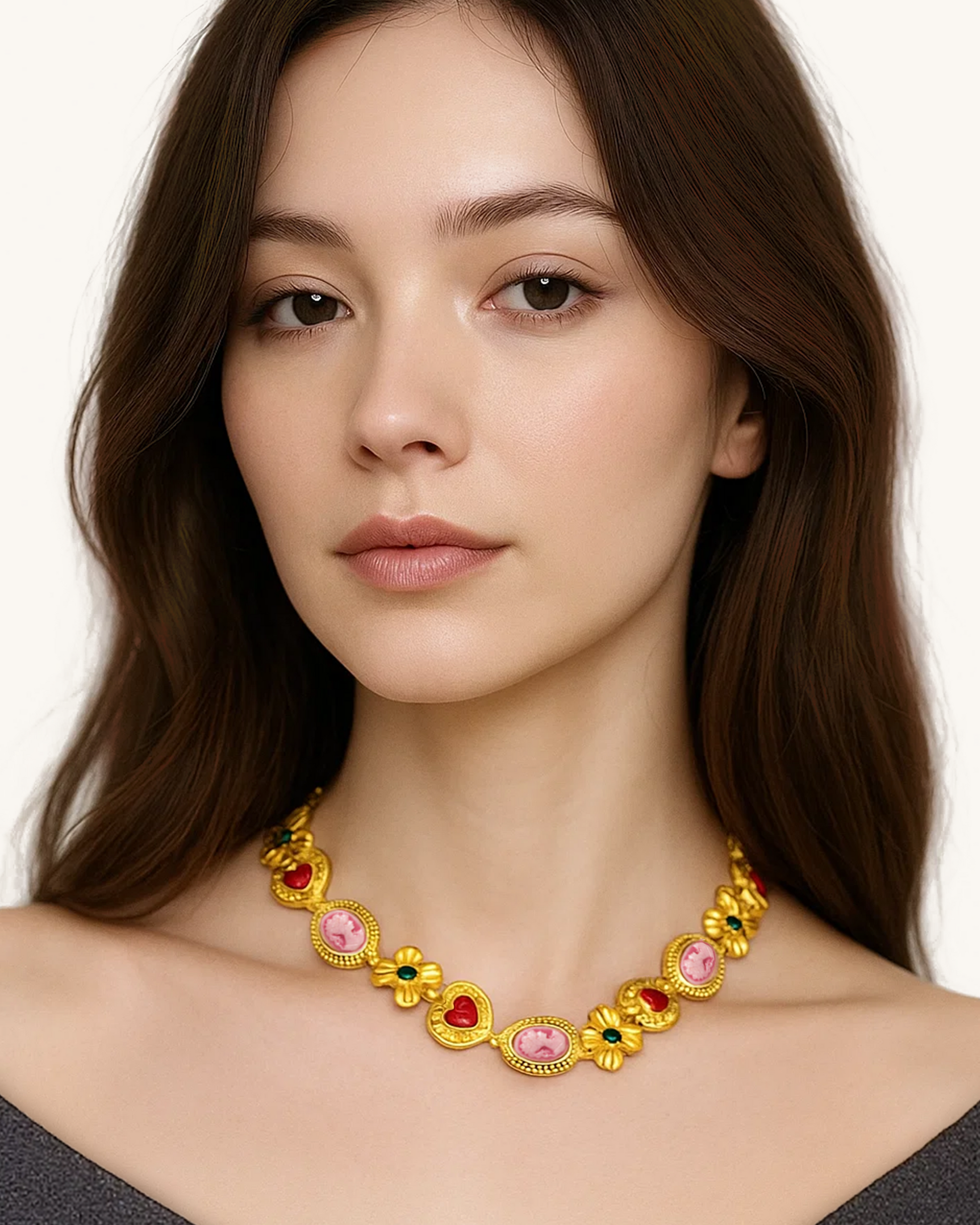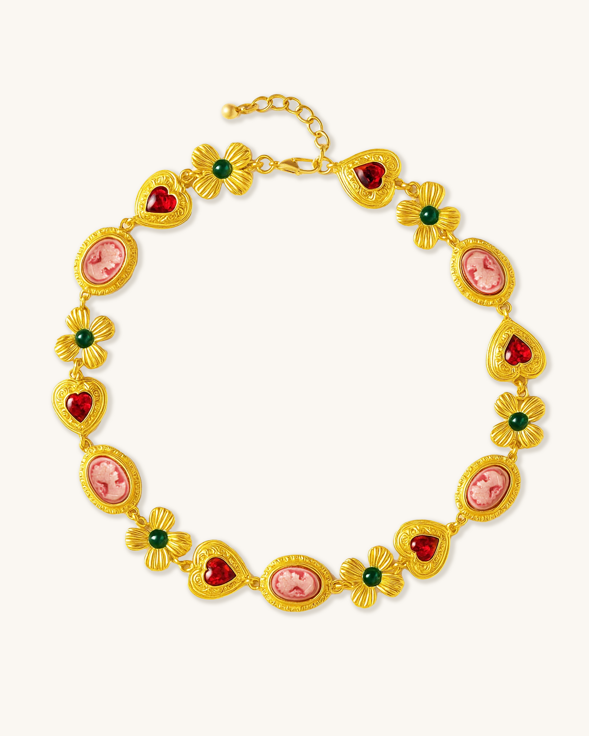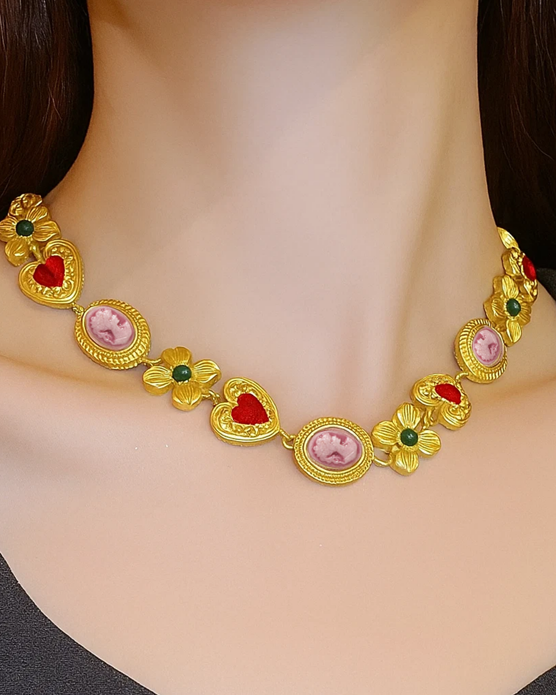 Romantic and ornate, the Romantic Emblem Necklace features alternating vintage-style pink cameo portraits, deep red heart charms, and textured gold-tone flowers with emerald-green accents. Each element is framed in sculpted gold plating, evoking baroque elegance and nostalgic charm. Perfect for making a bold statement with a hint of historical romance.