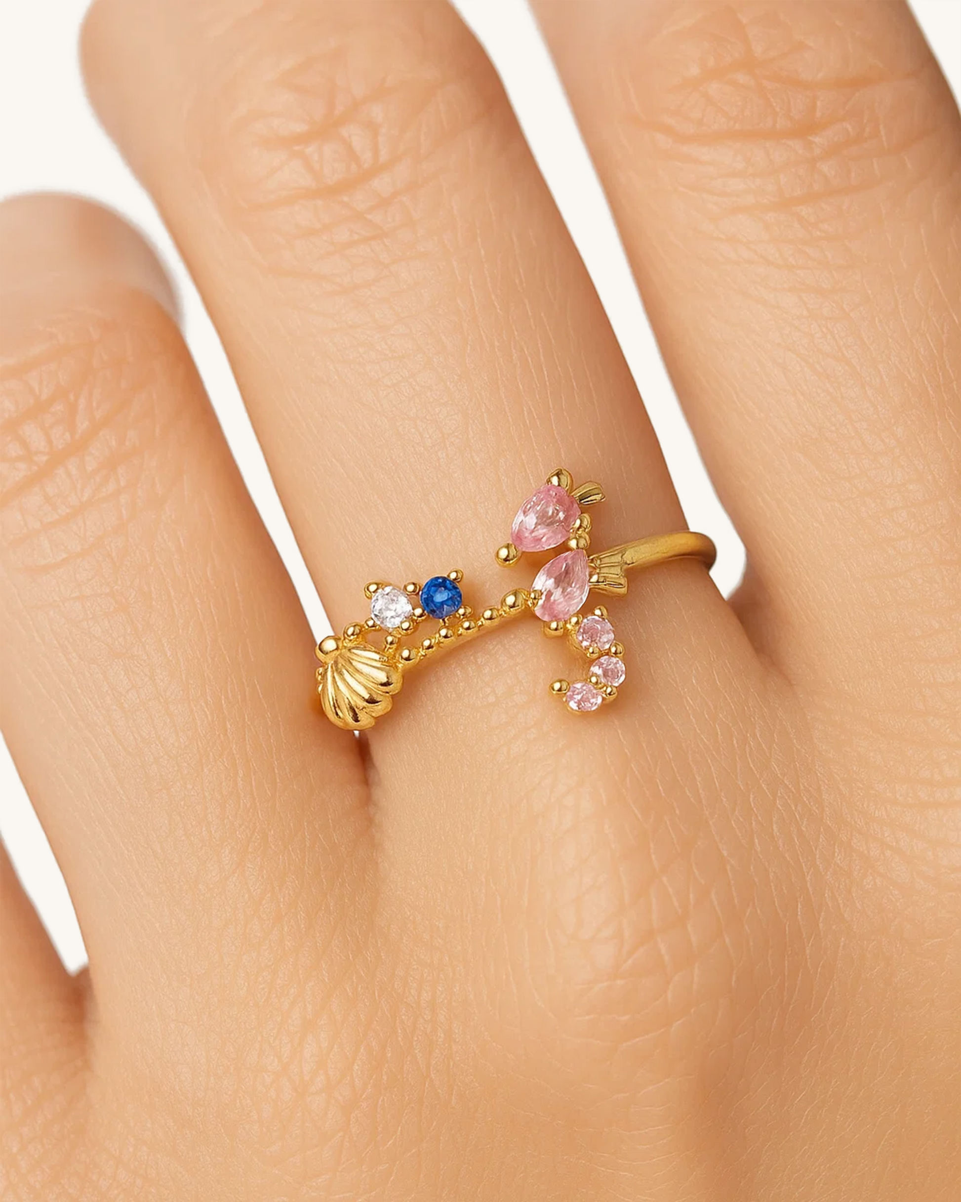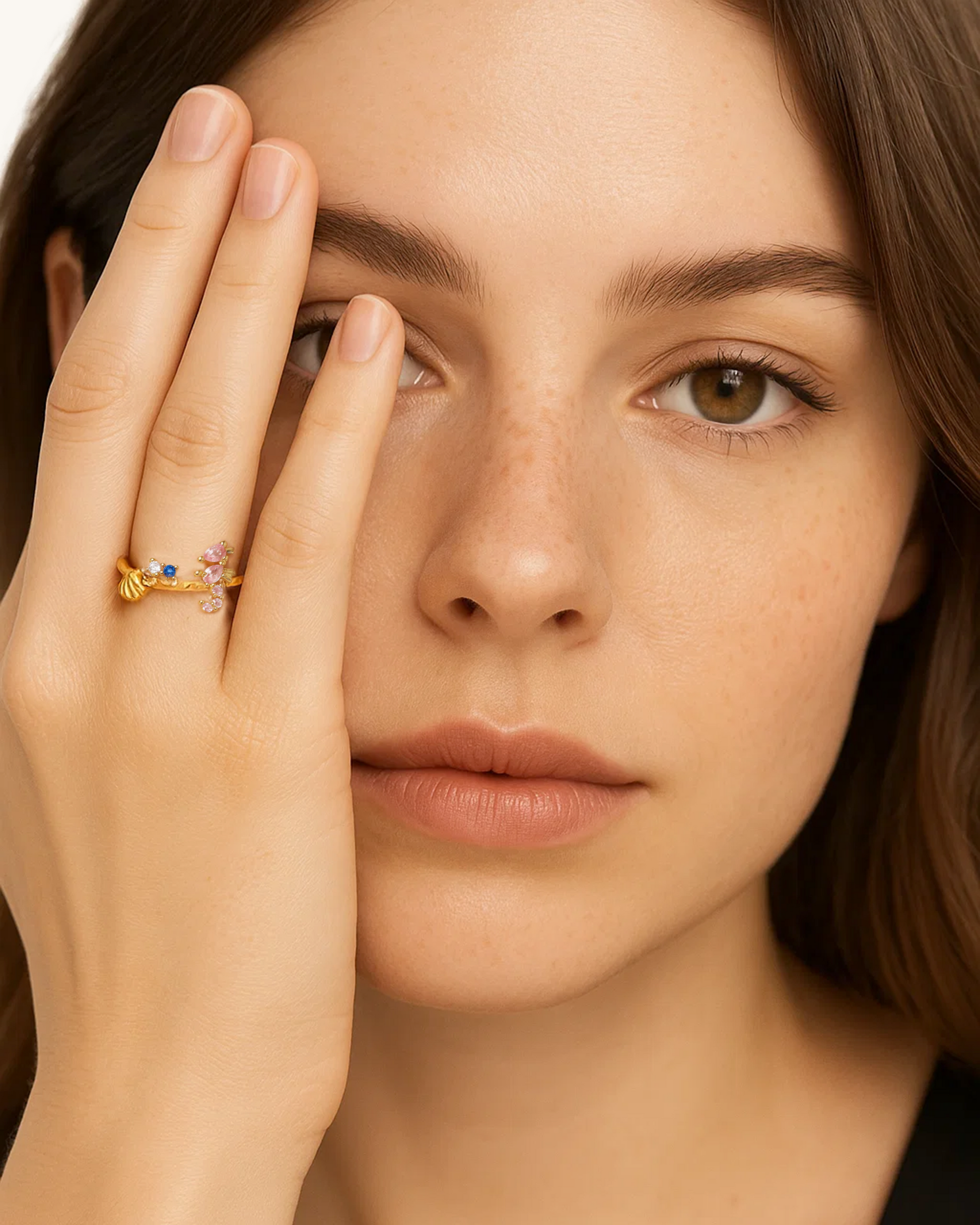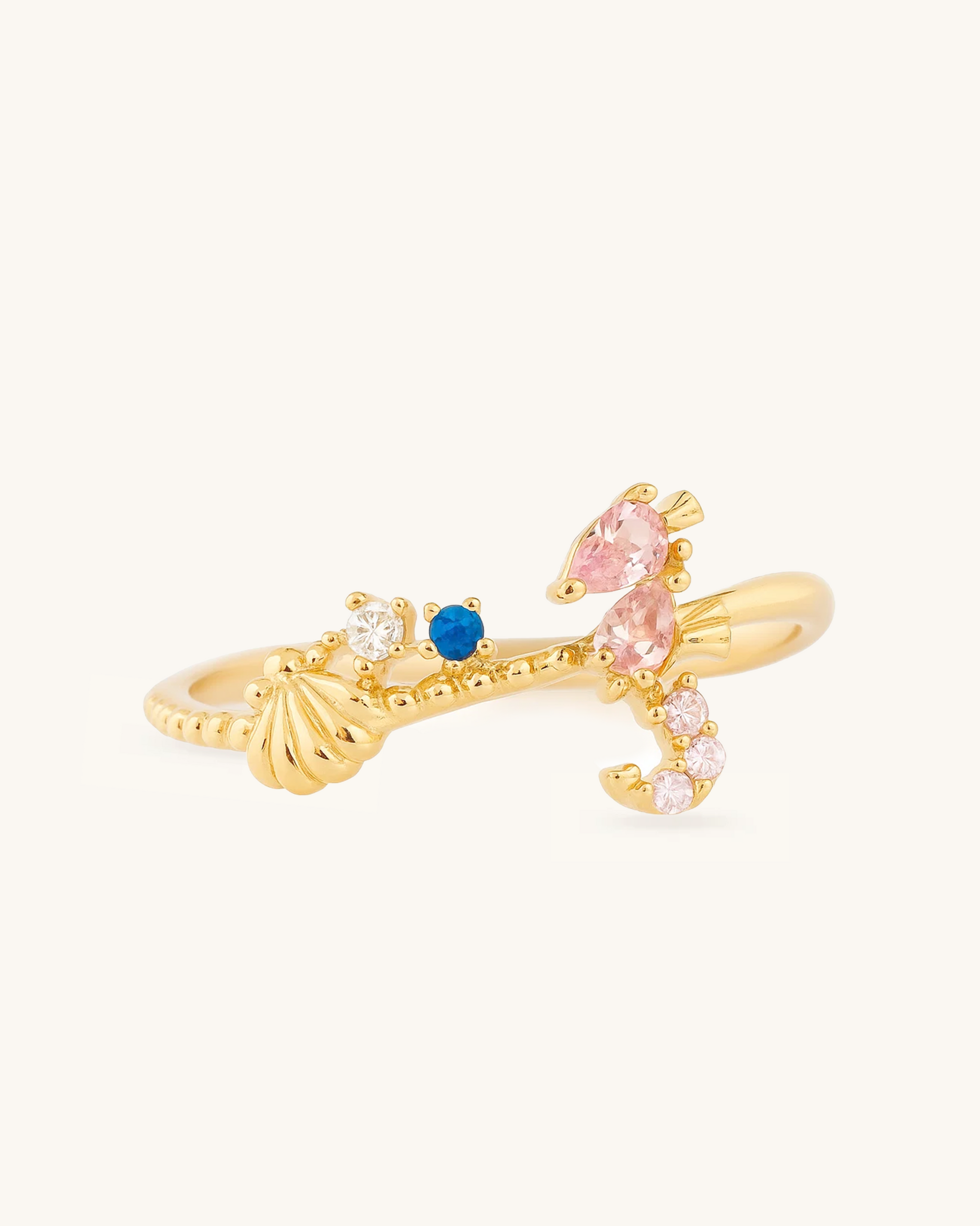 Playful and dreamy, the Seahorse & Shell Ring features a sweet pink seahorse embellished with sparkling cubic zirconia, joined by a golden seashell and accent gems in blue and white. Set on a beaded textured band and finished in 18K gold plating, this ring captures the magic of the sea in a whimsical wearable form—perfect for ocean lovers and fantasy dreamers alike.