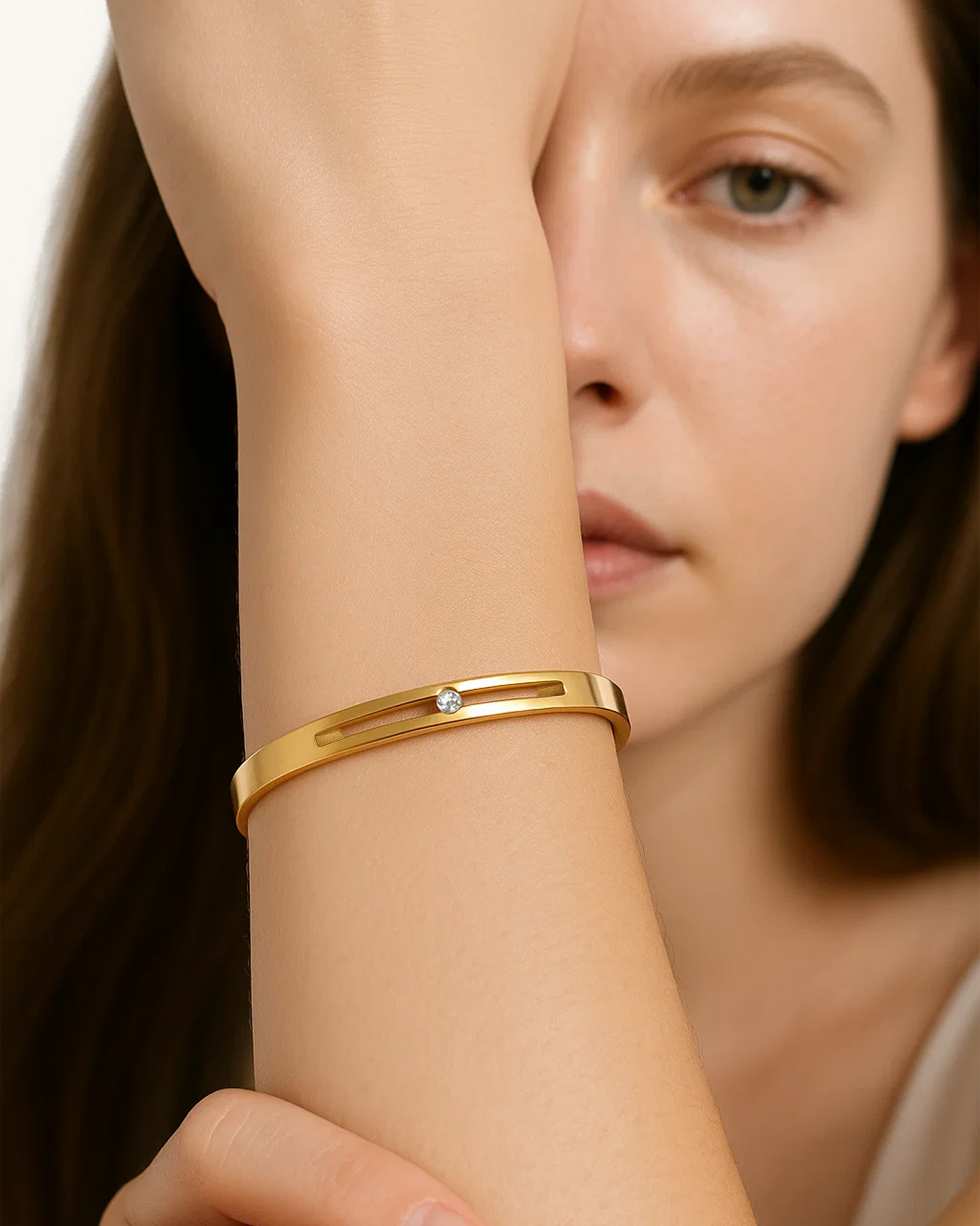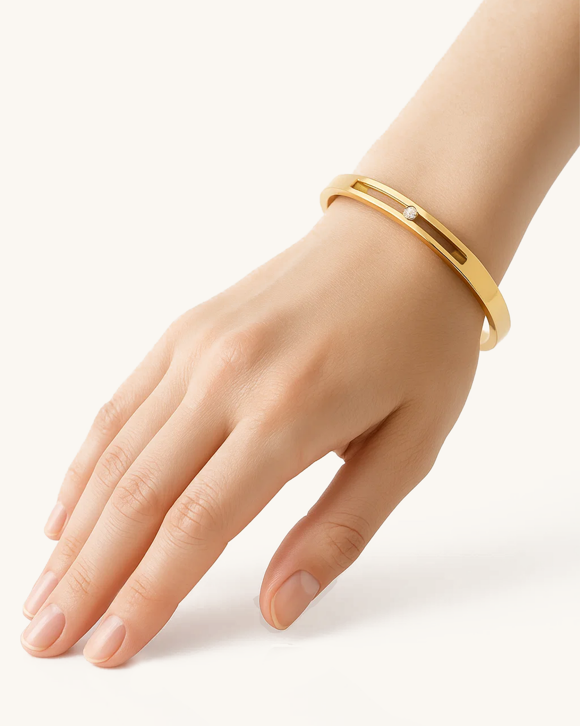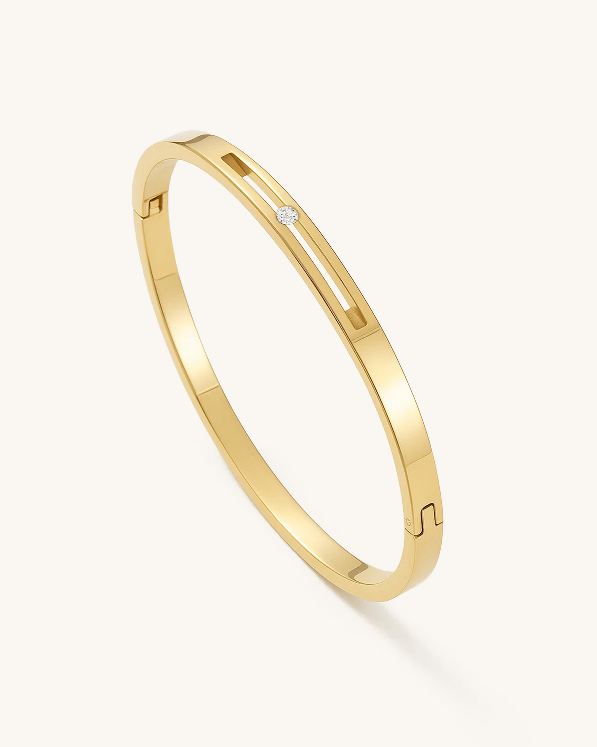 Understated yet refined, the Sleek Bar Cut Bangle features a sleek polished band with a slim rectangular groove and a single embedded cubic zirconia. Its clean silhouette and lightweight feel make it ideal for stacking, solo wear, or everyday elegance. Waterproof and crafted in stainless steel with gold or silver plating, this bracelet is the epitome of effortless style.