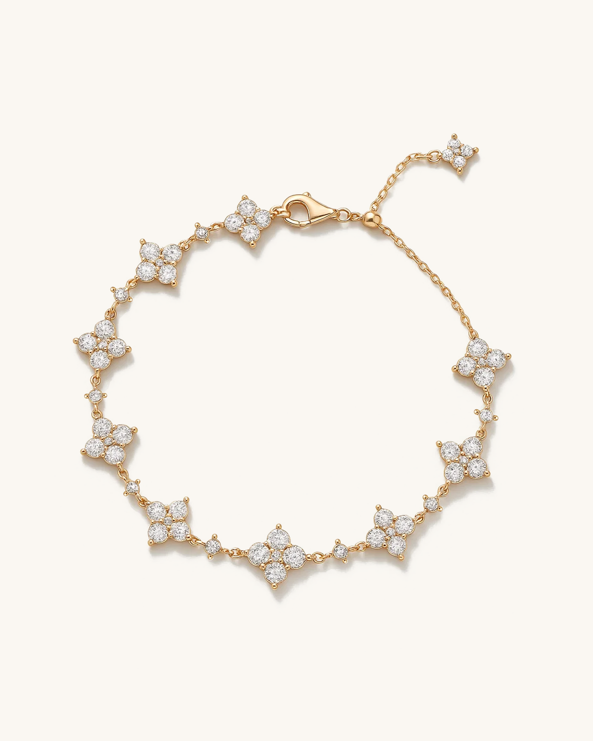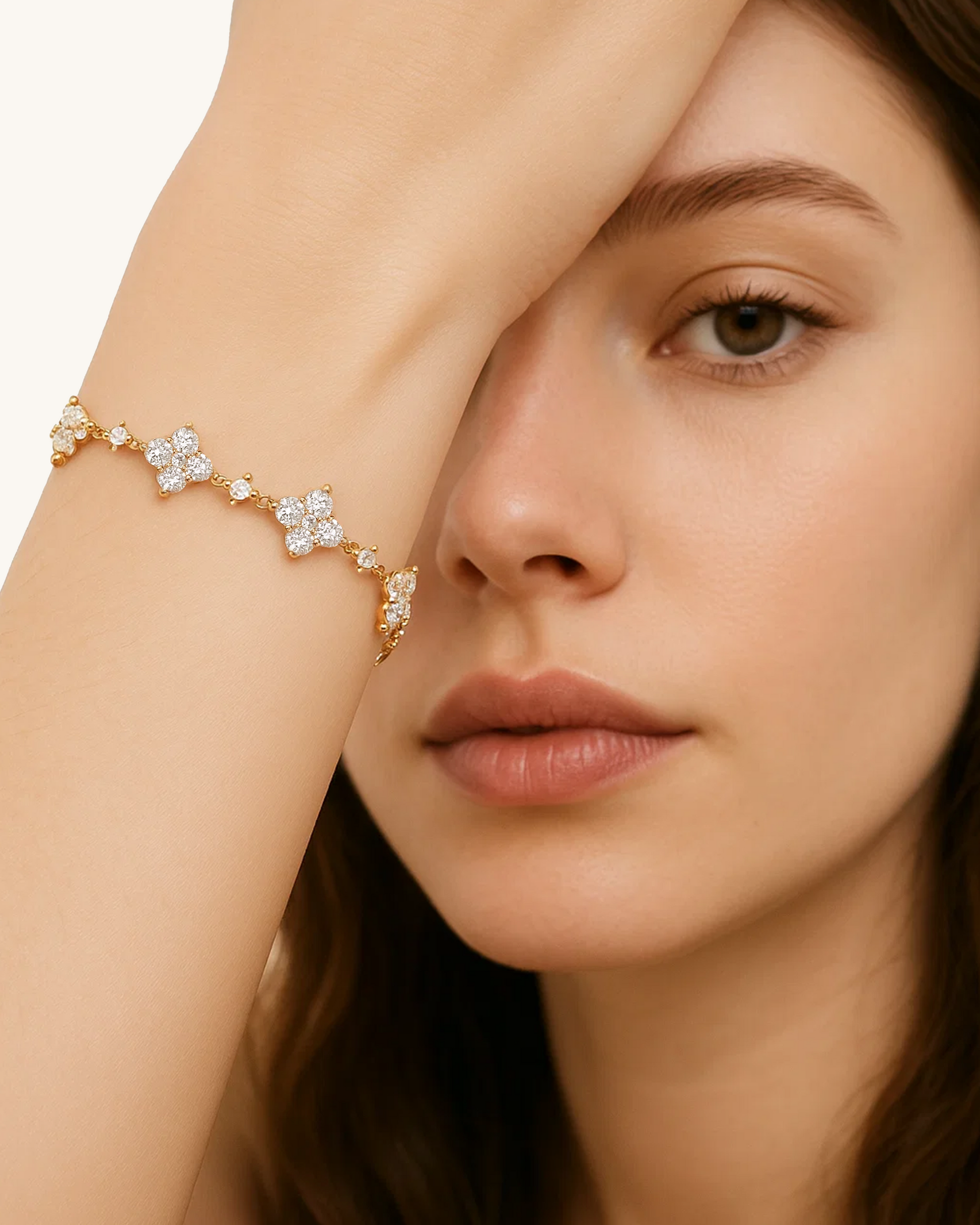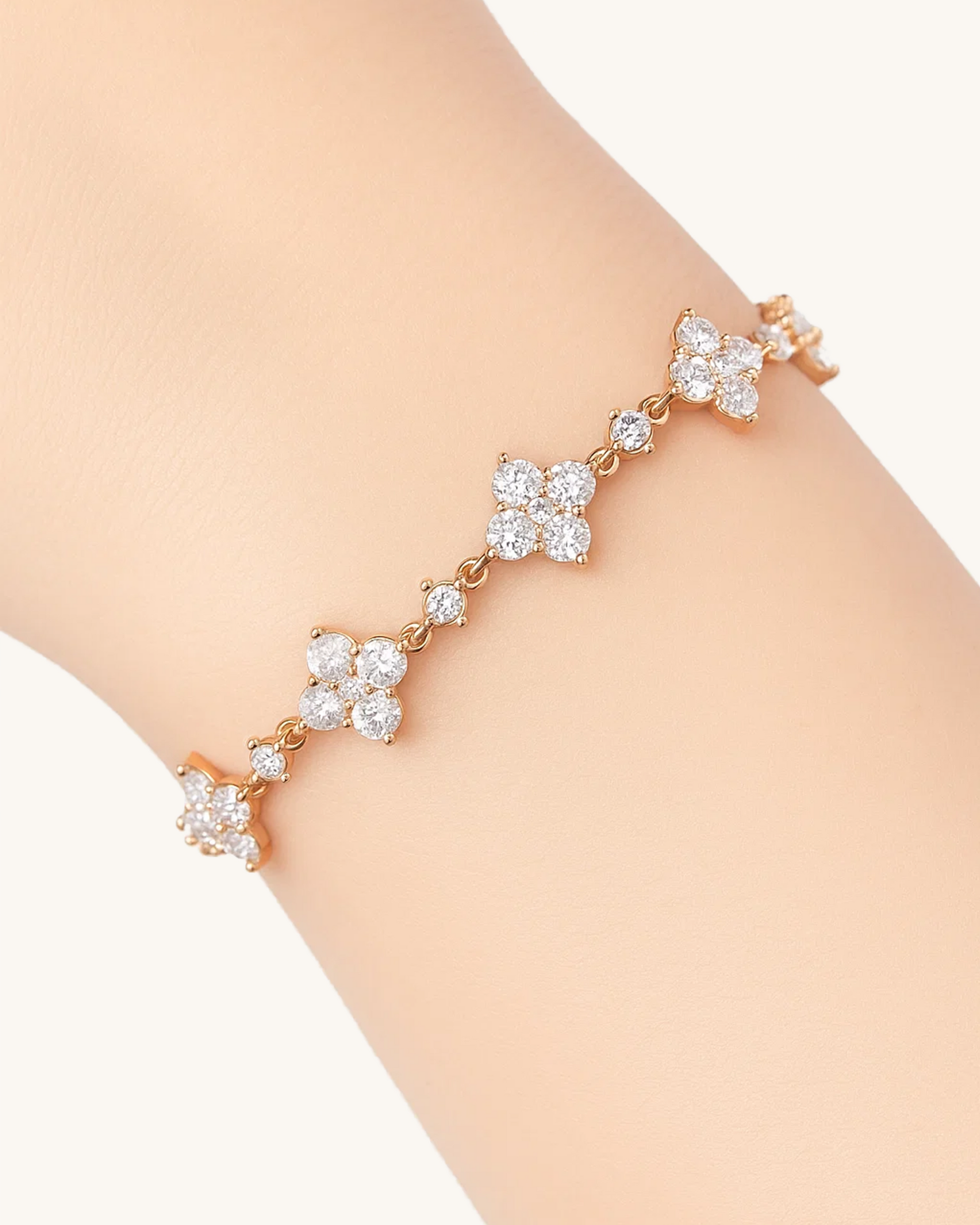 Elegant and radiant, the Sparkling Charm Bracelet showcases shimmering clusters of round-cut cubic zirconia arranged like delicate blooming flowers. Finished in gold or white gold tone over waterproof copper, this feminine piece adds a graceful sparkle to any look. The adjustable chain ensures a perfect fit, making it ideal for special occasions or layering with everyday favorites.