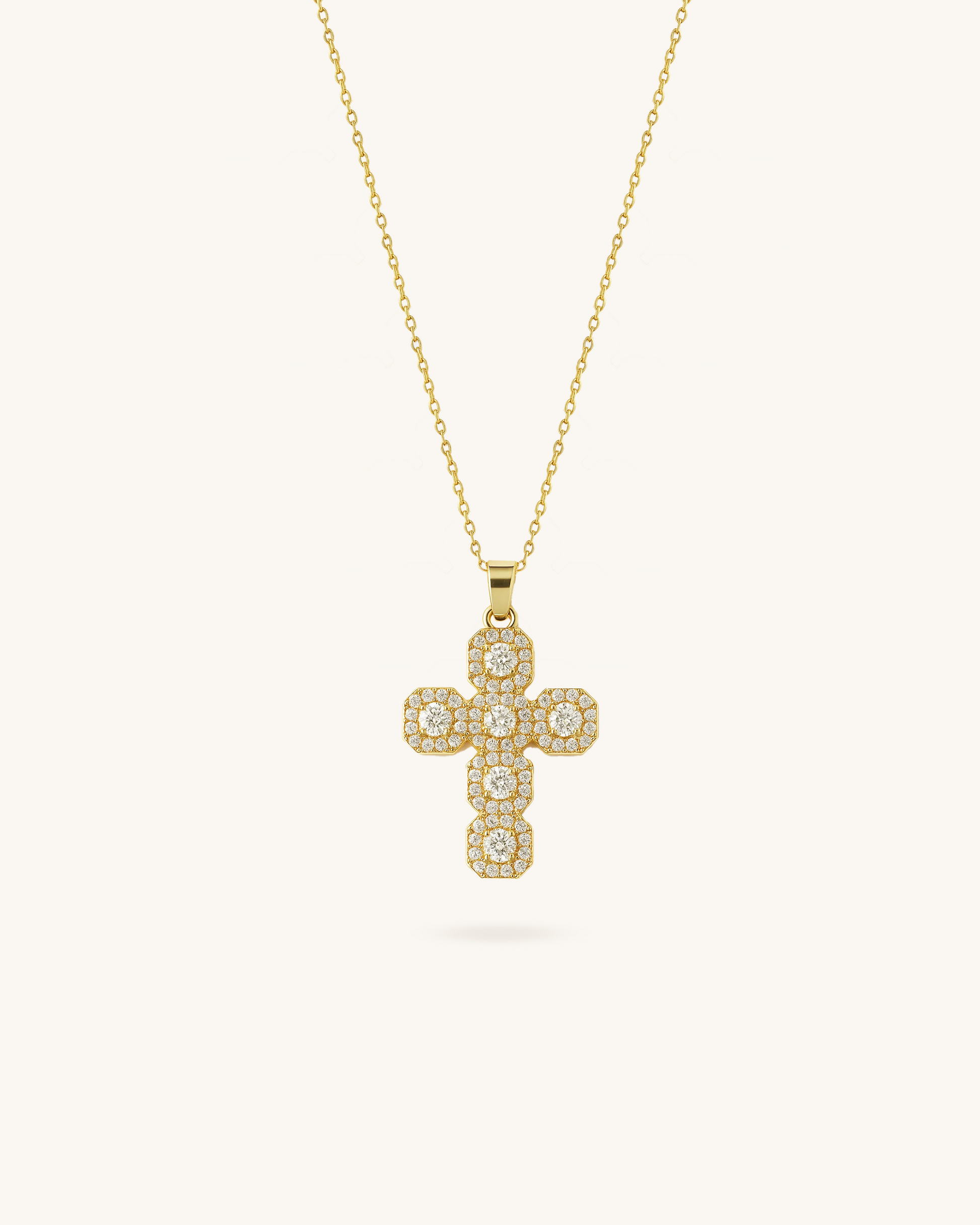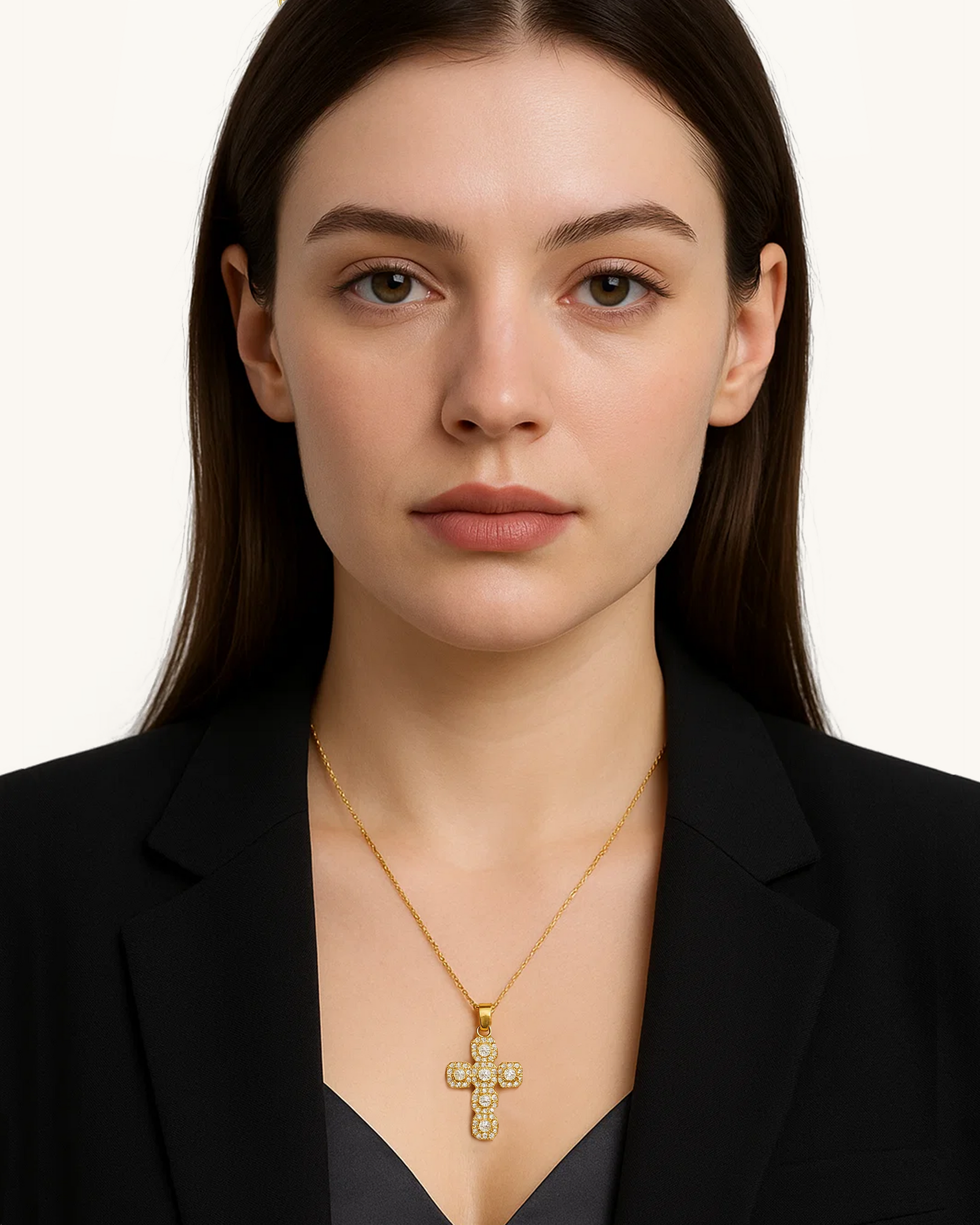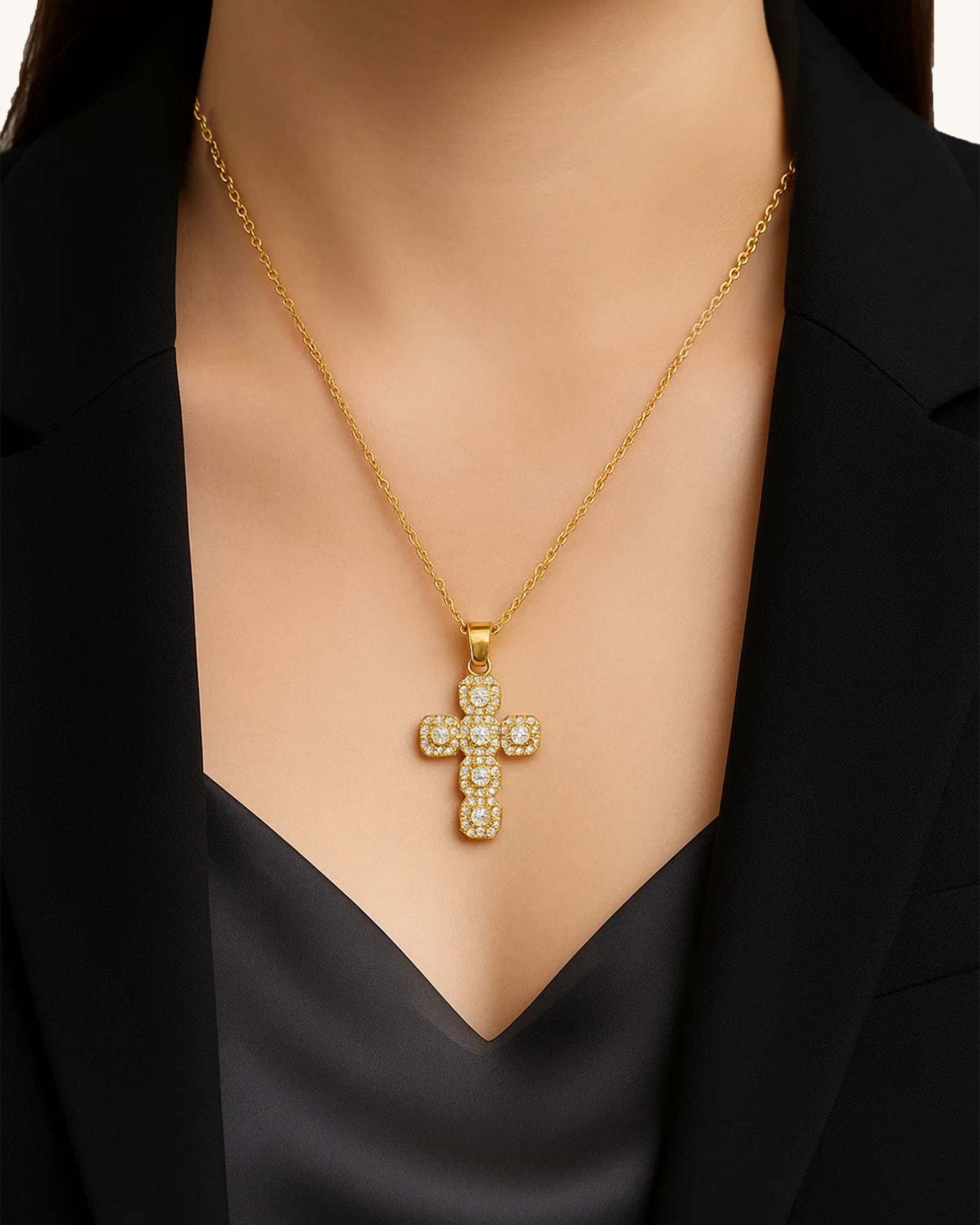Radiant and iconic, the Square Cross Pendant features a bold cross silhouette fully encrusted with shimmering cubic zirconia. Crafted from waterproof stainless steel and finished in rich 18K gold plating, this statement piece is both durable and eye-catching. Whether worn alone or layered, it's the perfect balance of faith and fashion.