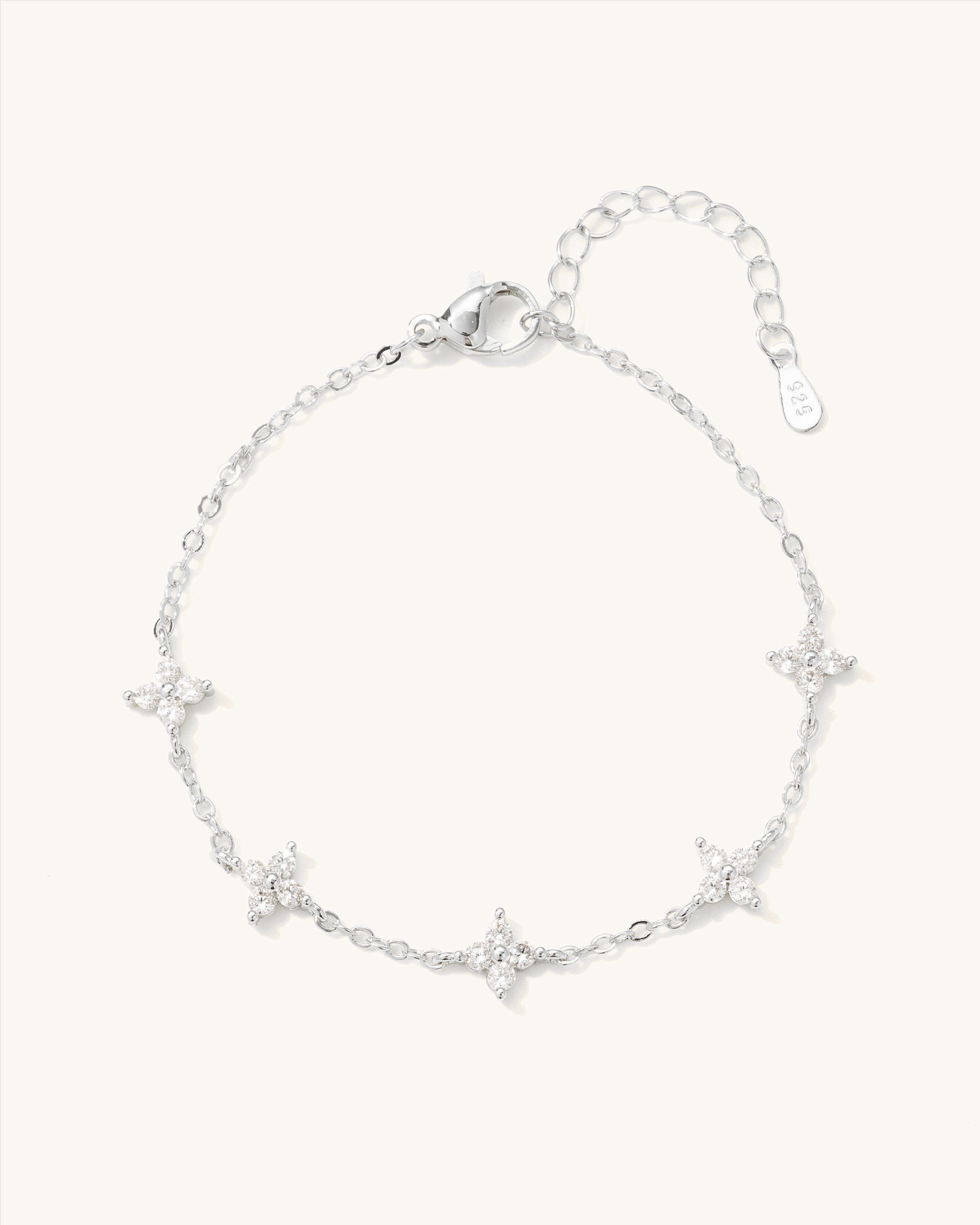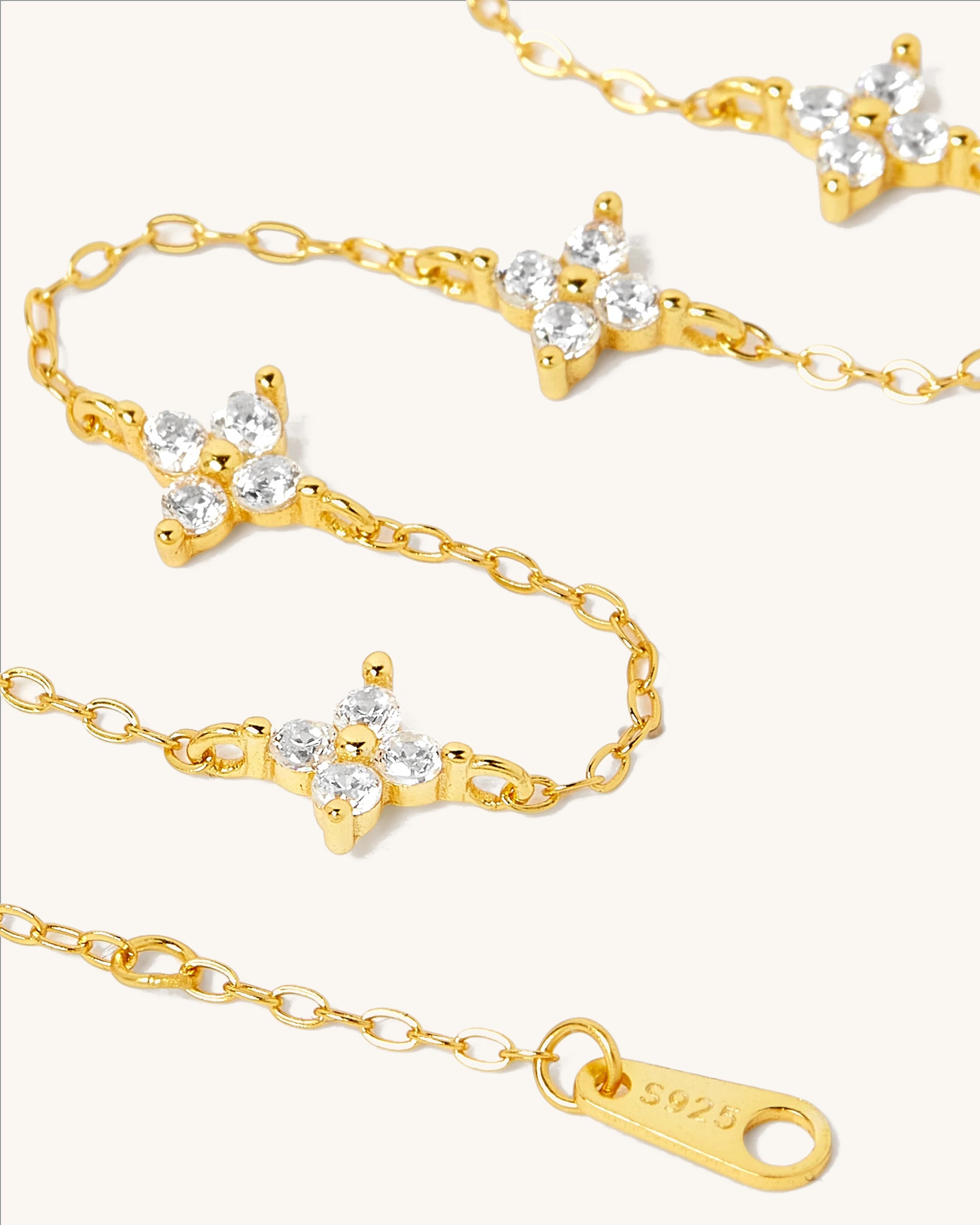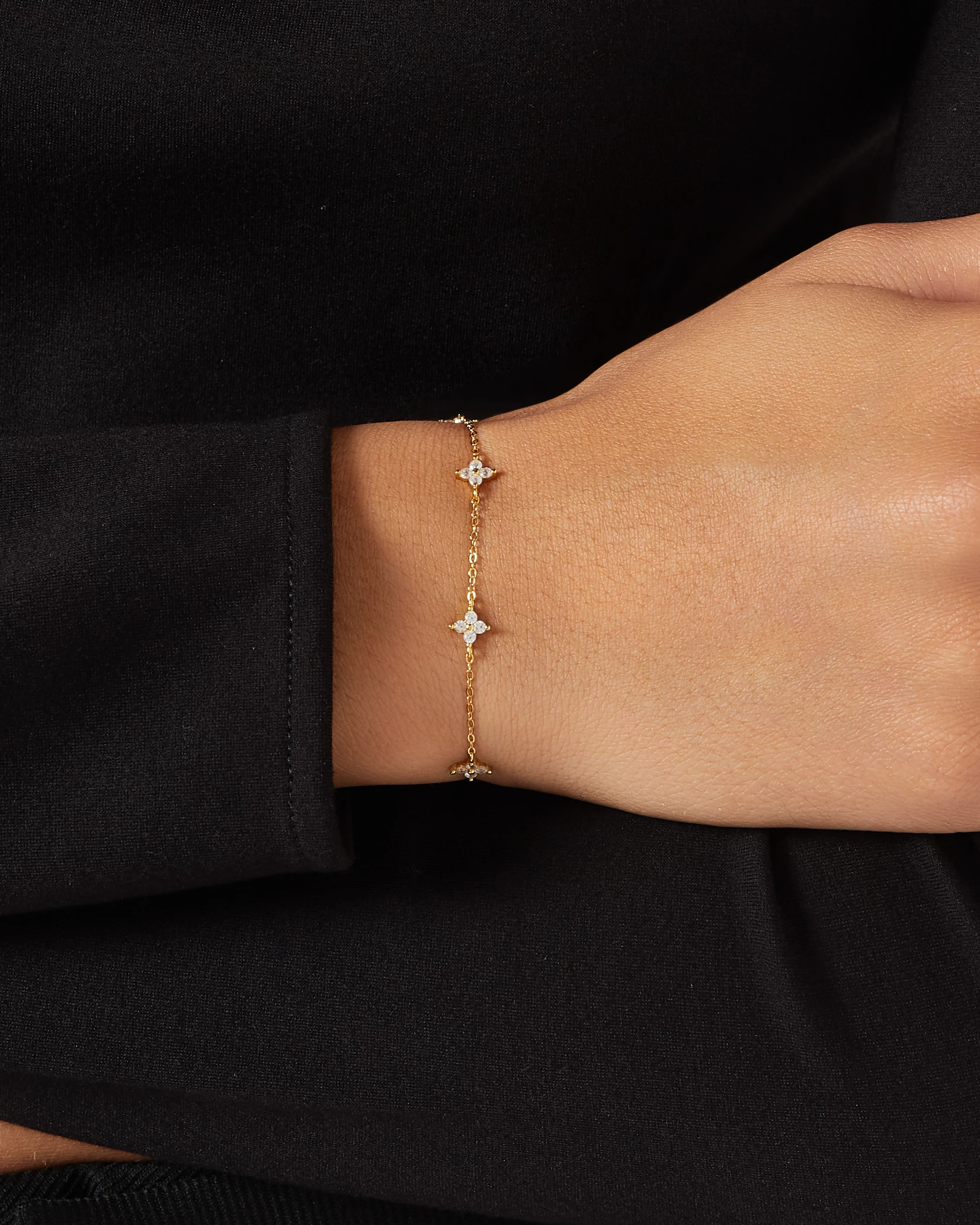 Light and graceful, the Star Bloom Bracelet brings a soft sparkle to your everyday style. Crafted from 925 sterling silver and finished with 18K gold vermeil, it features dainty star-shaped floral motifs set with shimmering cubic zirconia. A perfect piece to wear alone or layered, adding a touch of charm to any outfit.
