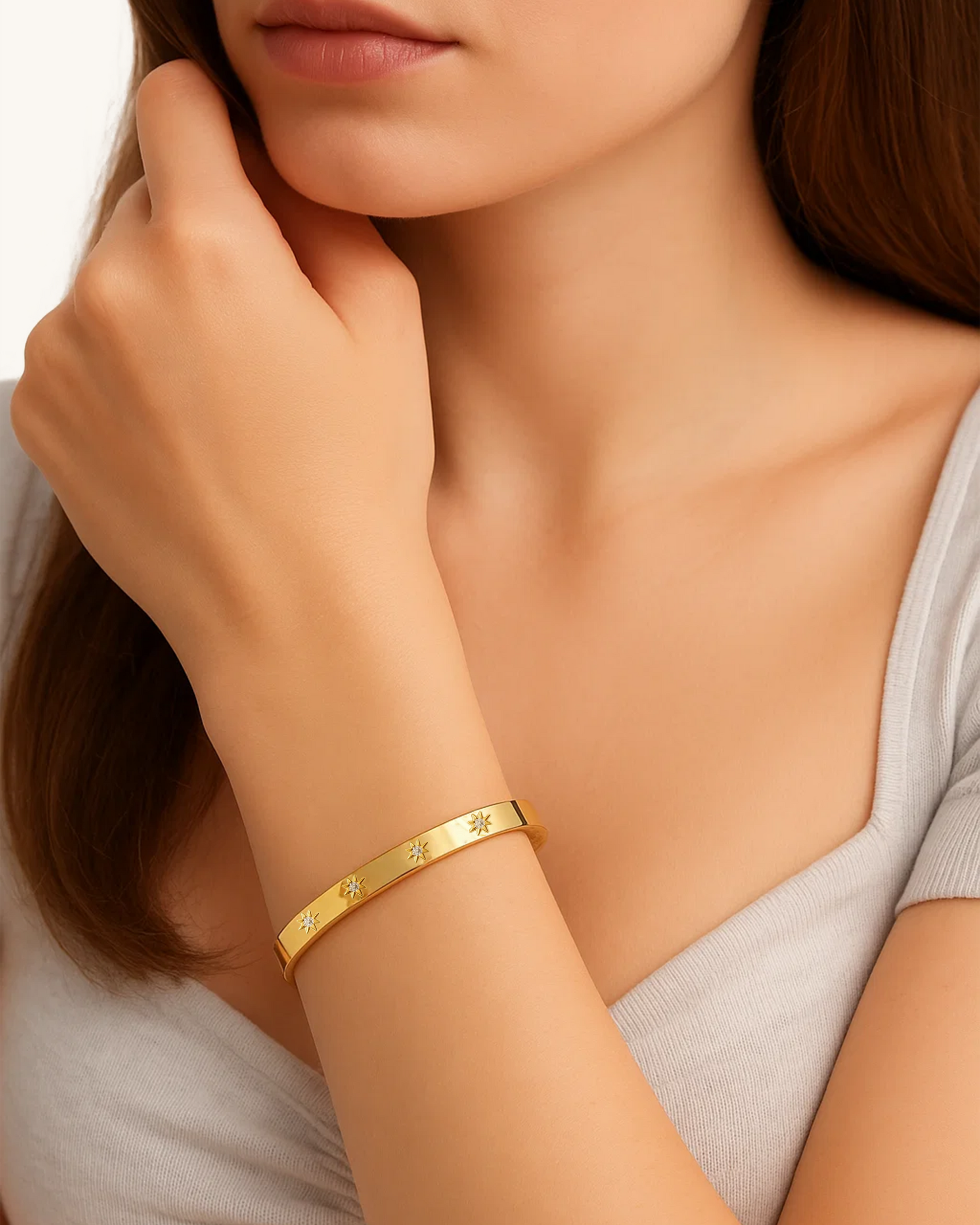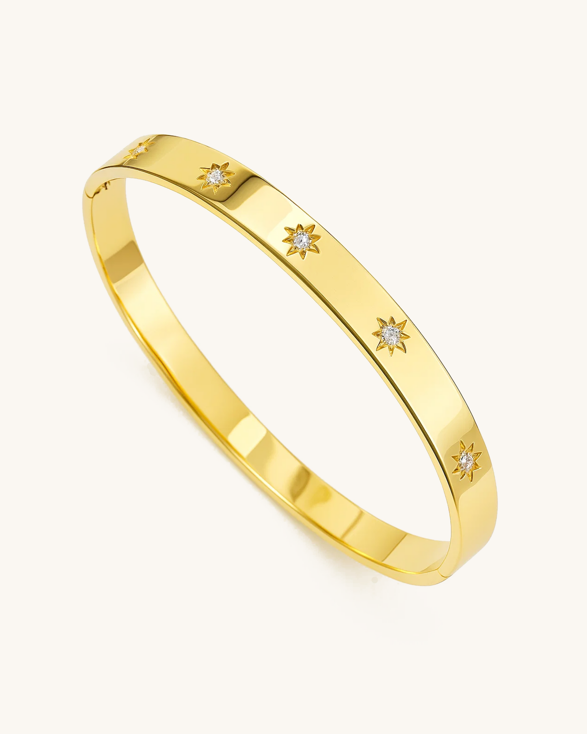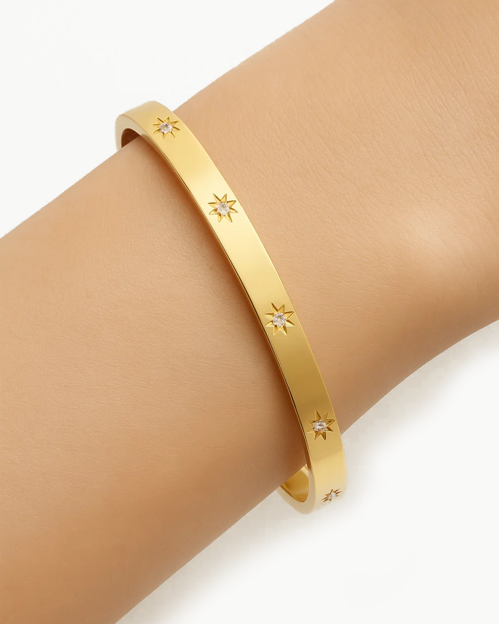 Sleek and celestial, the Starburst CZ Bangle features a series of engraved star motifs, each centered with a sparkling cubic zirconia. Crafted from waterproof stainless steel and finished in 18K gold or silver plating, this hinged bracelet adds subtle shine and modern elegance—perfect for everyday wear or stacking with other bangles.