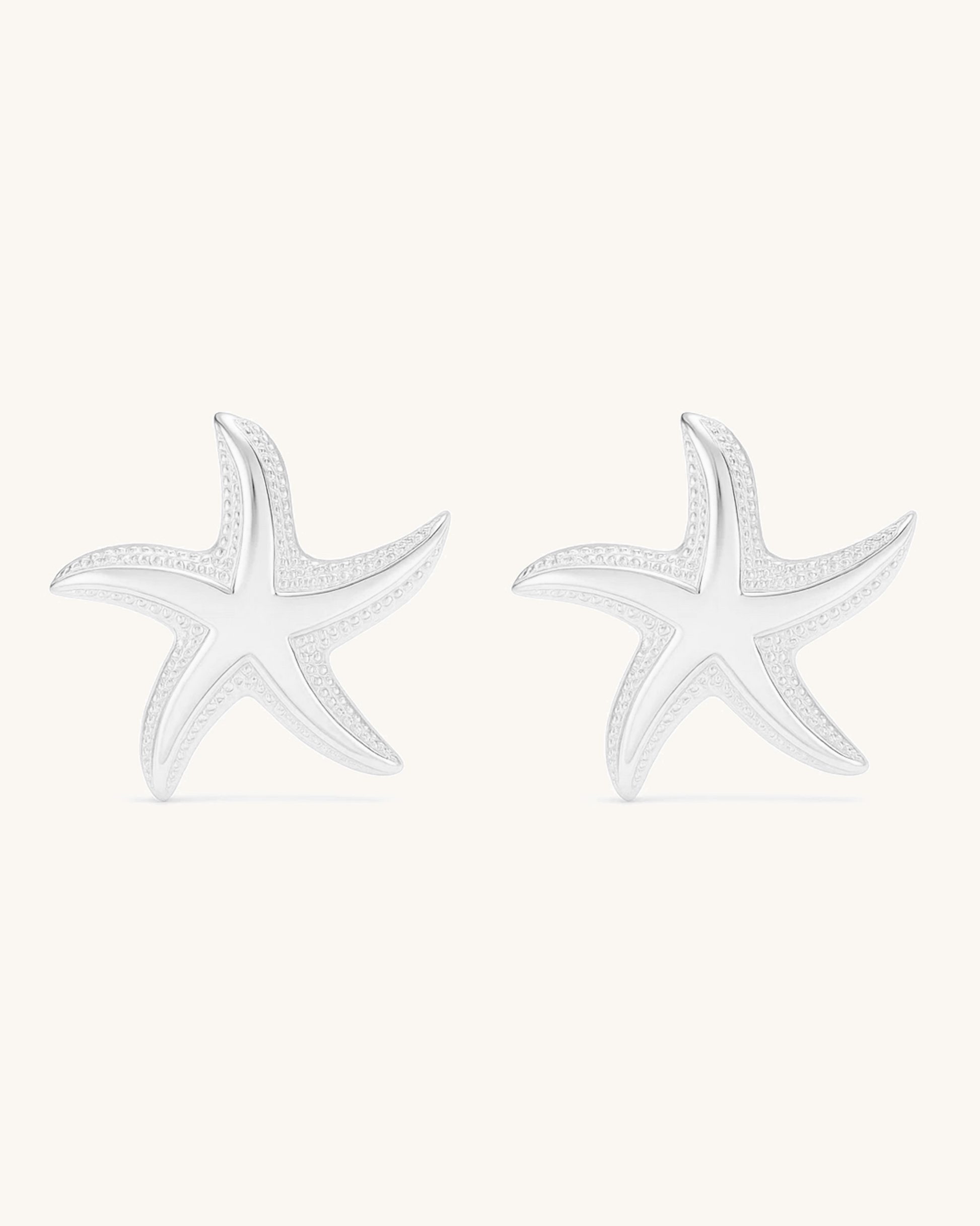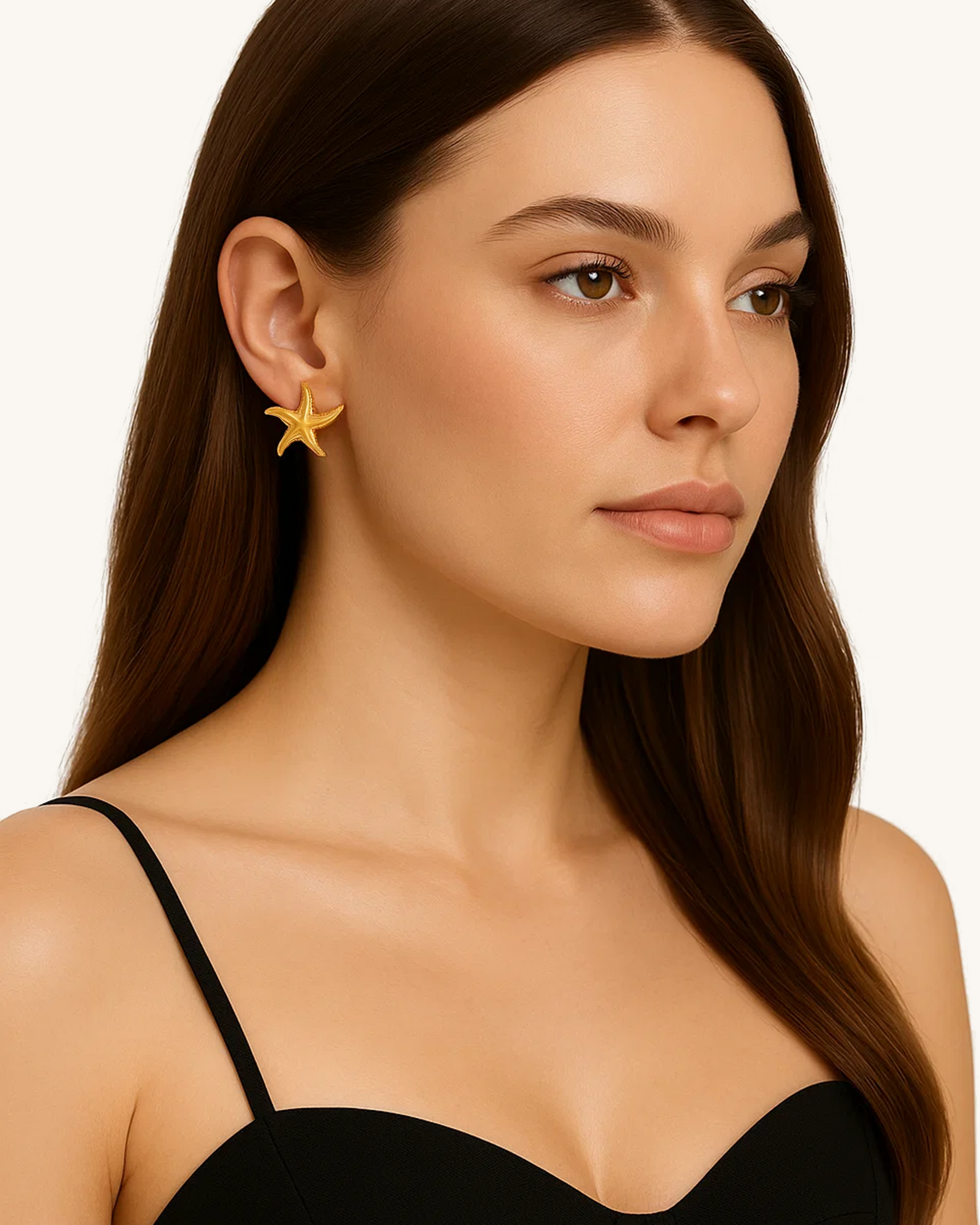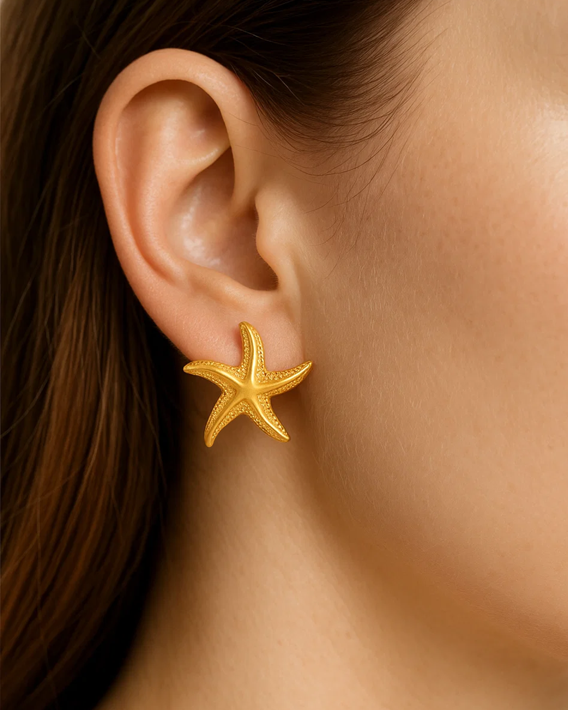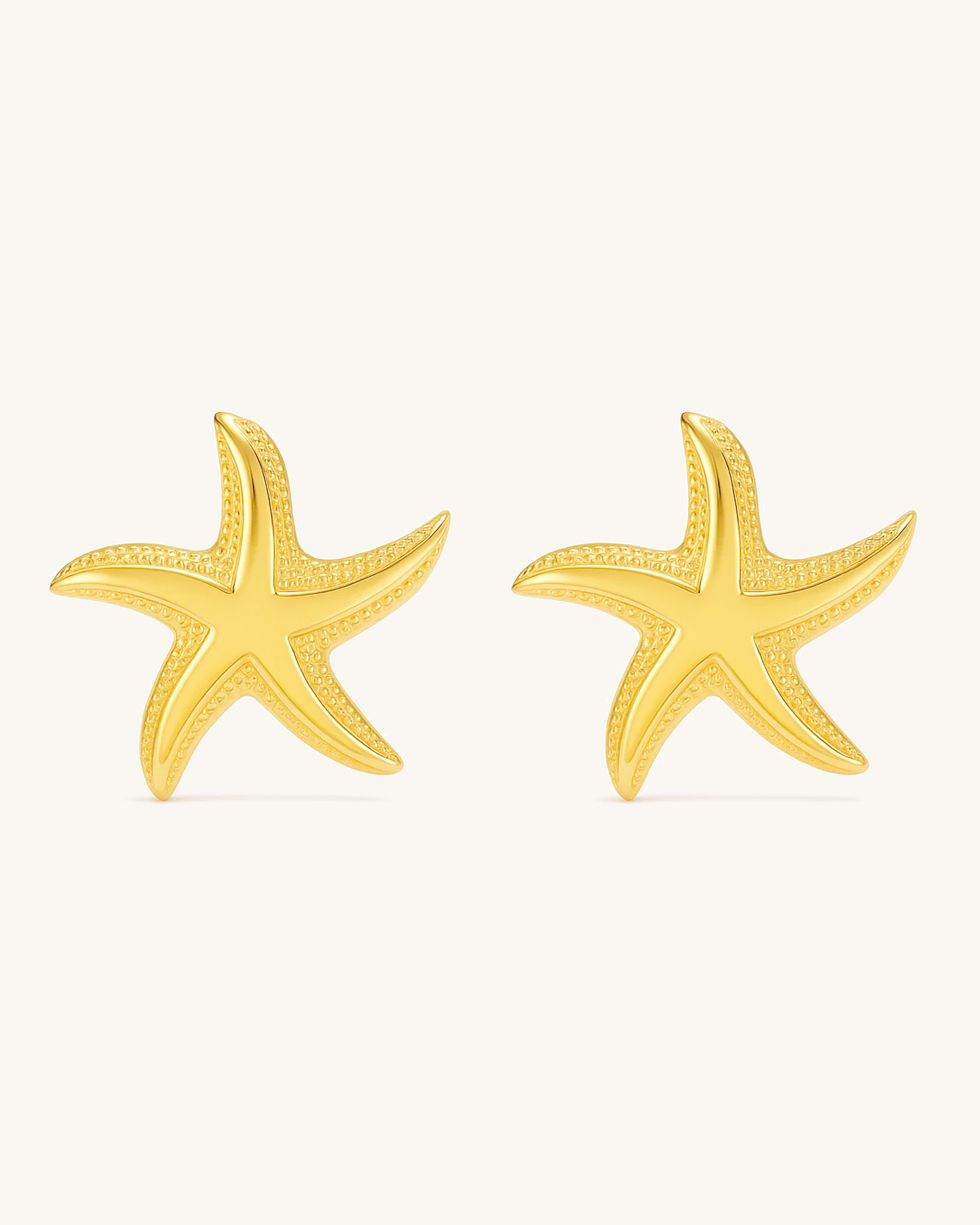 Playful and radiant, the Starfish Stud Earrings feature a bold five-point starfish silhouette with delicate dotted texture for a natural ocean-inspired finish. Crafted from waterproof stainless steel and coated in 18K gold, these earrings are the perfect accessory for summer outfits, beach vibes, or adding a coastal charm to your everyday look.