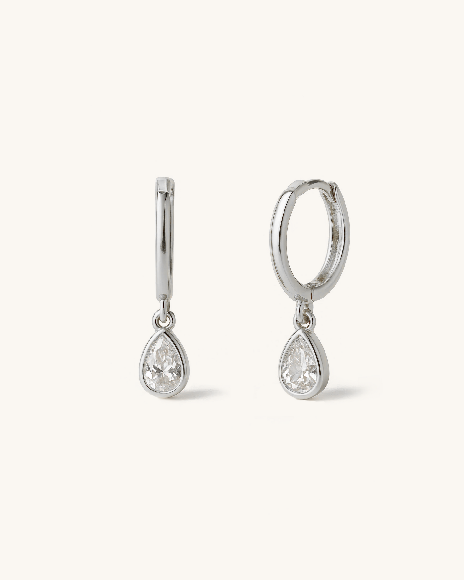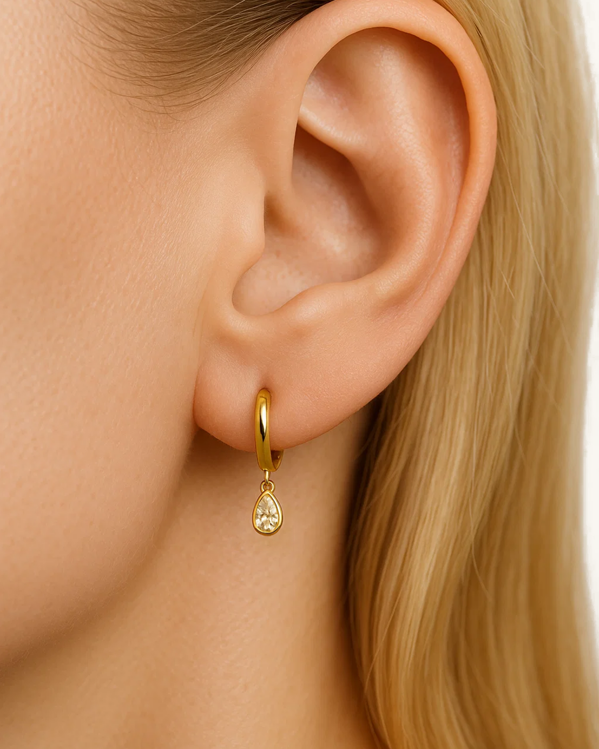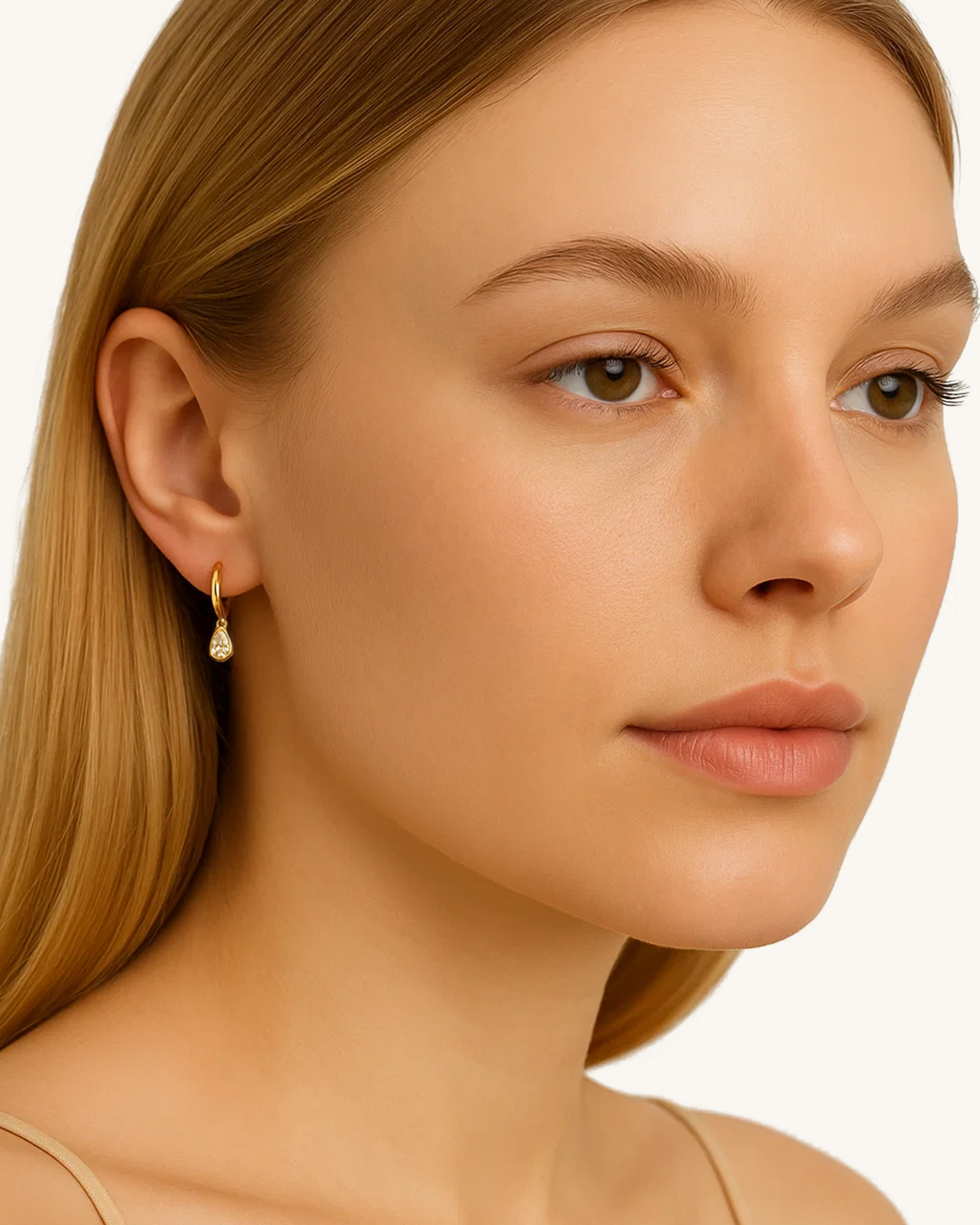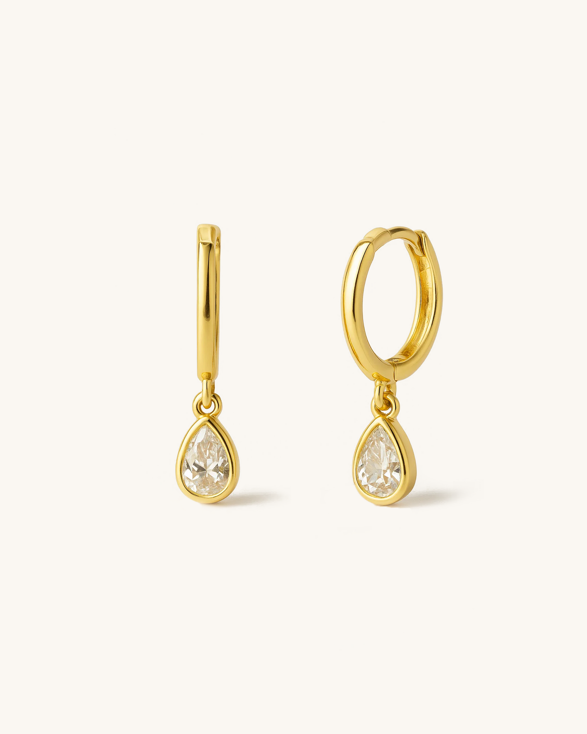 Elegant and timeless, the Teardrop Hoops feature slim mini hoops paired with a bezel-set pear-cut cubic zirconia charm. These minimalist drop earrings offer a refined sparkle that’s perfect for daily wear, gifting, or adding a subtle statement to any outfit. Lightweight and versatile, they’re a must-have in any jewelry collection.