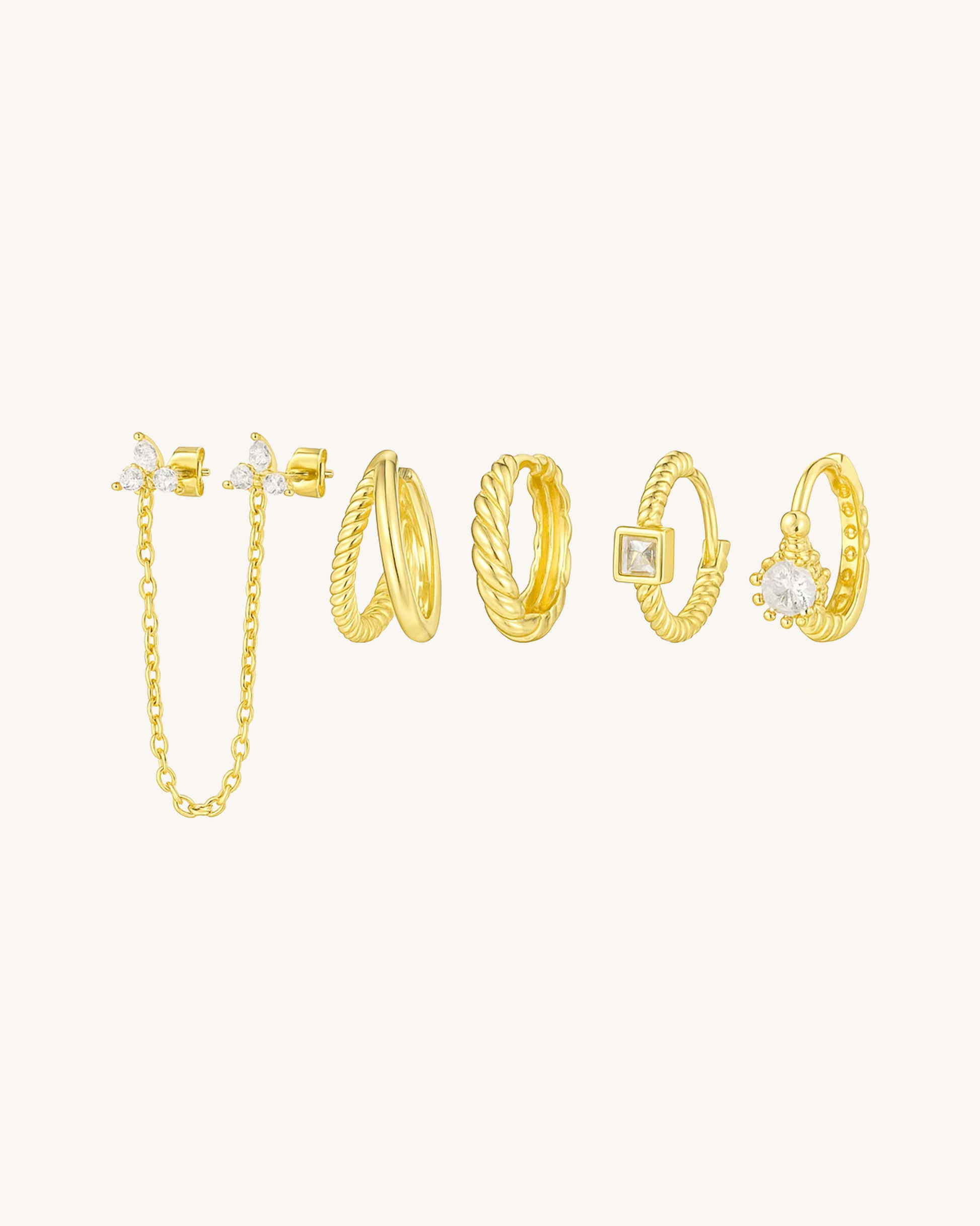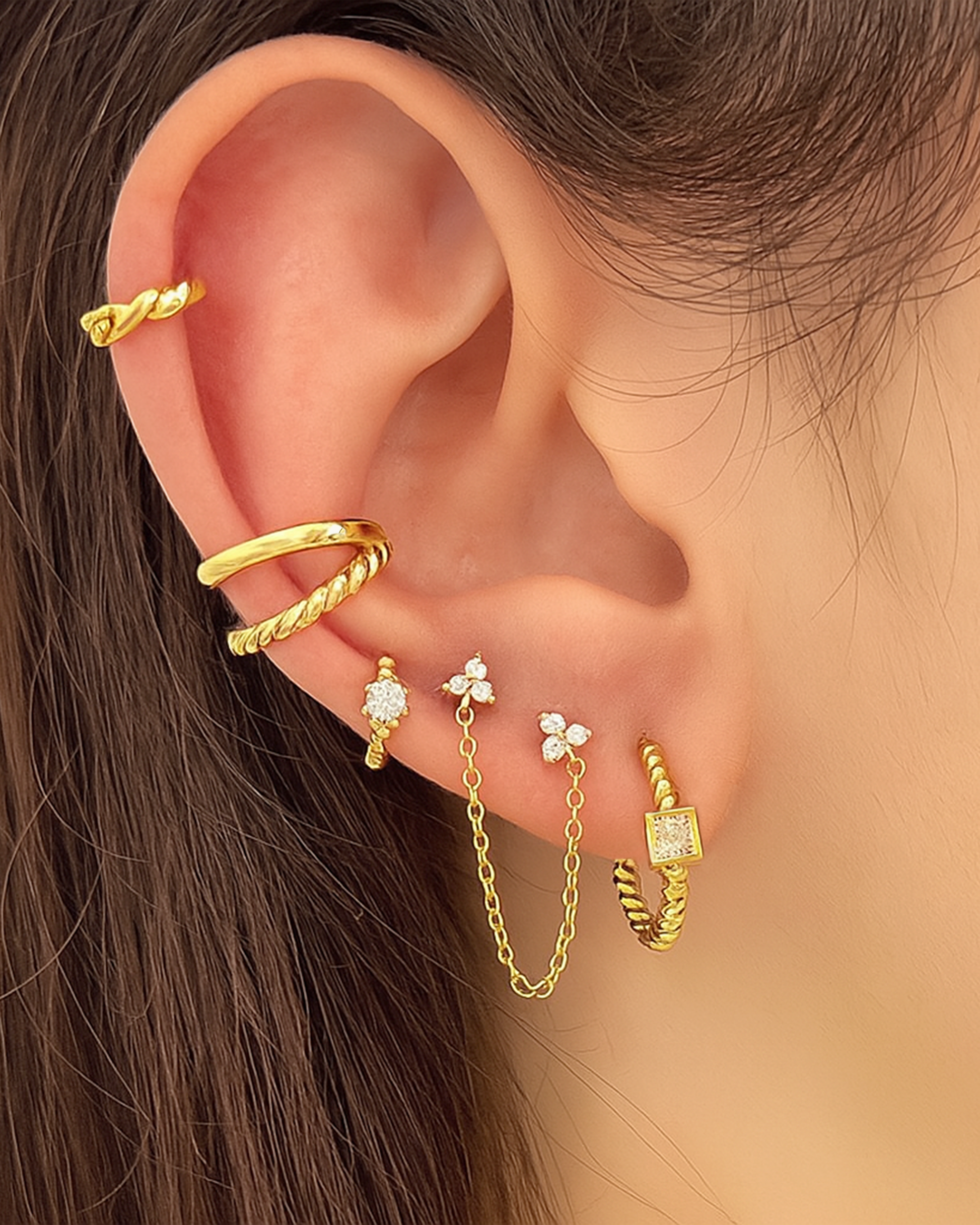 Elevate your ear game with the Twist & Shine Ear Stack – a curated blend of texture, sparkle, and chain detailing. Featuring twisted cuffs, minimalist hoops, crystal studs, and a double chain connector, this set balances classic shapes with contemporary flair. Whether worn together or mixed into your favorite stack, it delivers effortless shine for every occasion.