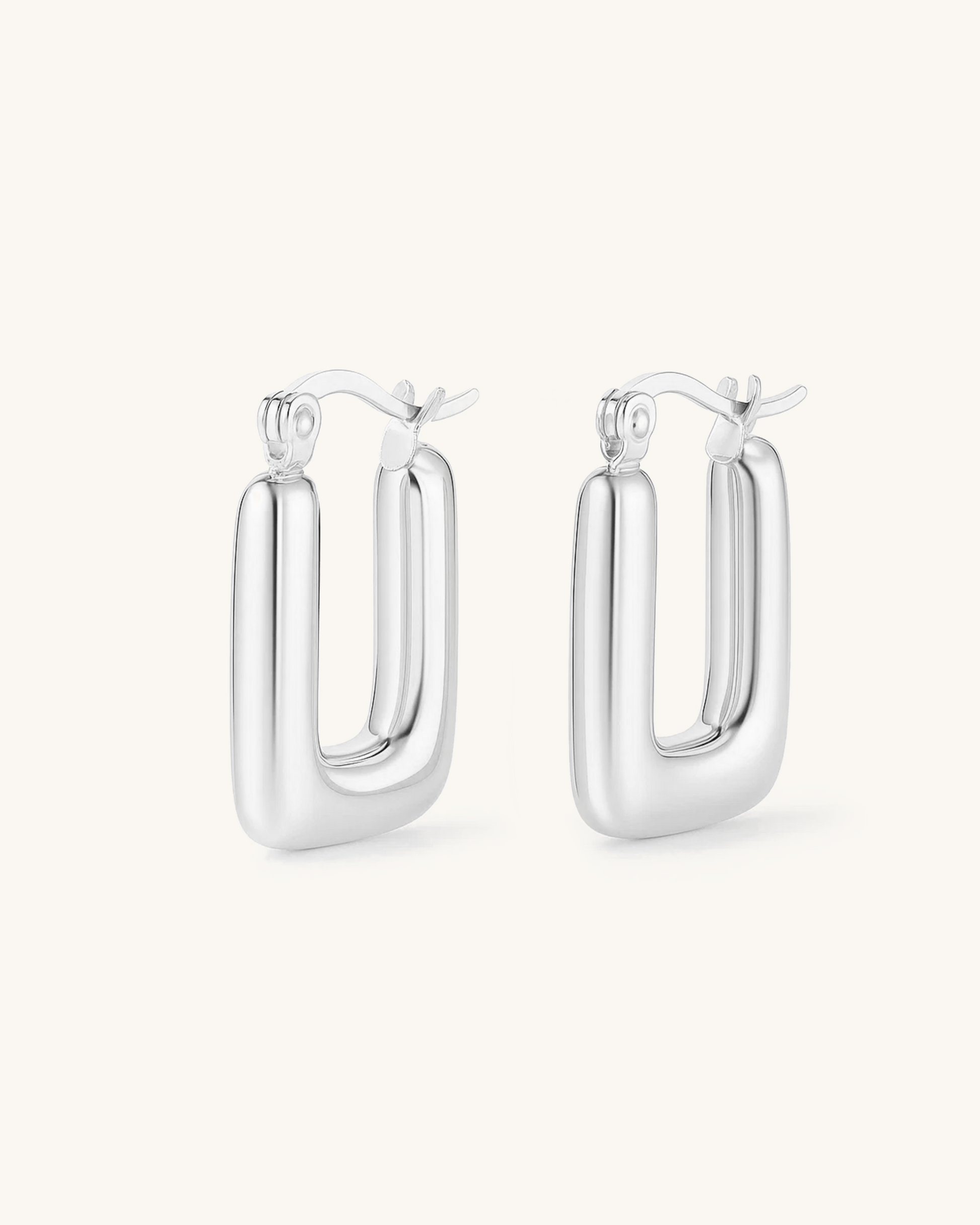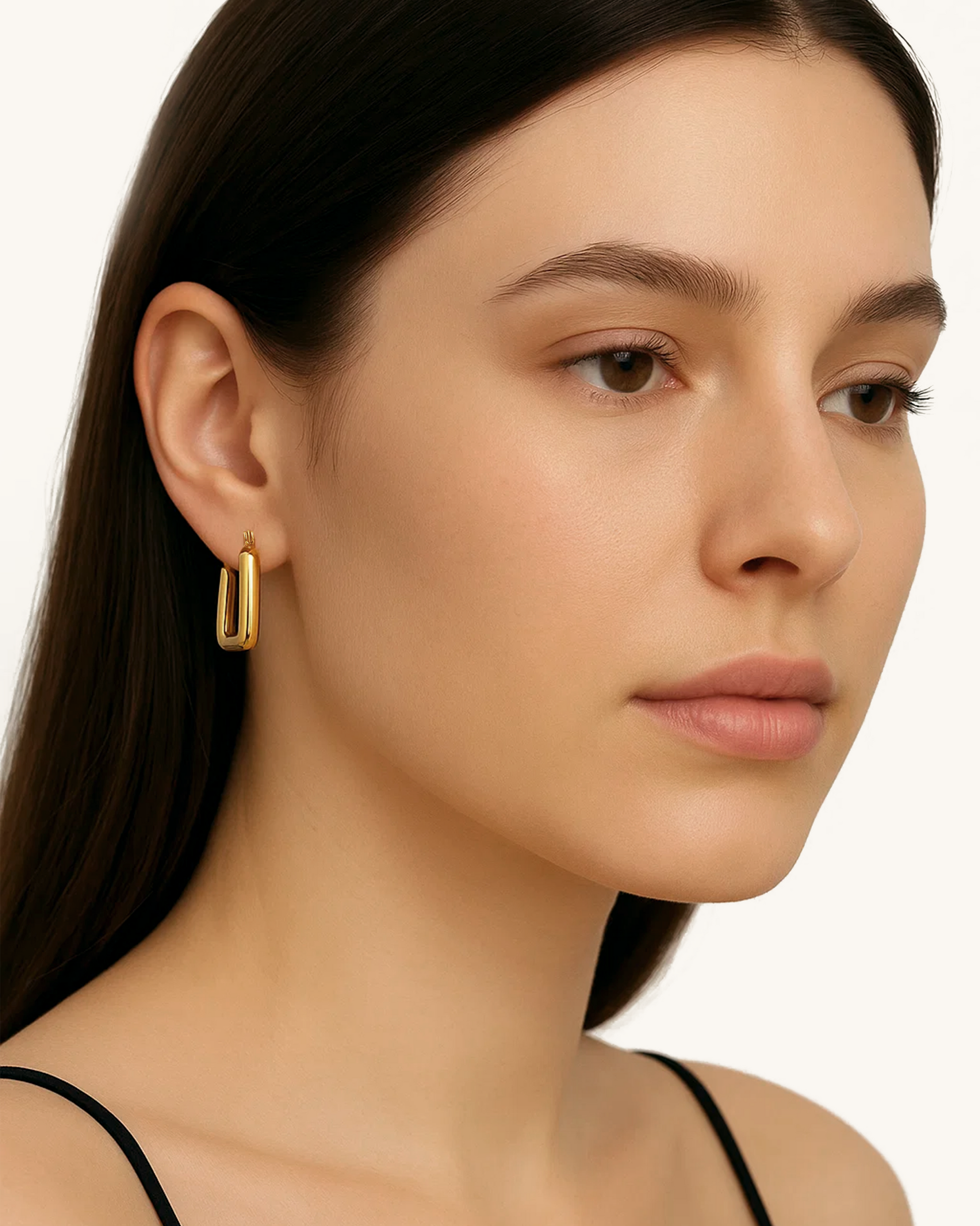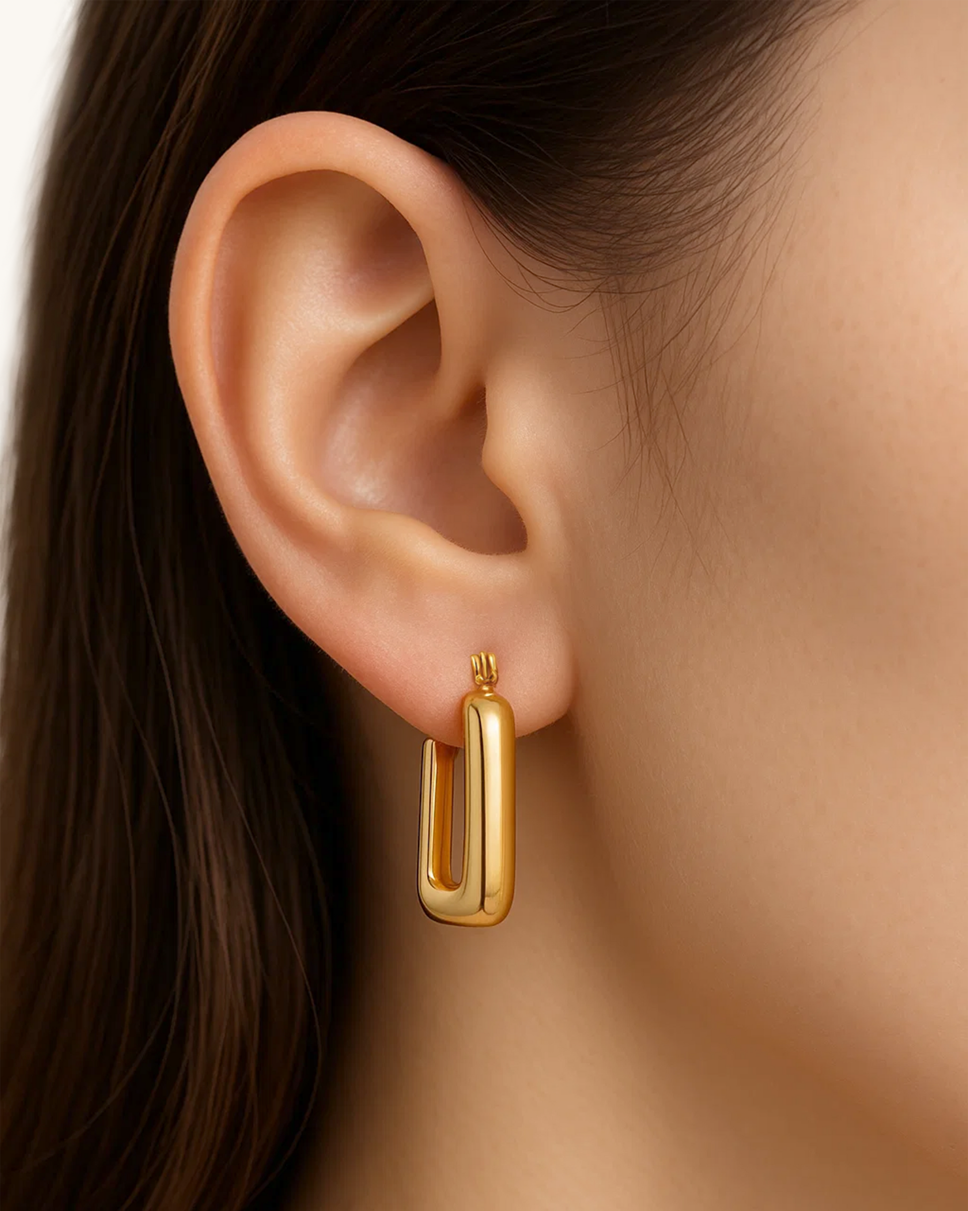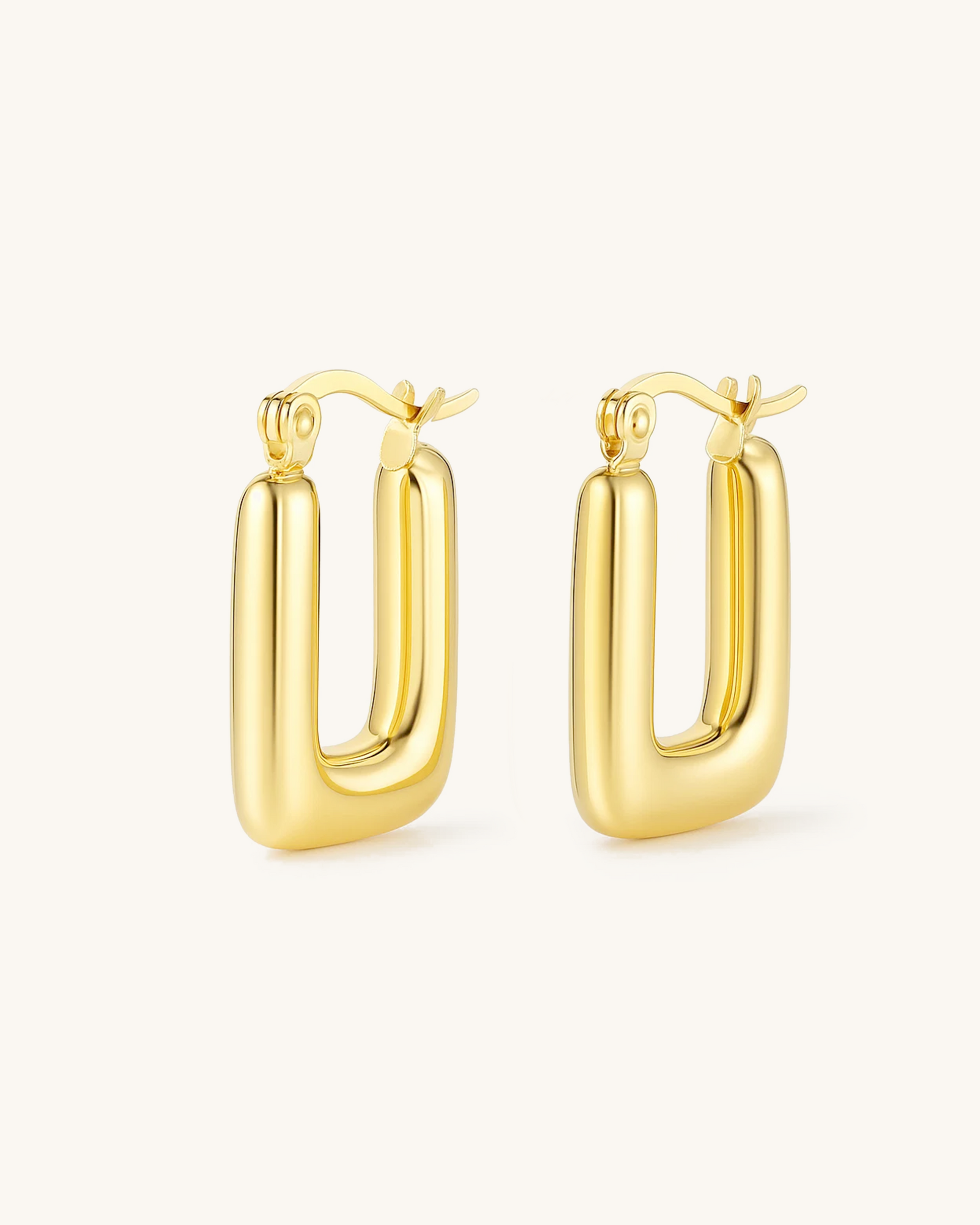 Modern and bold, the U-Shaped Hoop Earrings feature a sculptural open-rectangle silhouette with a smooth, high-polish finish. Crafted from waterproof stainless steel and plated in radiant 18K gold, these earrings bring a contemporary edge to any look—perfect for everyday styling or elevating a minimal outfit.
